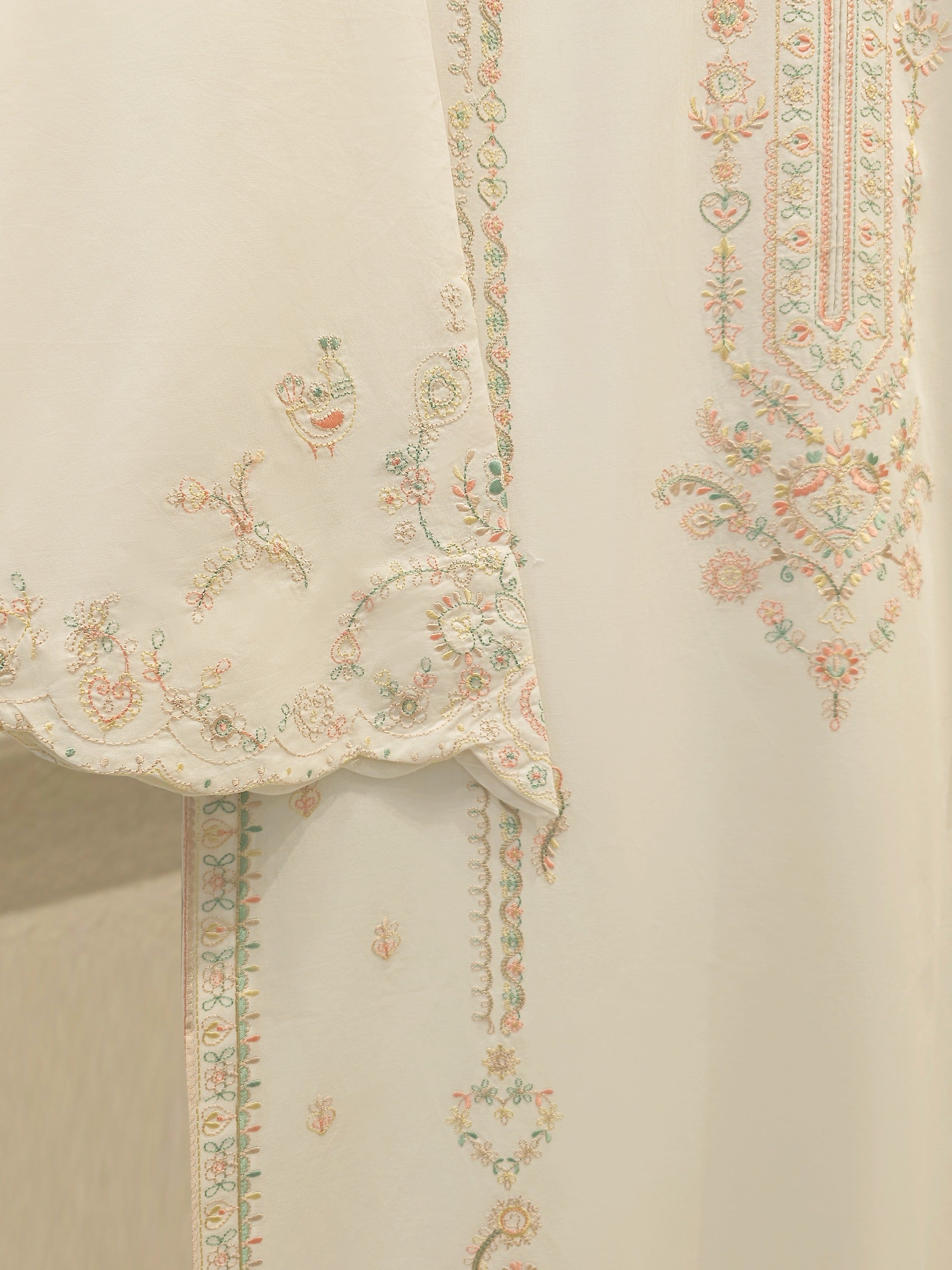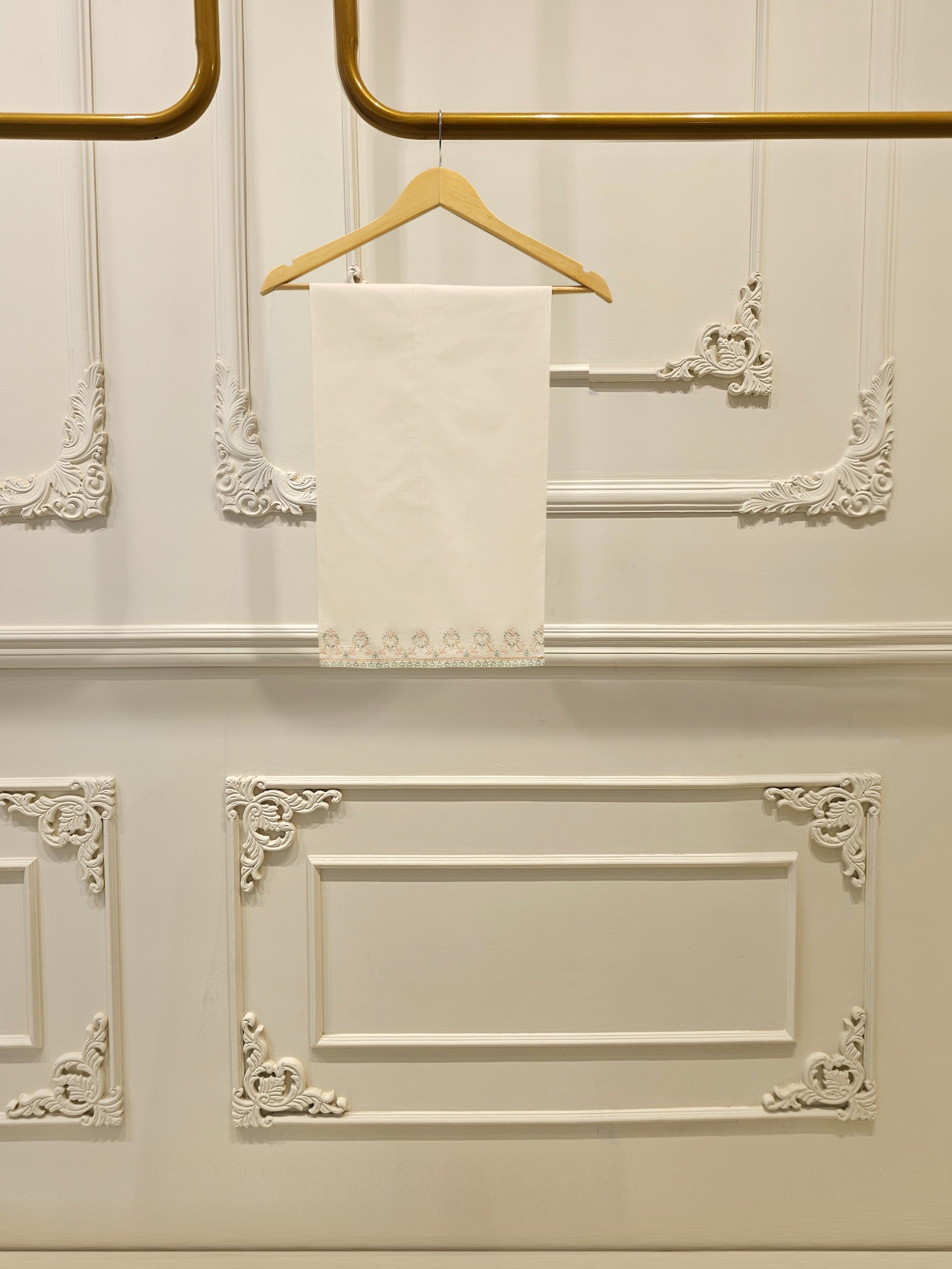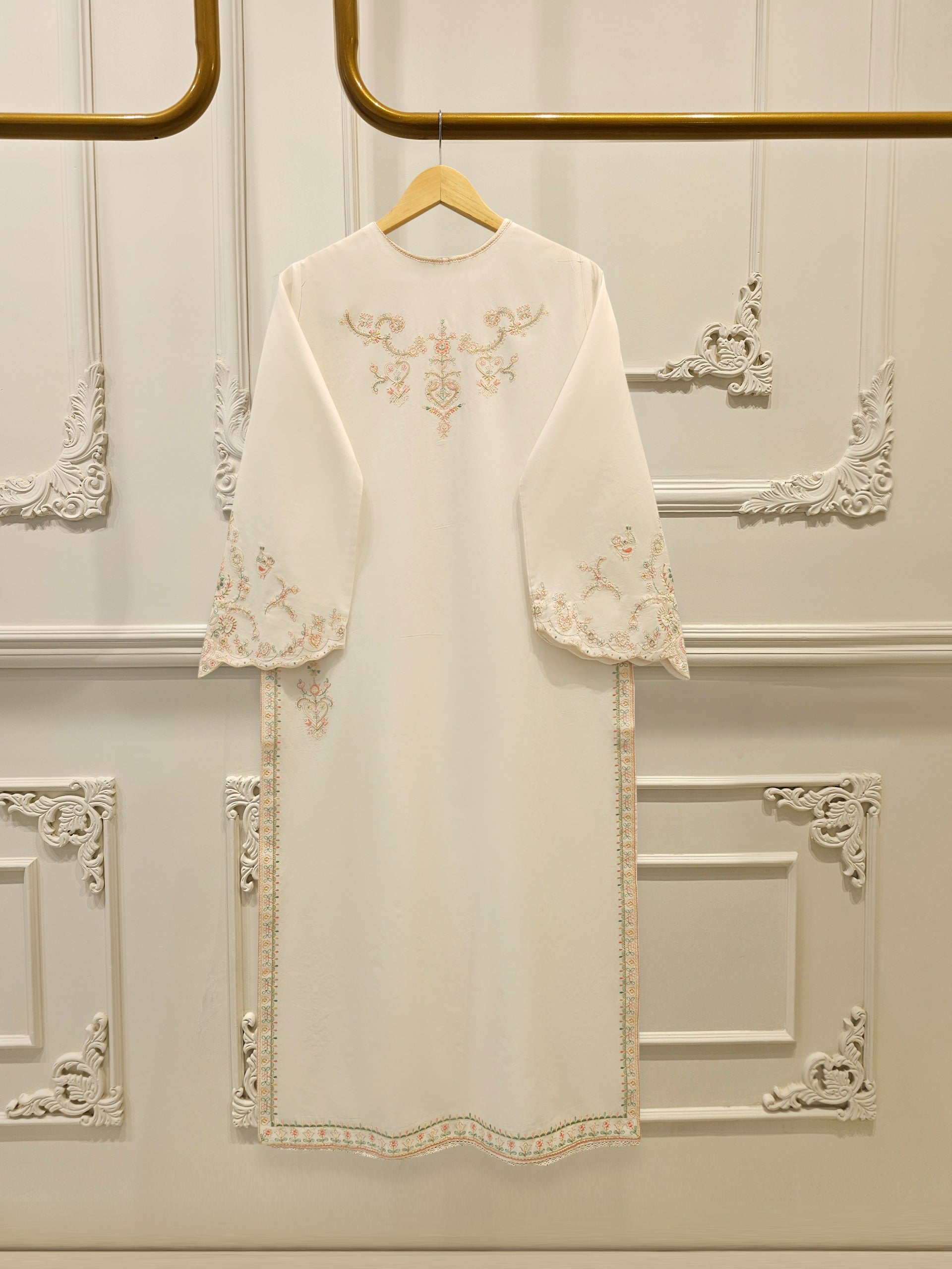 Elevate your summer wardrobe with this beautifully crafted off white cambric shirt, featuring intricate Chikan Kari work on the sleeves and daman. Designed for timeless elegance, this piece blends breathable lawn fabric with traditional craftsmanship, perfect for festive occasions or casual sophistication. Pair it with pants for a complete look.
