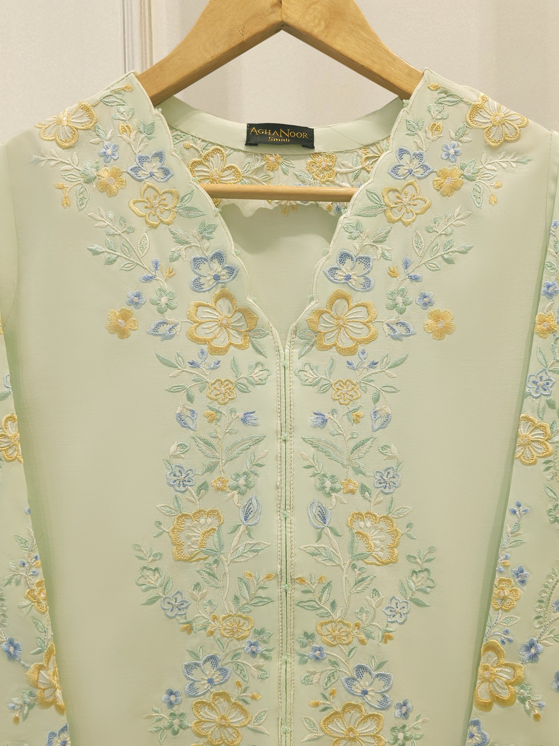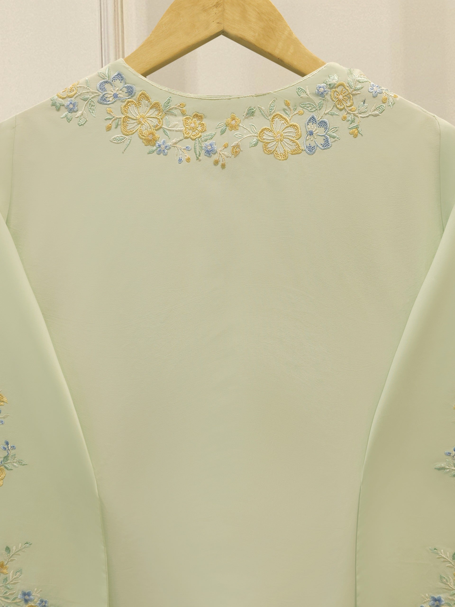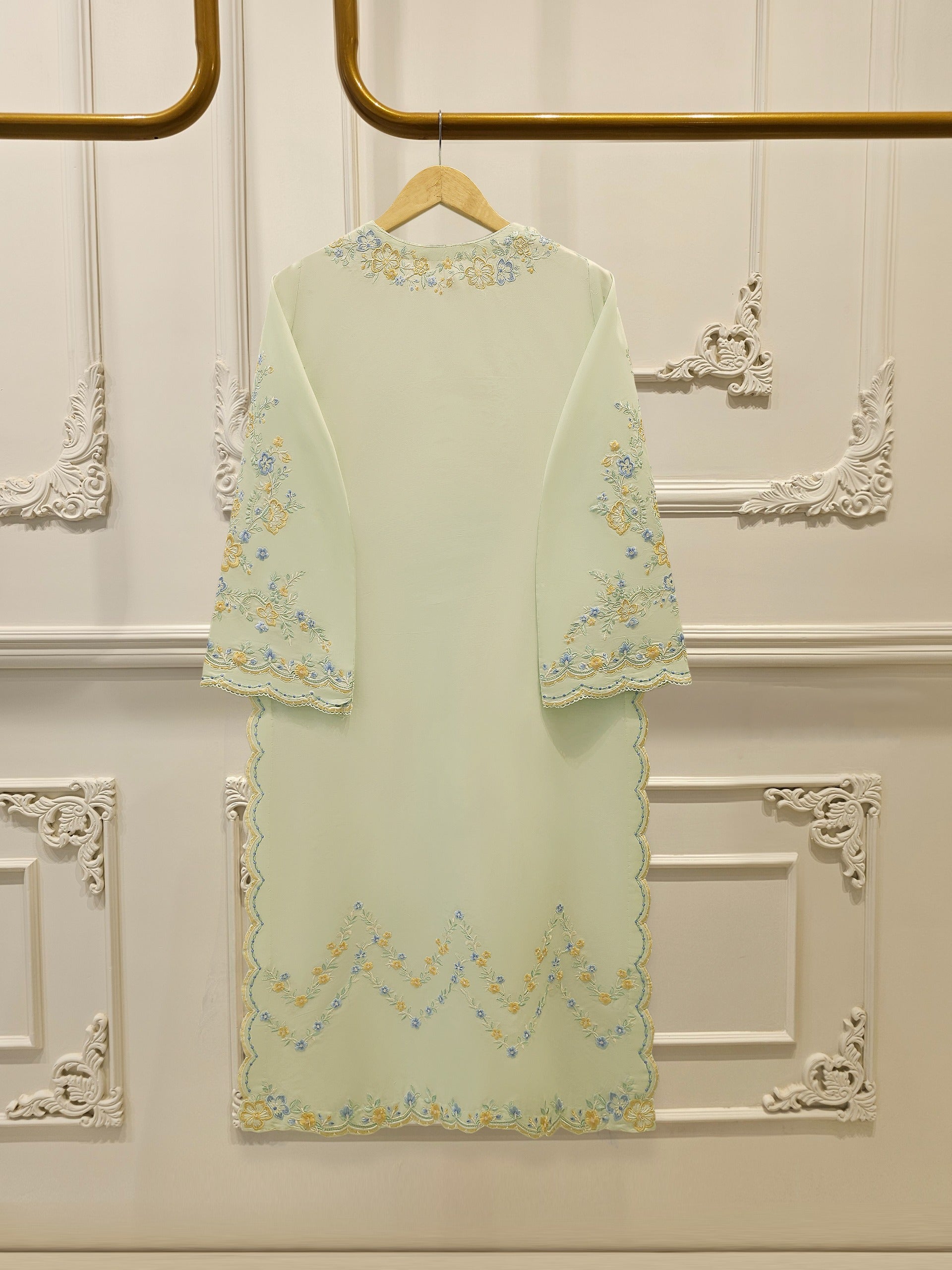 Elevate your summer wardrobe with this beautifully crafted pista green cambric shirt, featuring intricate Chikan Kari work on the sleeves and daman. Designed for timeless elegance, this piece blends breathable lawn fabric with traditional craftsmanship, perfect for festive occasions or casual sophistication. Pair it with pants for a complete look.