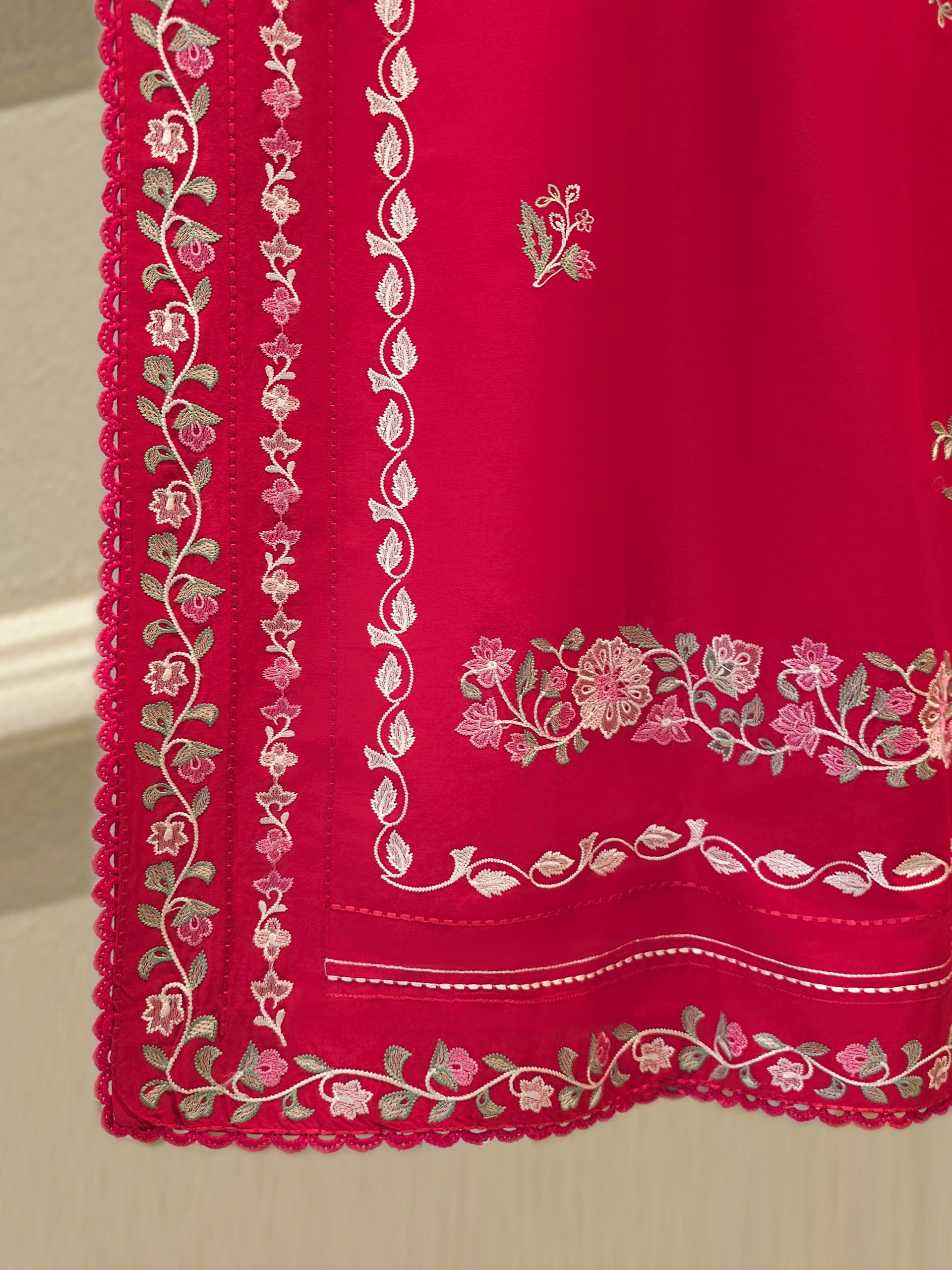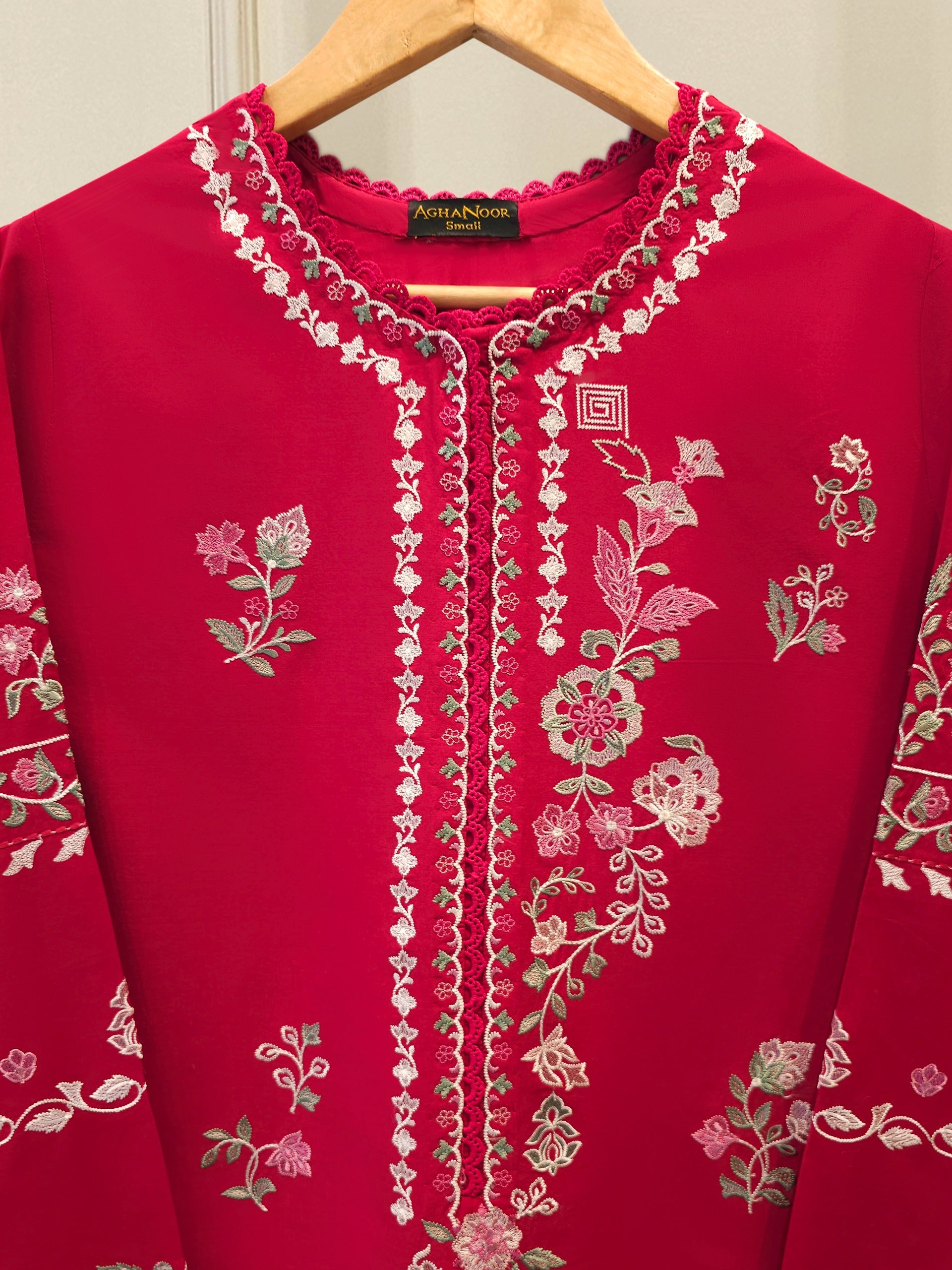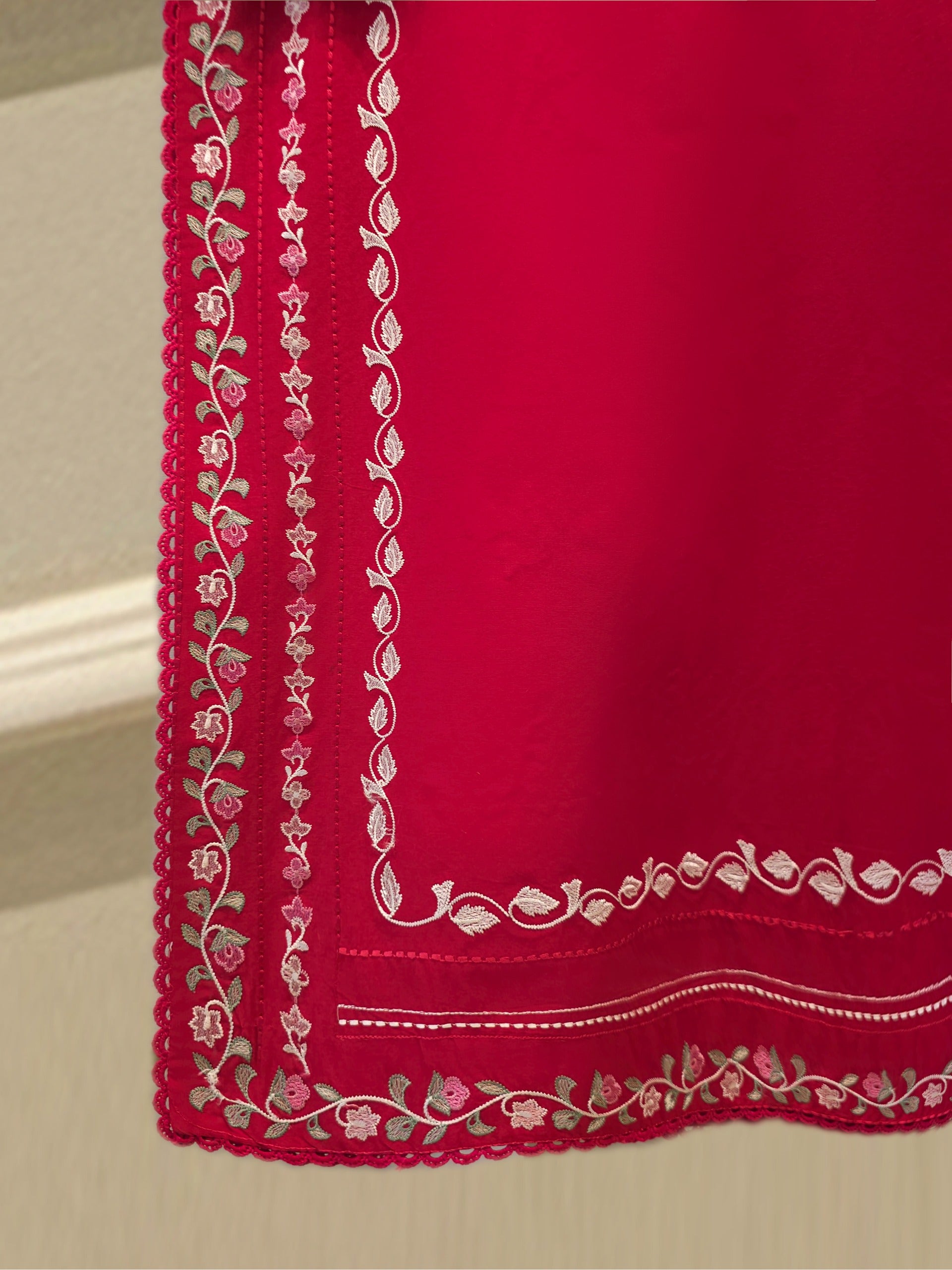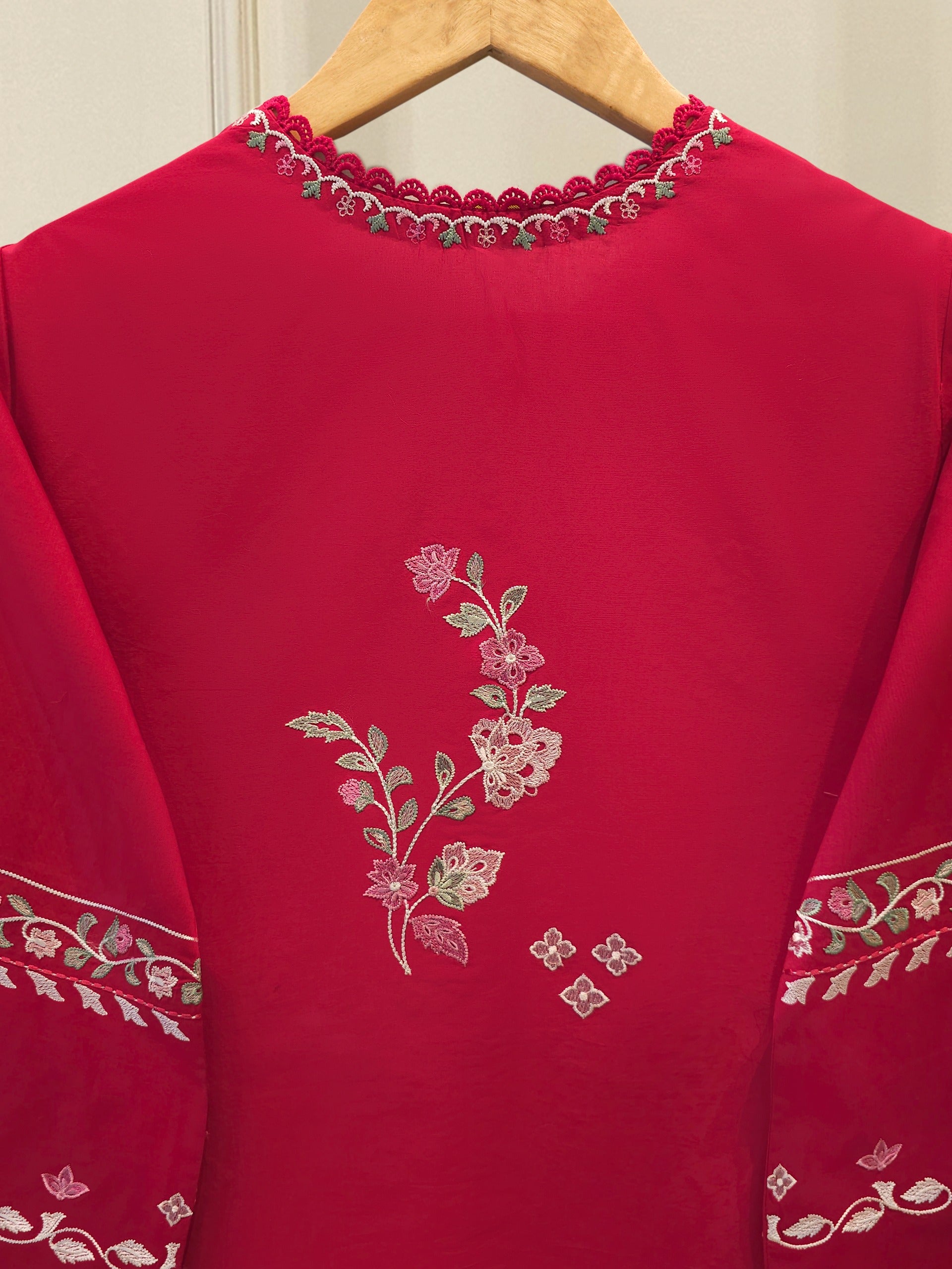 Elevate your summer wardrobe with this beautifully crafted red cambric shirt, featuring intricate Chikan Kari work on the sleeves and daman. Designed for timeless elegance, this piece blends breathable lawn fabric with traditional craftsmanship, perfect for festive occasions or casual sophistication. Pair it with pants for a complete look.