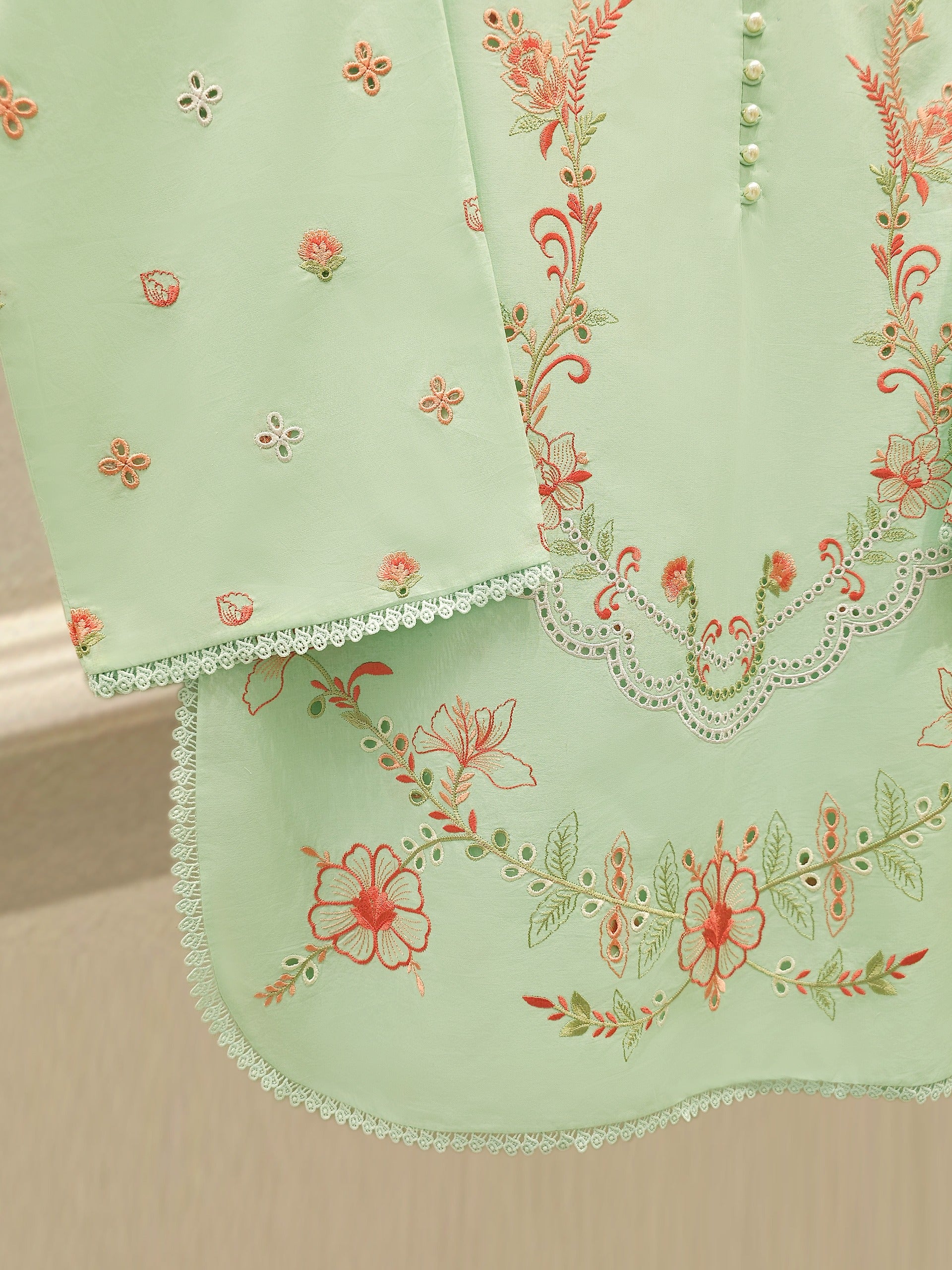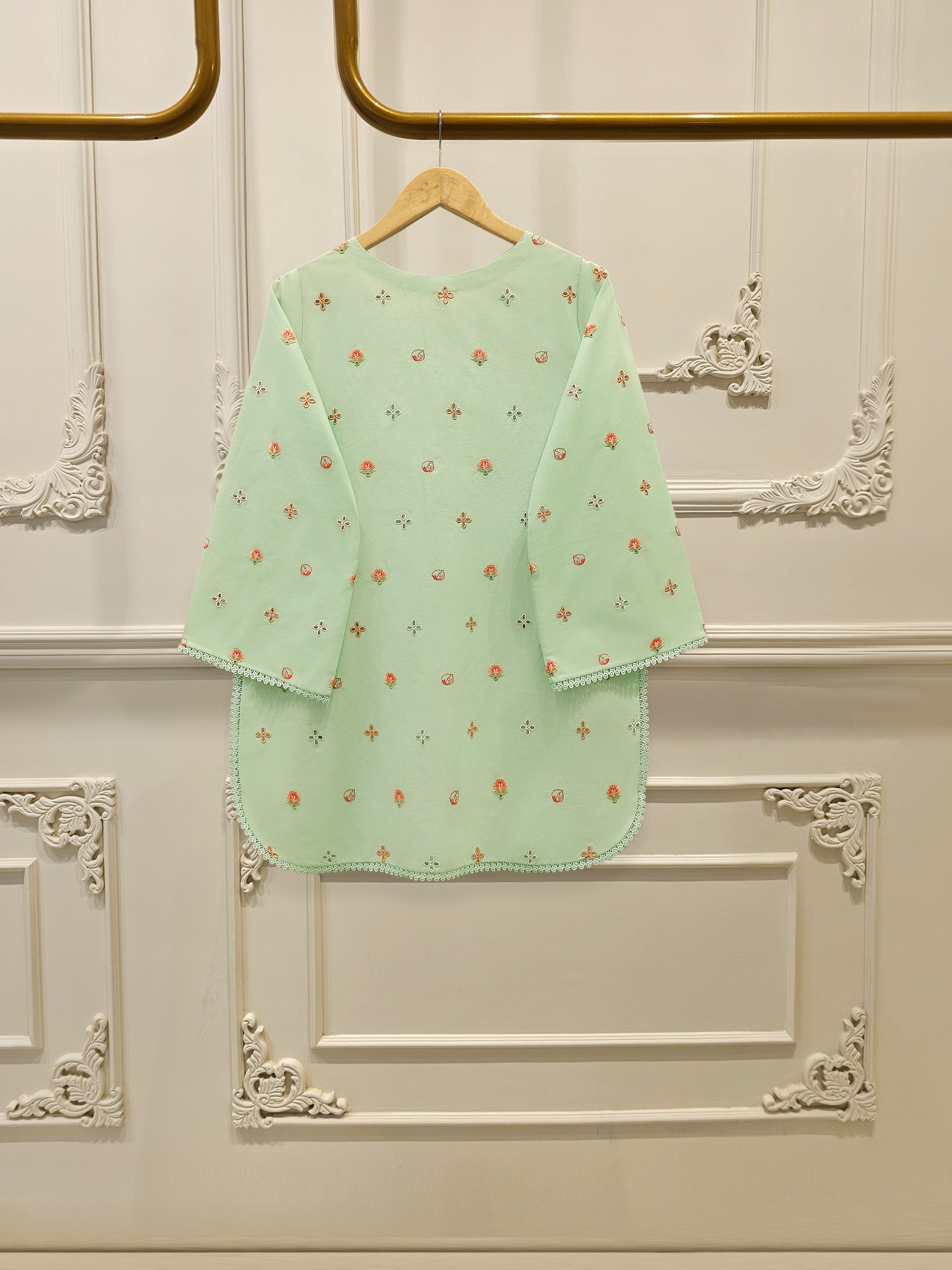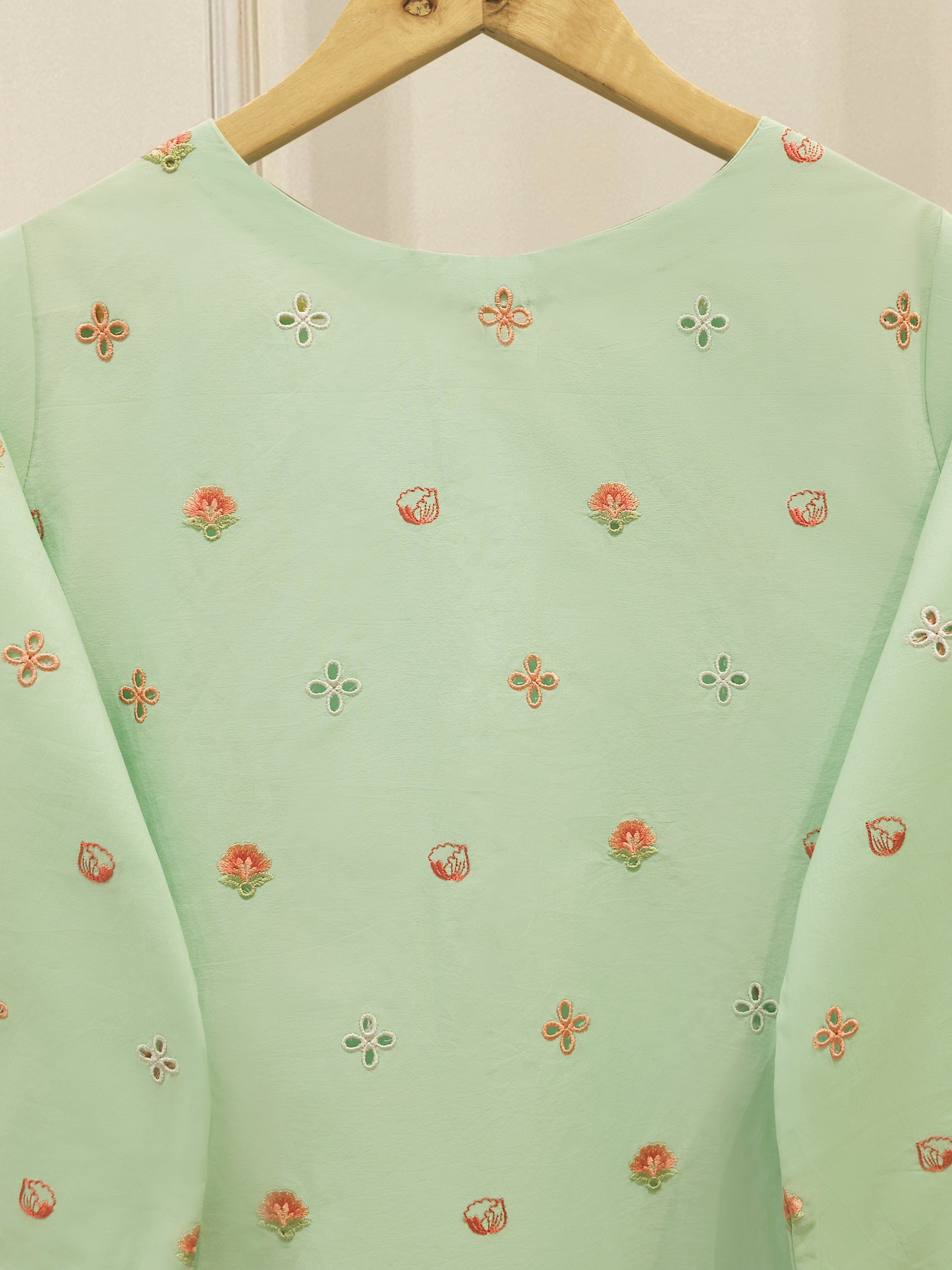 Elevate your summer wardrobe with this beautifully crafted pist green lawn shirt, featuring intricate Chikan Kari work on the sleeves and daman. Designed for timeless elegance, this piece blends breathable lawn fabric with traditional craftsmanship, perfect for festive occasions or casual sophistication. Pair it with pants for a complete look.