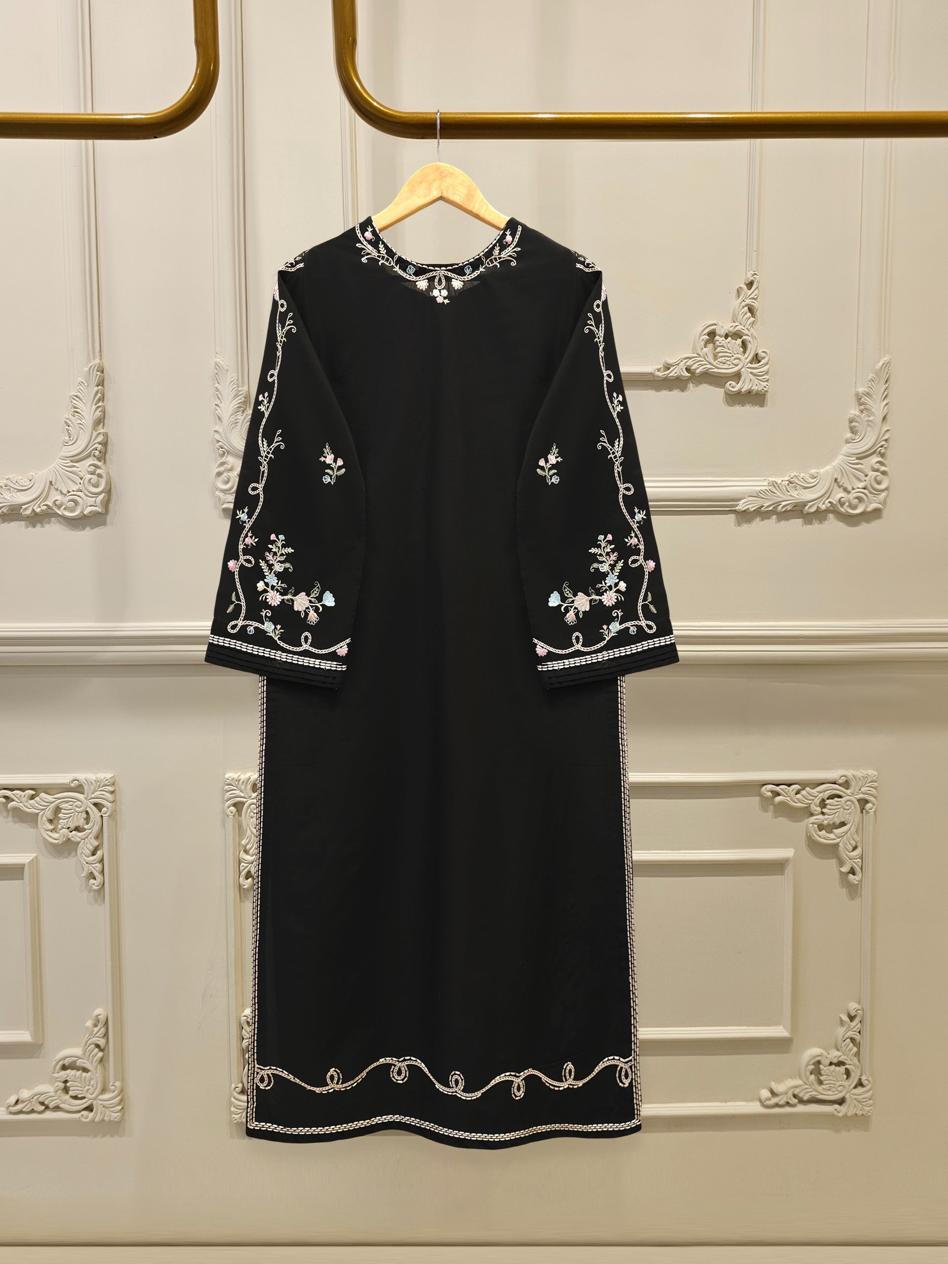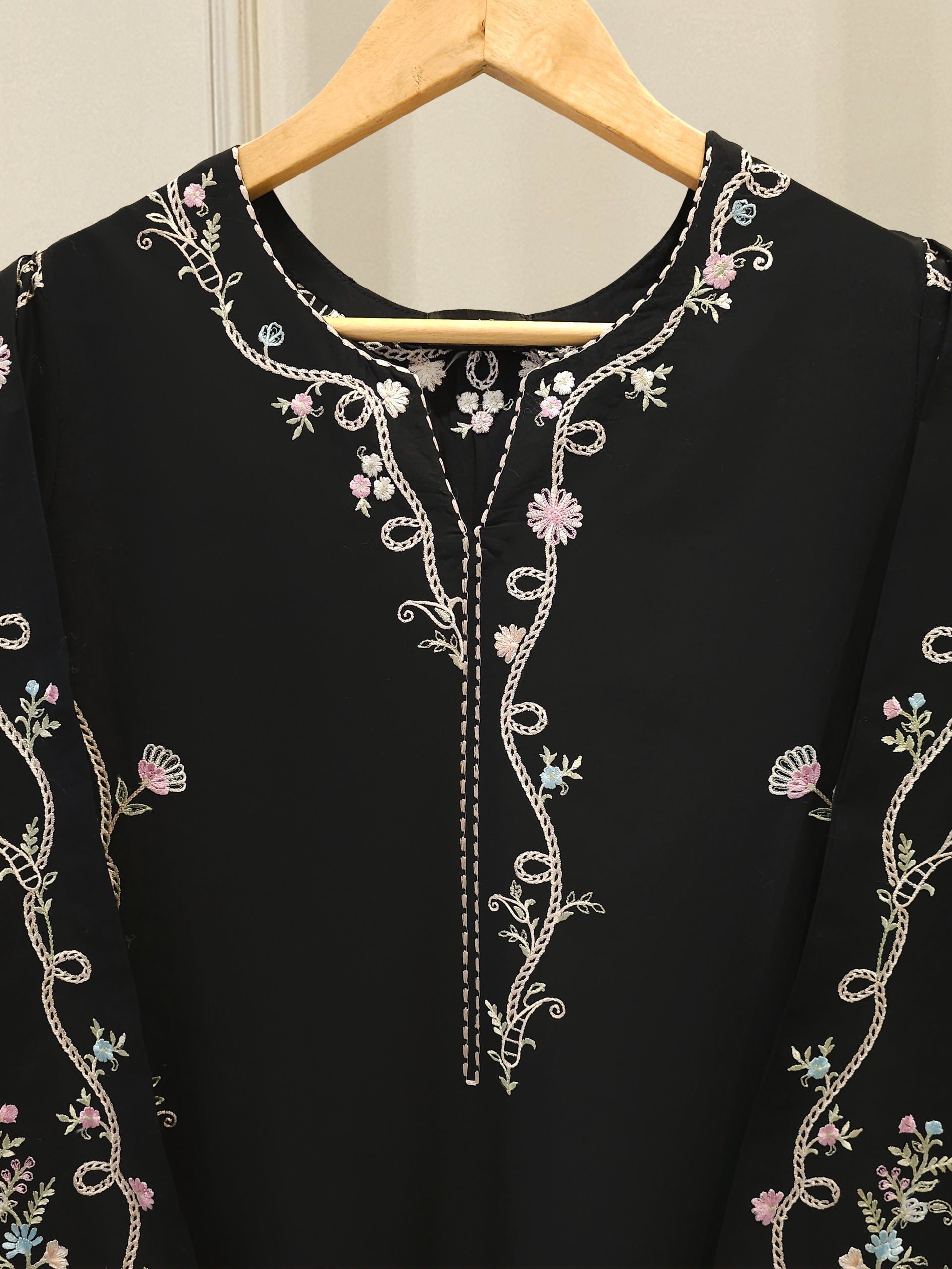 Elevate your summer wardrobe with this beautifully crafted black cambric shirt, featuring intricate Chikan Kari work on the sleeves and daman. Designed for timeless elegance, this piece blends breathable lawn fabric with traditional craftsmanship, perfect for festive occasions or casual sophistication. Pair it with pants for a complete look.