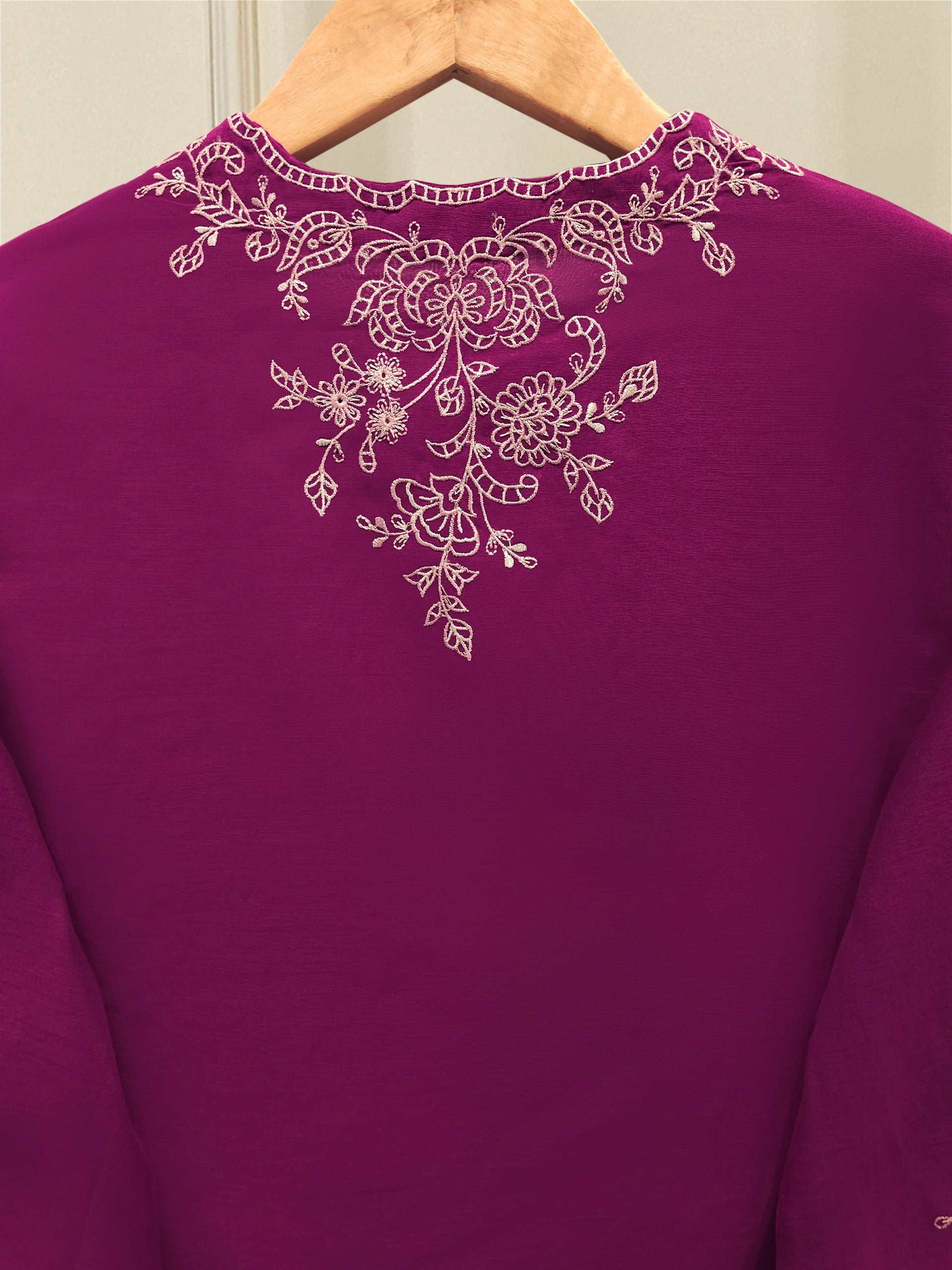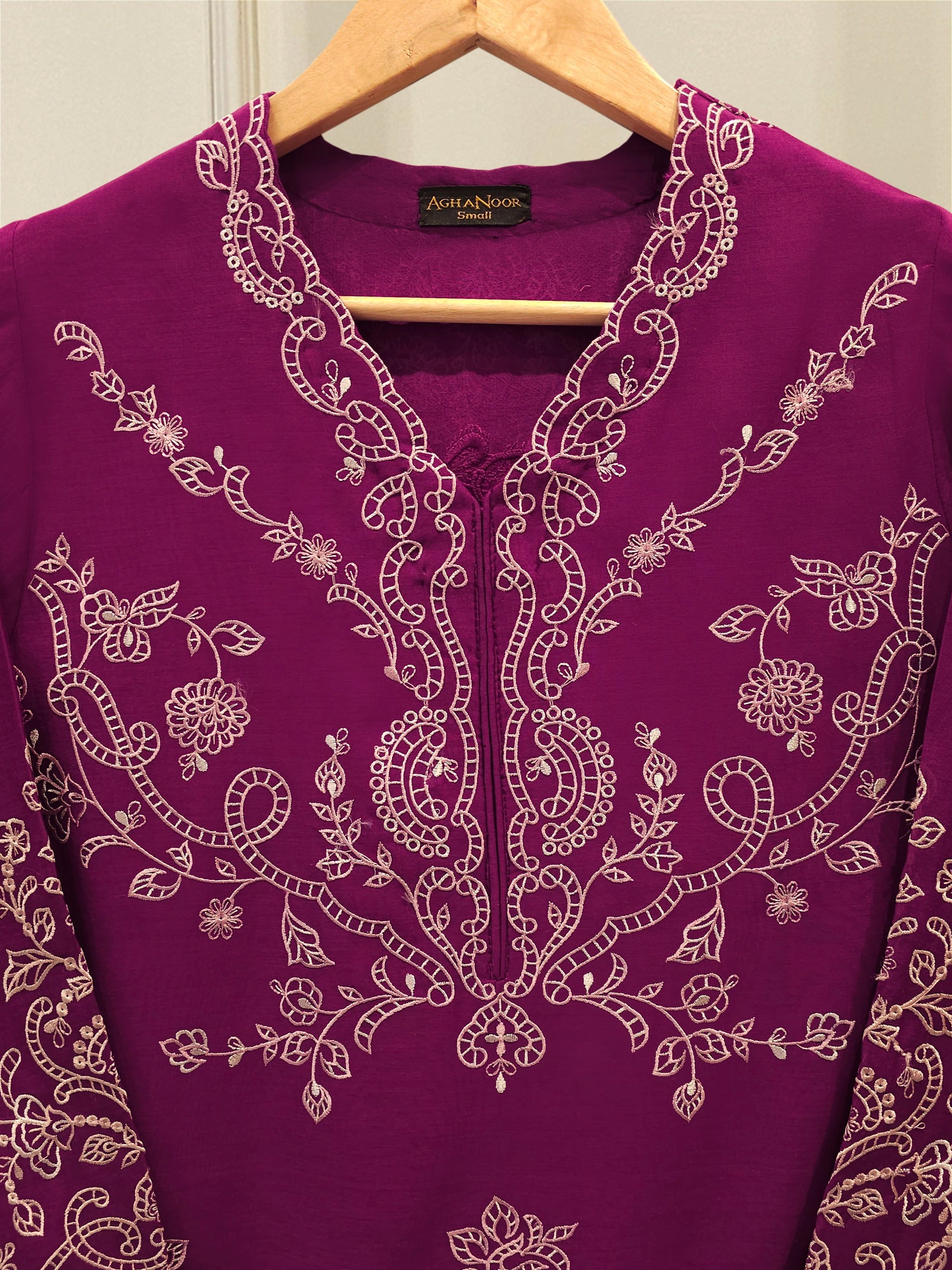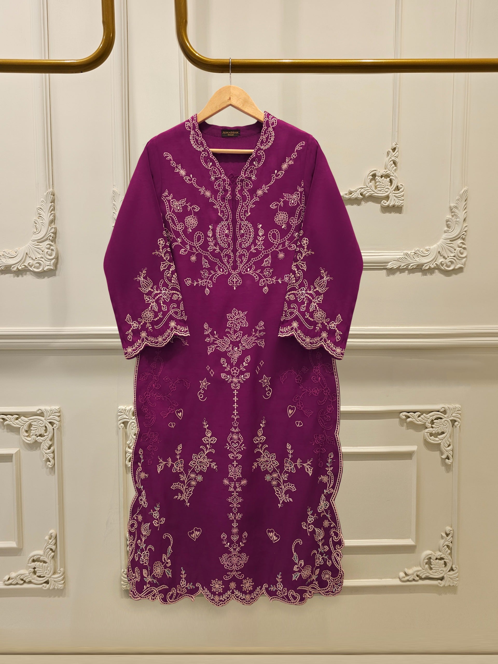 Elevate your summer wardrobe with this beautifully crafted purple kora cotton shirt, featuring intricate Chikan Kari work on the sleeves and daman. Designed for timeless elegance, this piece blends breathable lawn fabric with traditional craftsmanship, perfect for festive occasions or casual sophistication. Pair it with pants for a complete look.