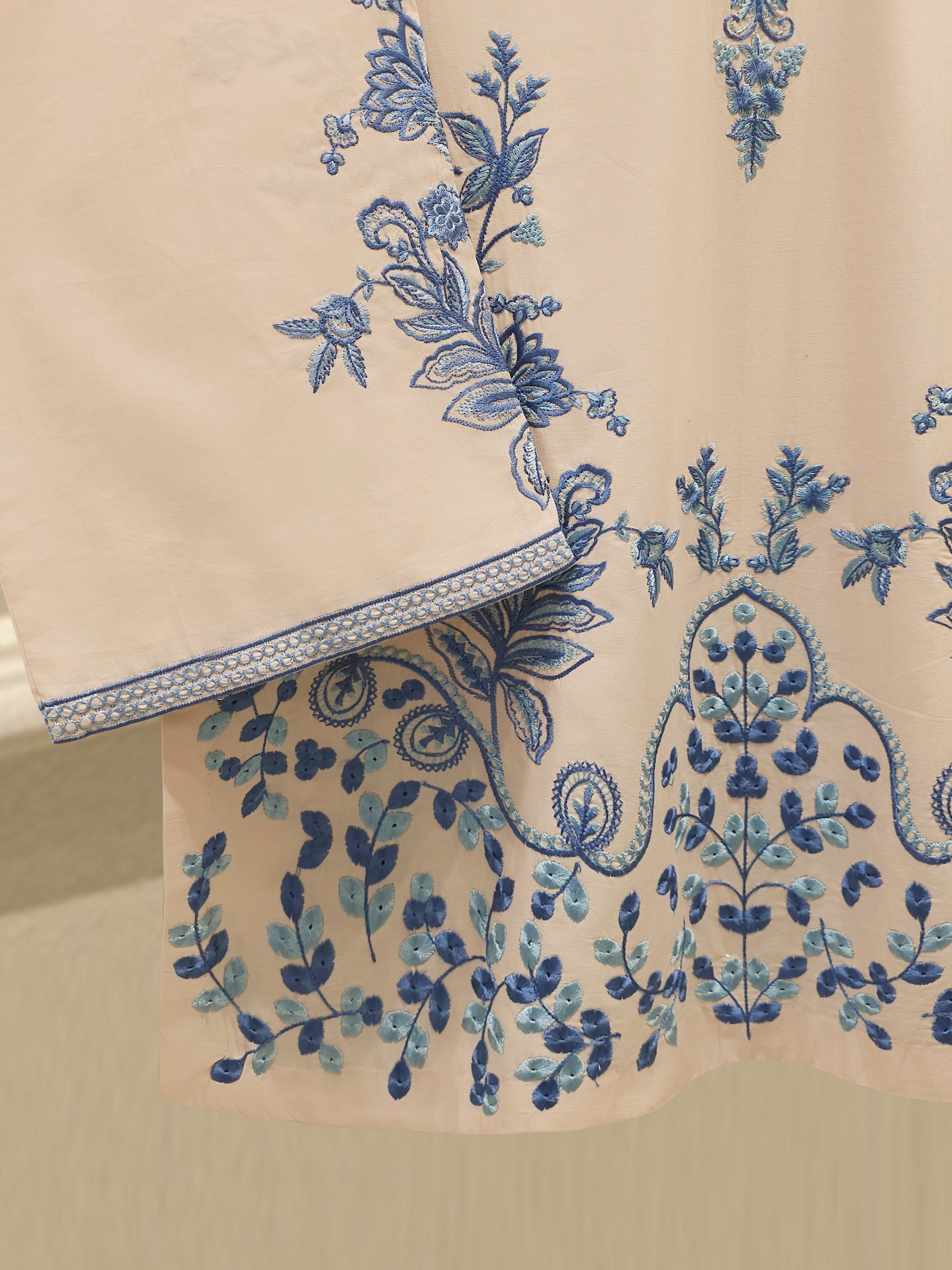 Elevate your summer wardrobe with this beautifully crafted beige cambric shirt, featuring intricate Chikan Kari work on the sleeves and daman. Designed for timeless elegance, this piece blends breathable lawn fabric with traditional craftsmanship, perfect for festive occasions or casual sophistication. Pair it with pants for a complete look.