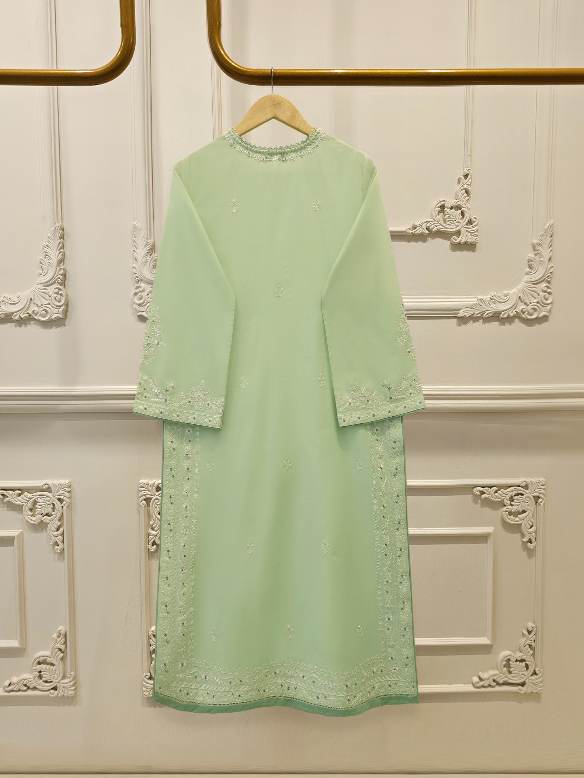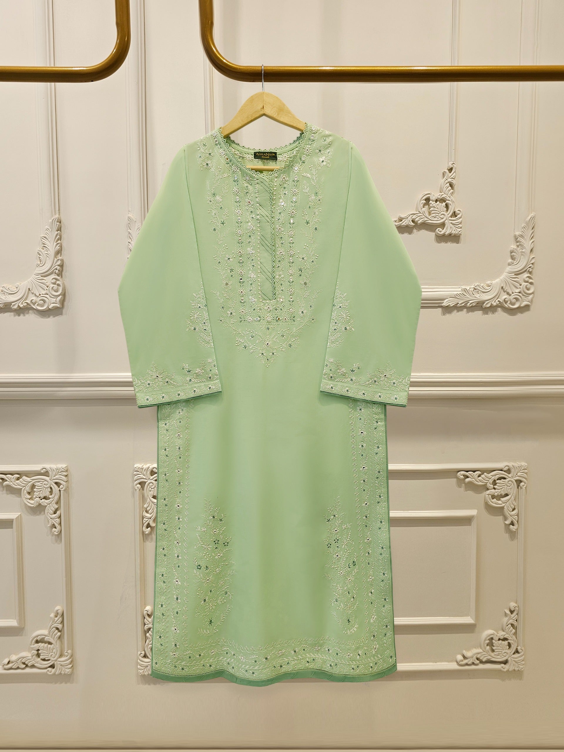 Elevate your summer wardrobe with this beautifully crafted pista green cambric shirt, Designed for timeless elegance, this piece blends breathable lawn fabric with traditional craftsmanship, perfect for festive occasions or casual sophistication. Pair it with shalwr for a complete look.