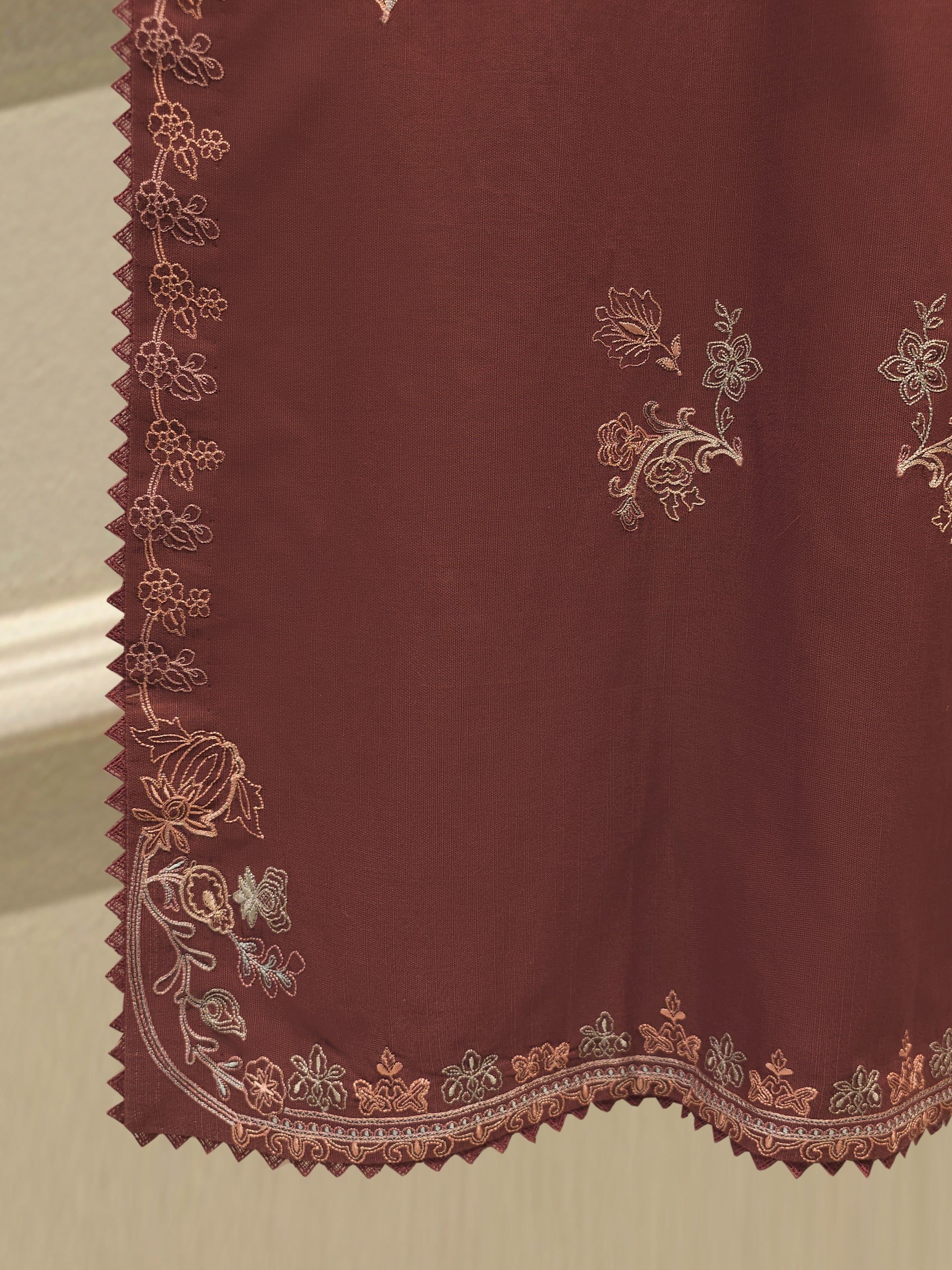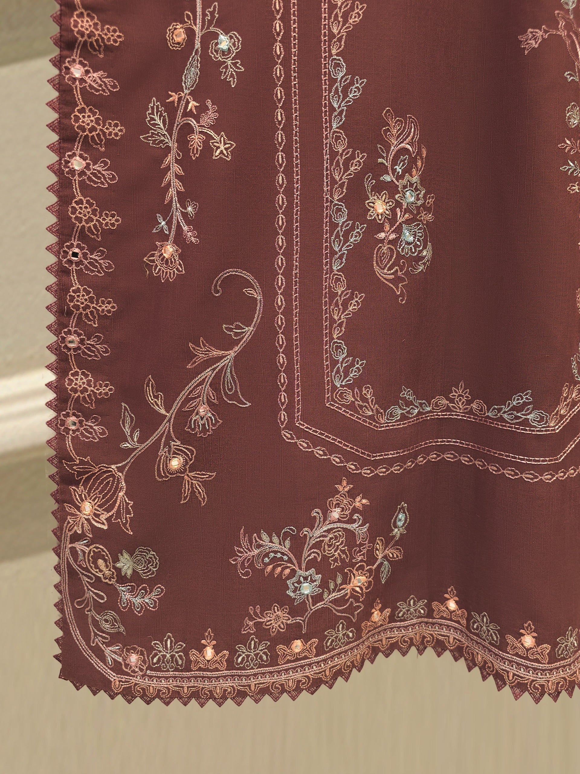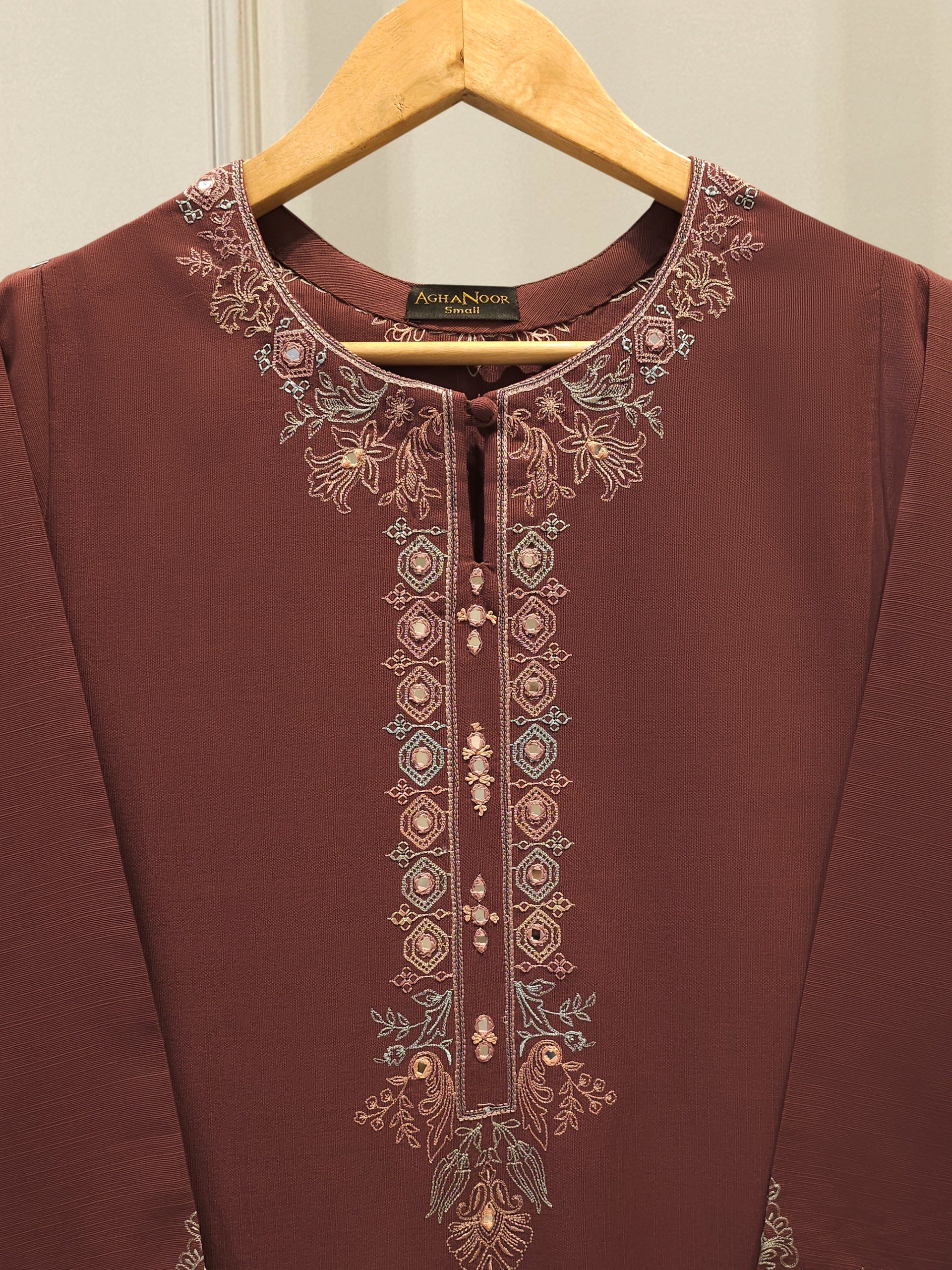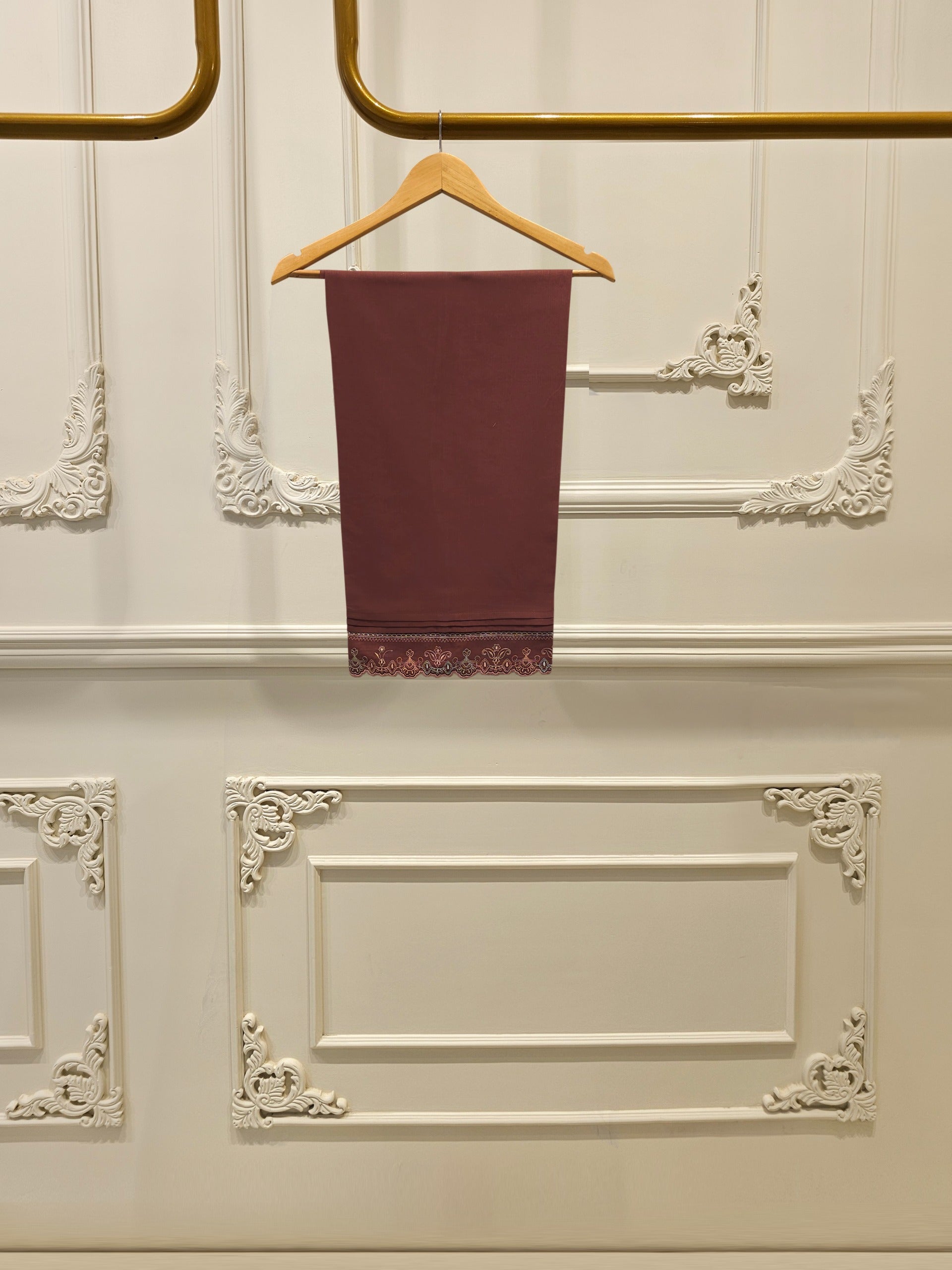 Brown embroidered khaddar suit features a rich, traditional design on a warm, textured fabric ideal for cooler weather. The intricate embroidery add a touch of elegance, while the soft yet durable khaddar material ensures comfort and style for everyday wear or casual gatherings. Perfect for autumn and winter seasons.