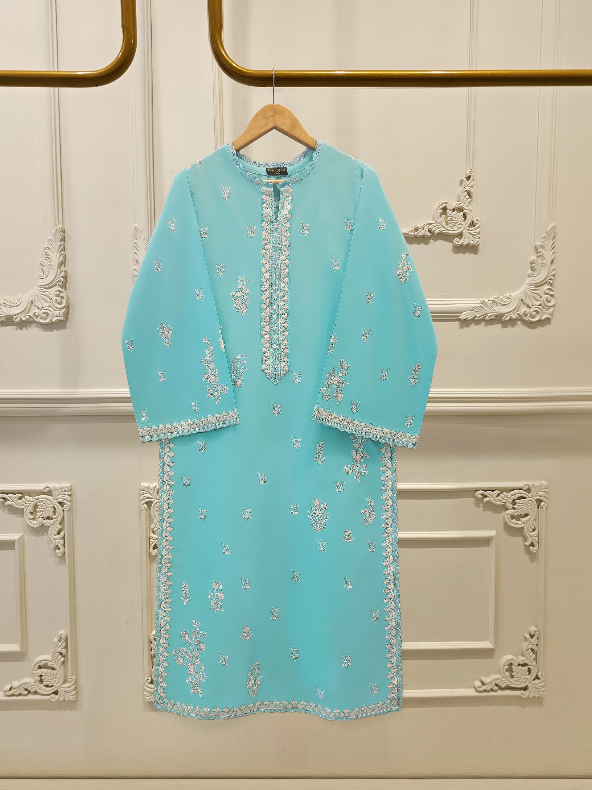 Elevate your summer wardrobe with this beautifully crafted ferozi lawn shirt, featuring intricate Chikan Kari work on the sleeves and daman. Designed for timeless elegance, this piece blends breathable lawn fabric with traditional craftsmanship, perfect for festive occasions or casual sophistication. Pair it with pants for a complete look.