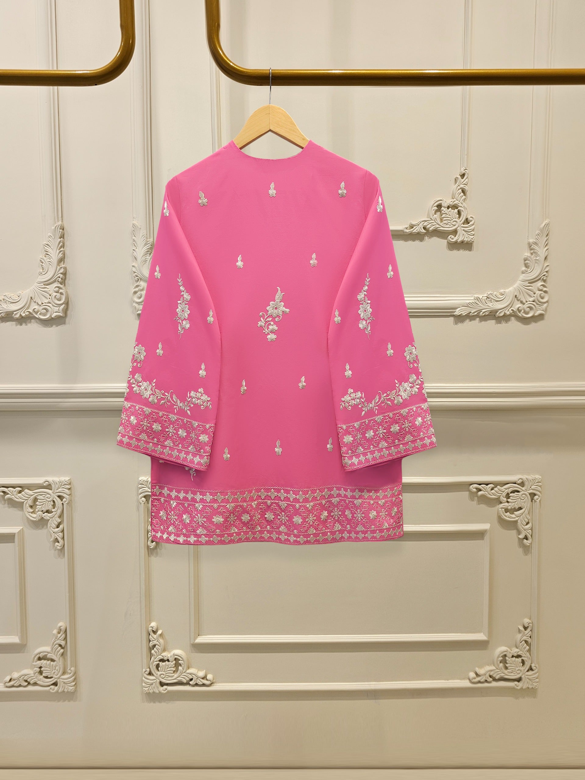 Elevate your summer wardrobe with this beautifully crafted hot pink cambric shirt, featuring intricate Chikan Kari work on the sleeves and daman. Designed for timeless elegance, this piece blends breathable lawn fabric with traditional craftsmanship, perfect for festive occasions or casual sophistication. Pair it with pants for a complete look.