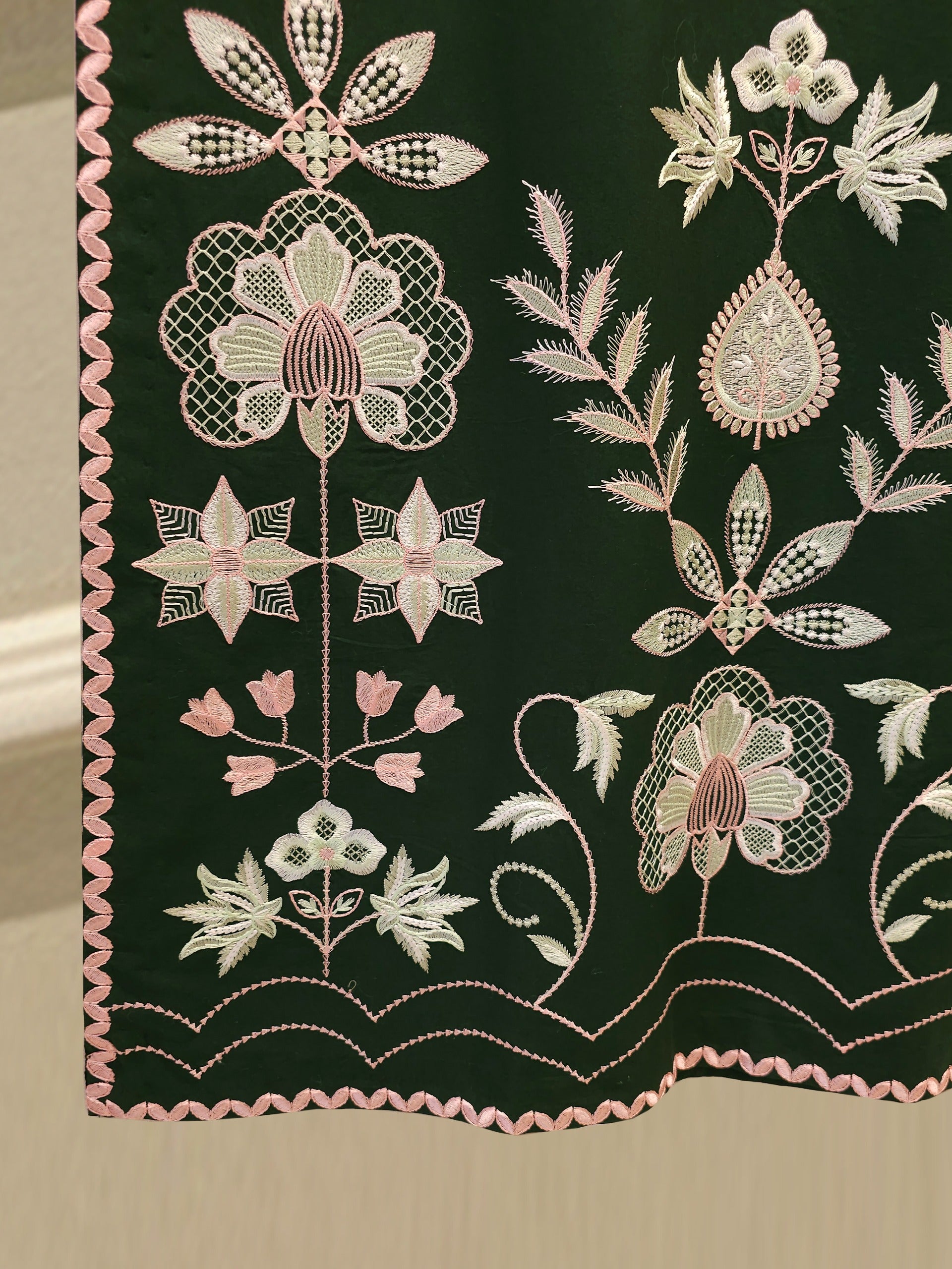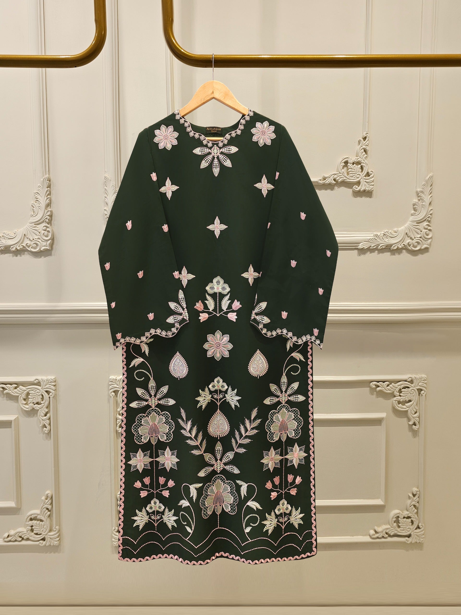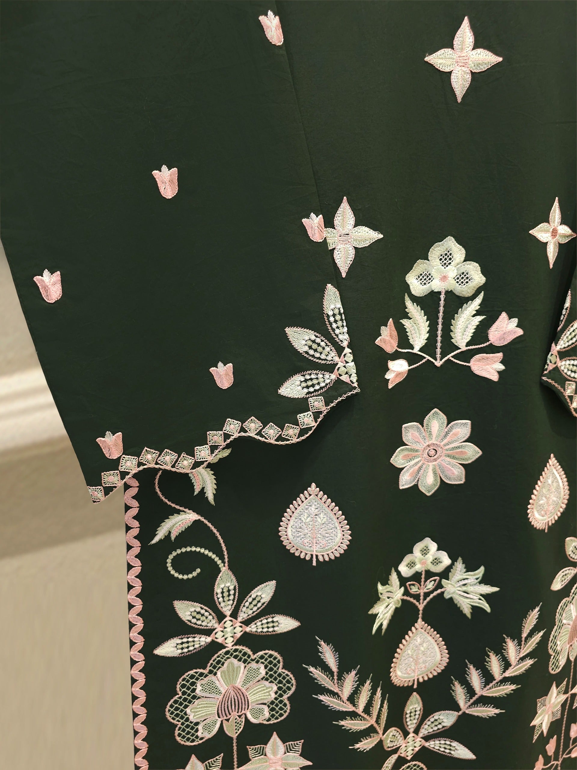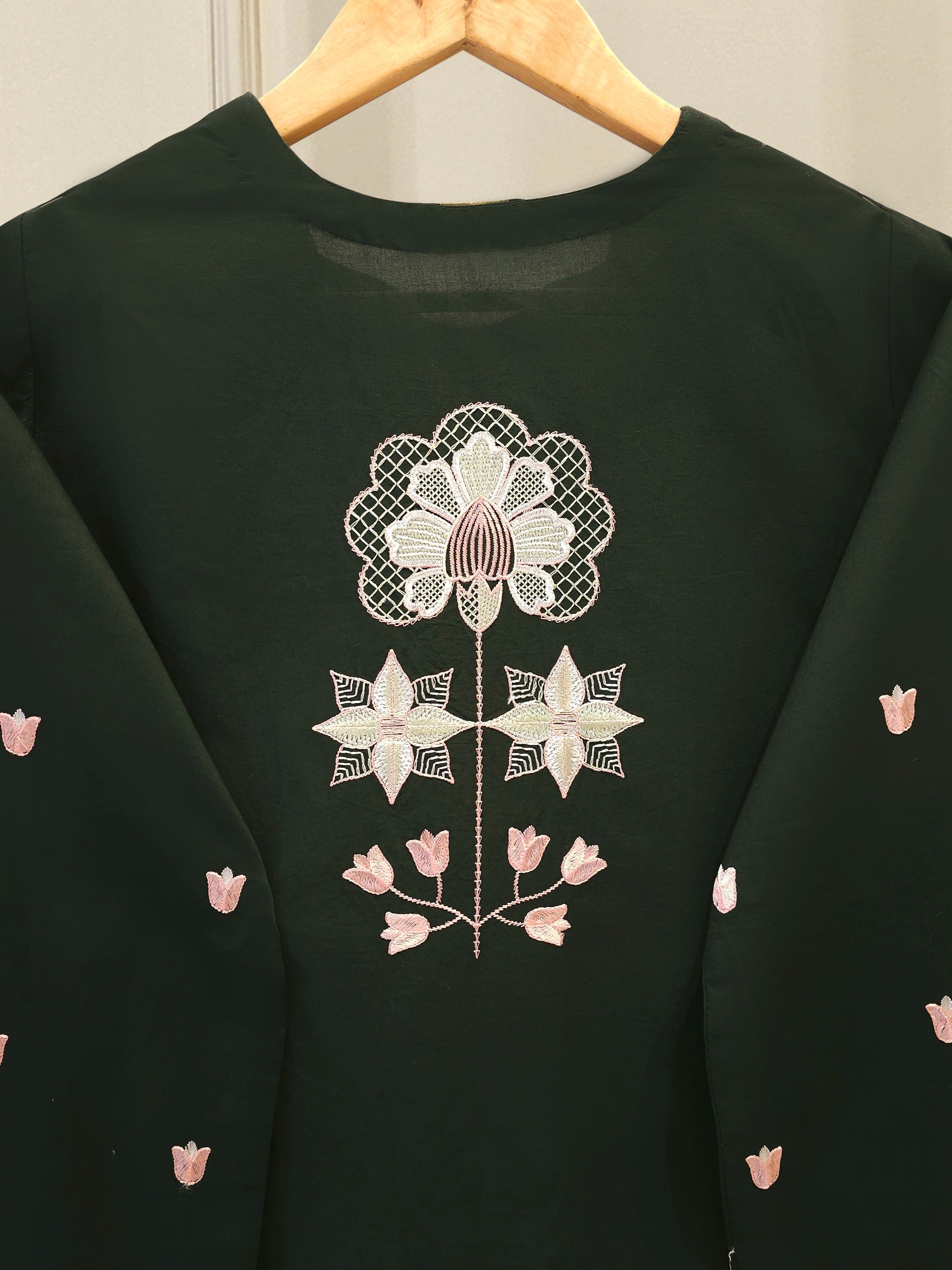 Elevate your summer wardrobe with this beautifully crafted dark green cambric shirt, featuring intricate Chikan Kari work on the sleeves and daman. Designed for timeless elegance, this piece blends breathable lawn fabric with traditional craftsmanship, perfect for festive occasions or casual sophistication. Pair it with dupatta for a complete look.