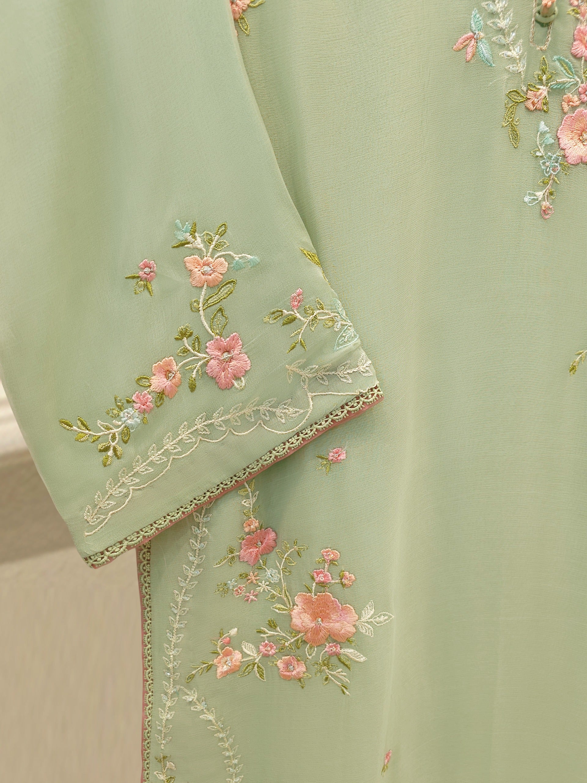 Elevate your style with our green embroidered chiffon straight shirt crafted with utmost care and attention to detail. The shirt features intricate embroidery on the front and sleeves, adding a touch of timeless charm.