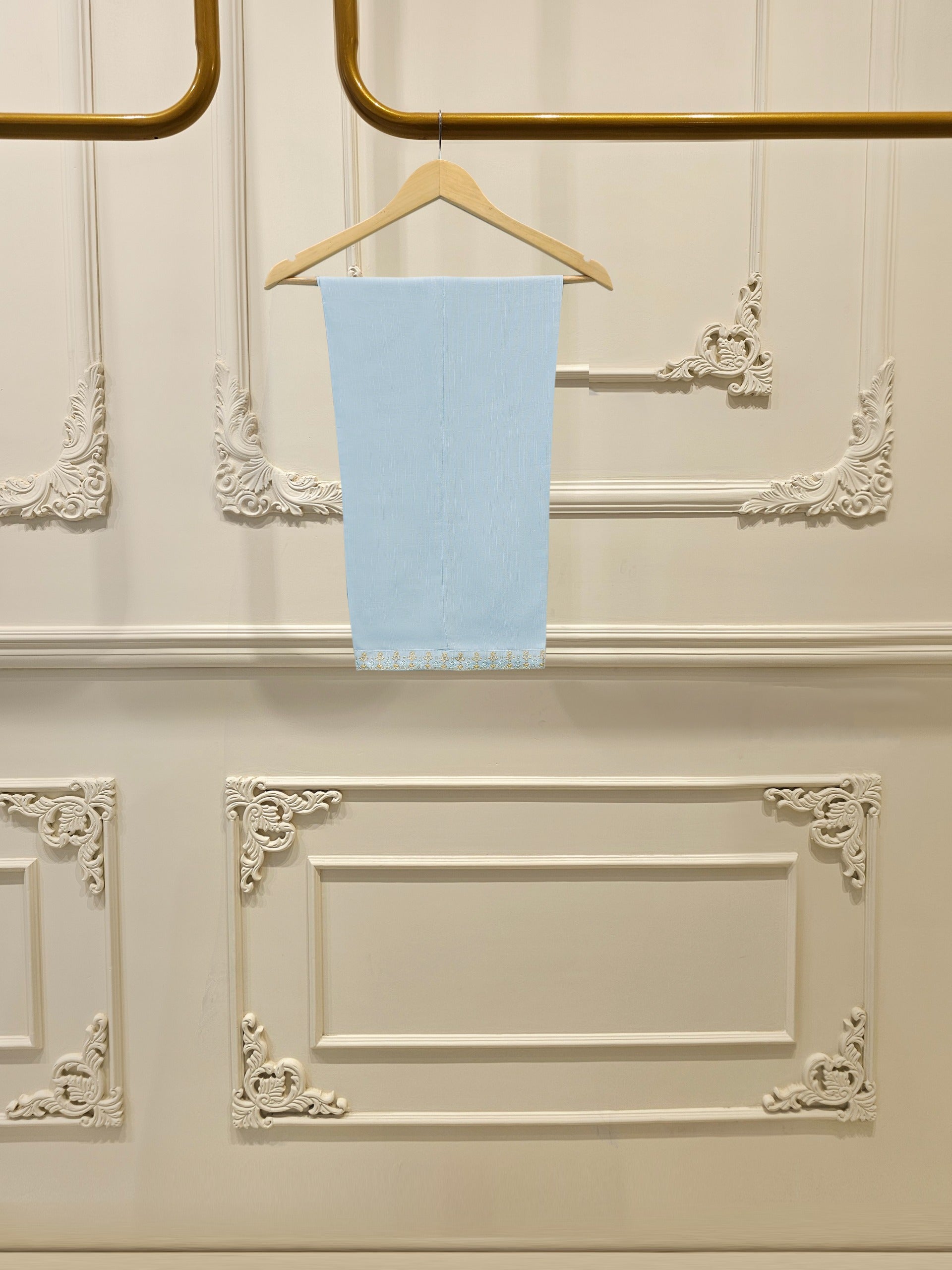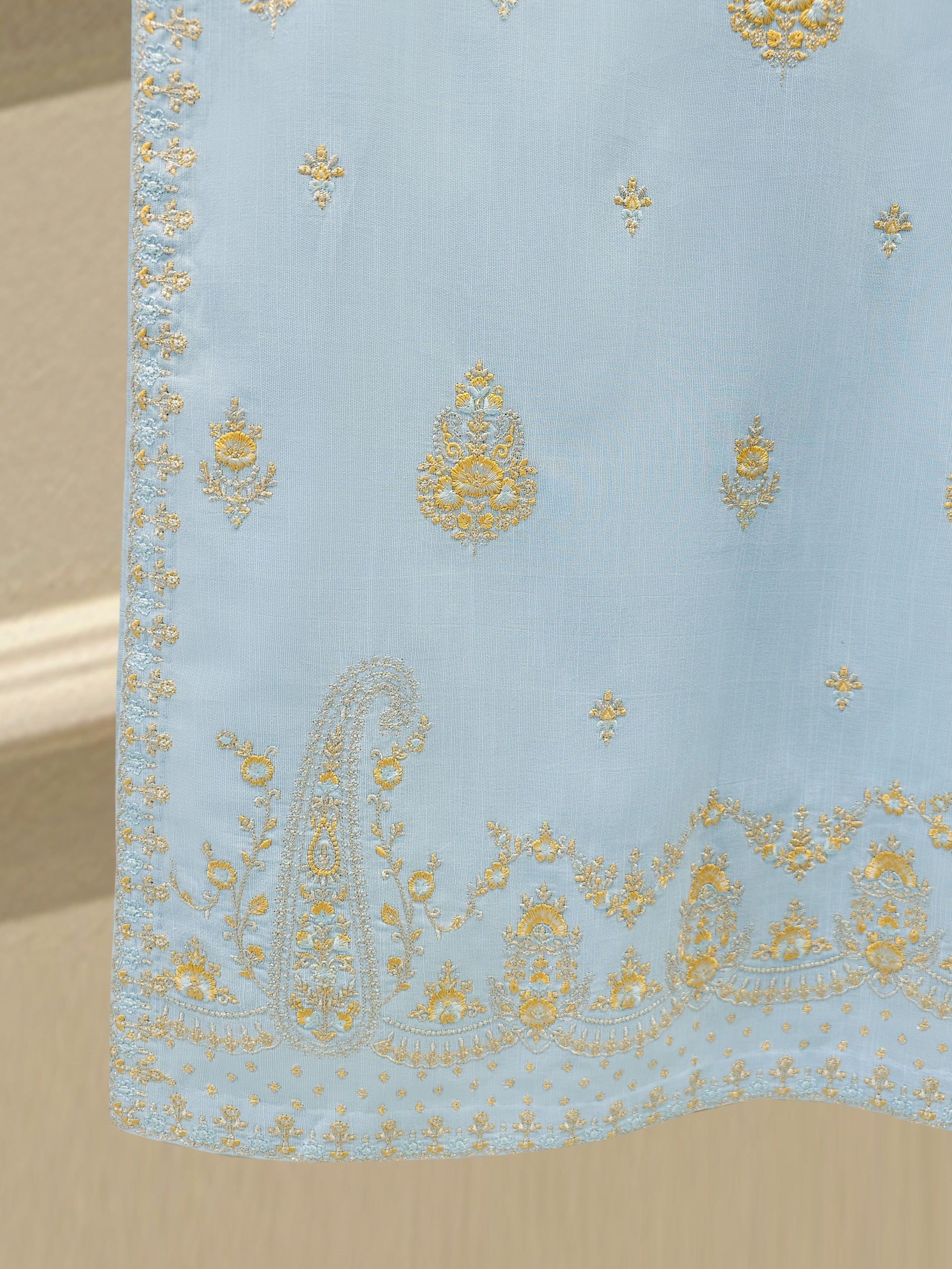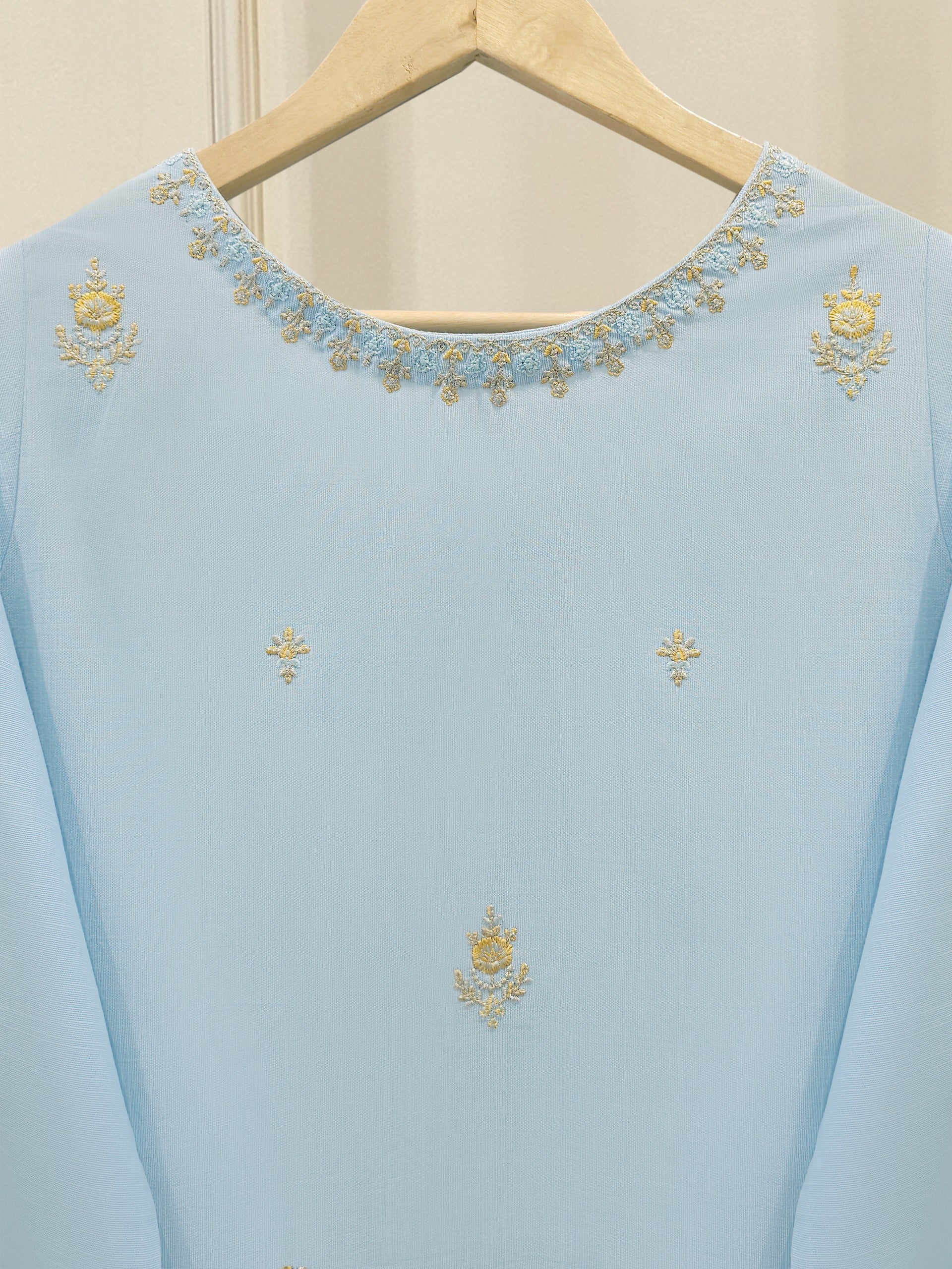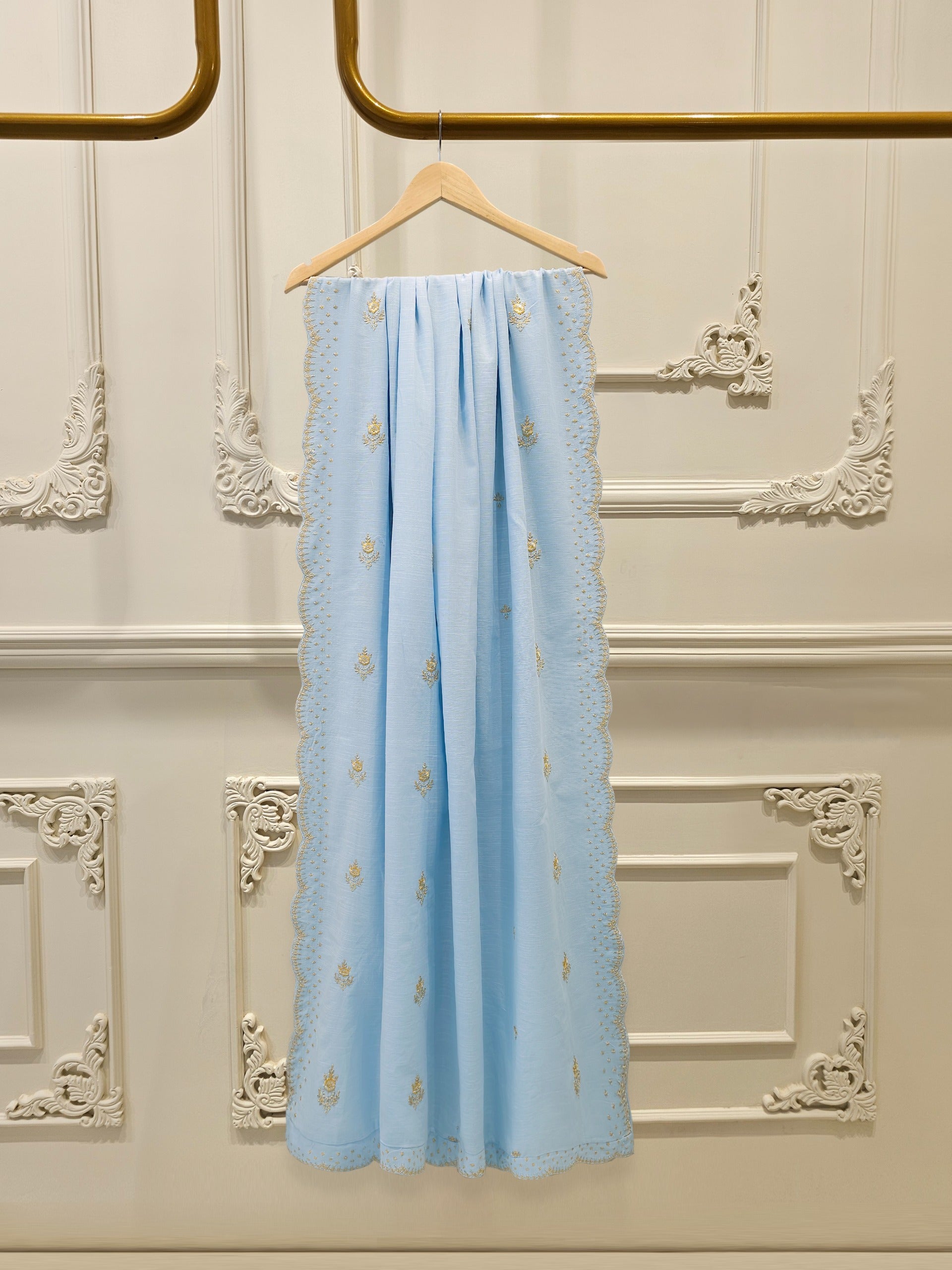 Sky blue embroidered khaddar suit features a rich, traditional design on a warm, textured fabric ideal for cooler weather. The intricate embroidery add a touch of elegance, while the soft yet durable khaddar material ensures comfort and style for everyday wear or casual gatherings. Perfect for autumn and winter seasons.