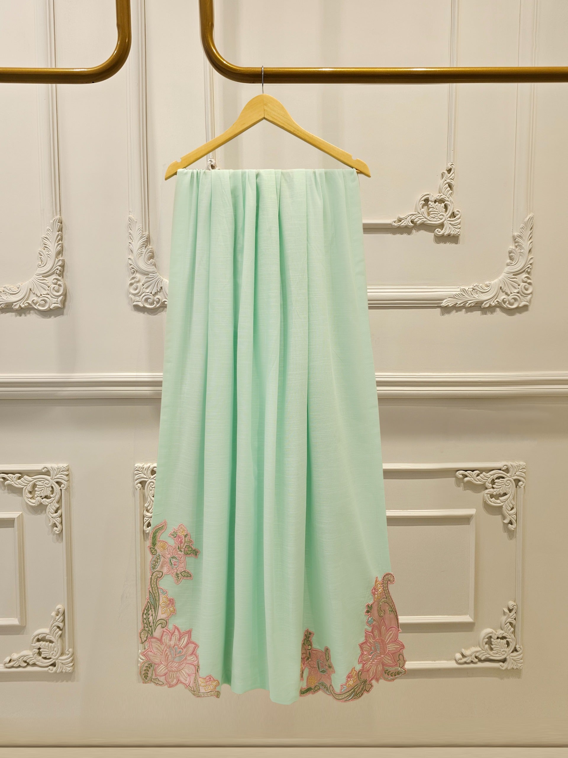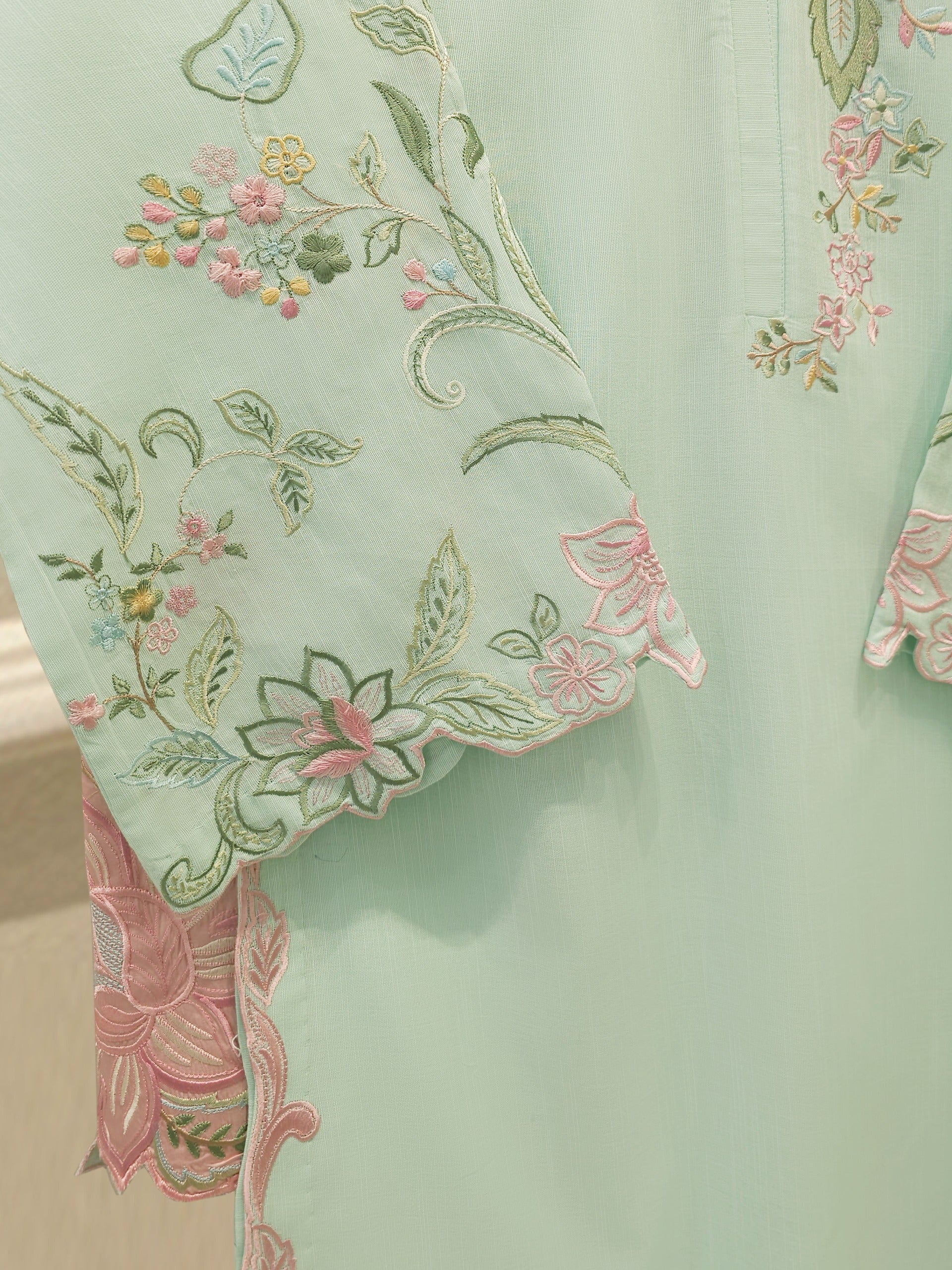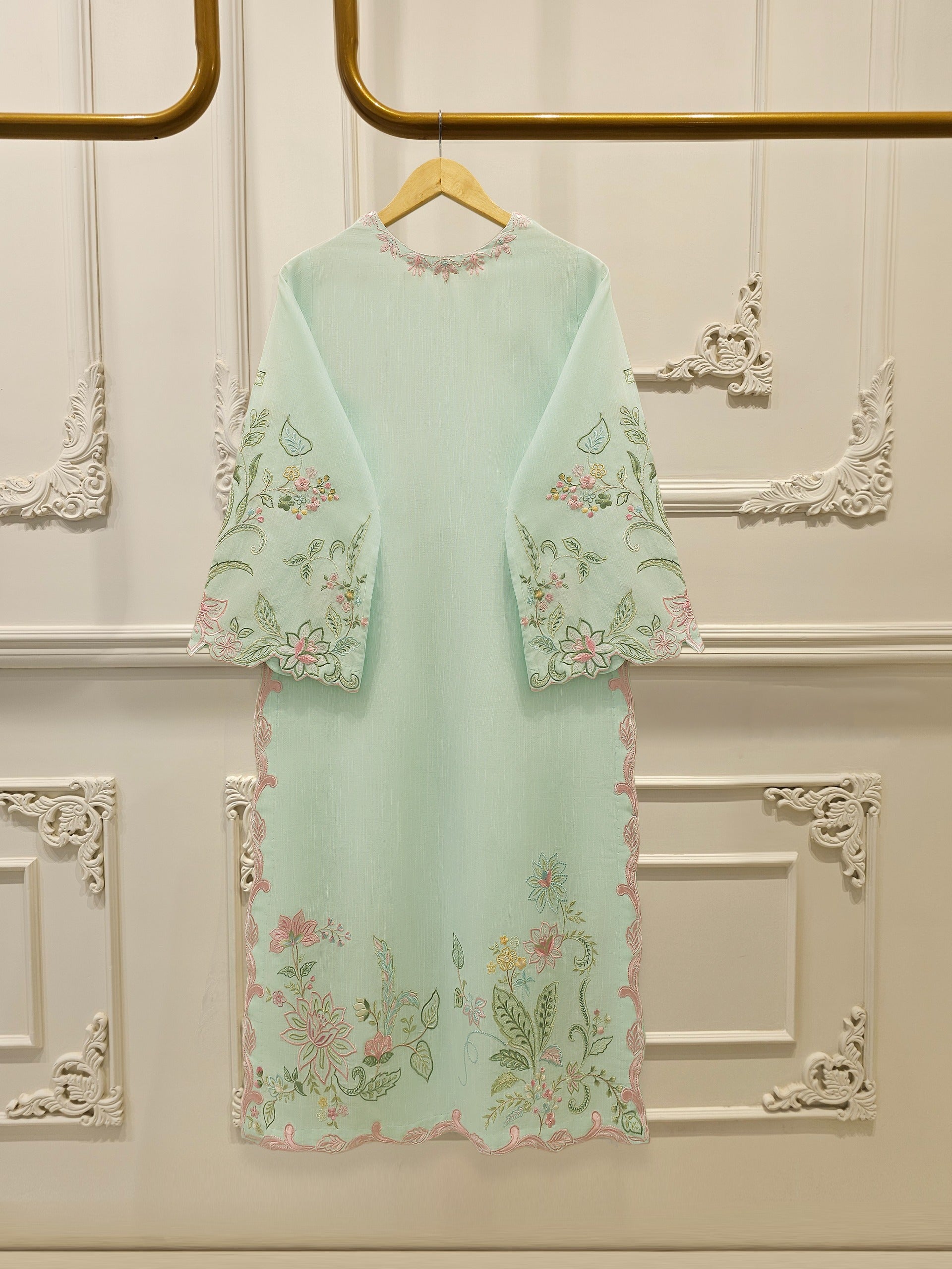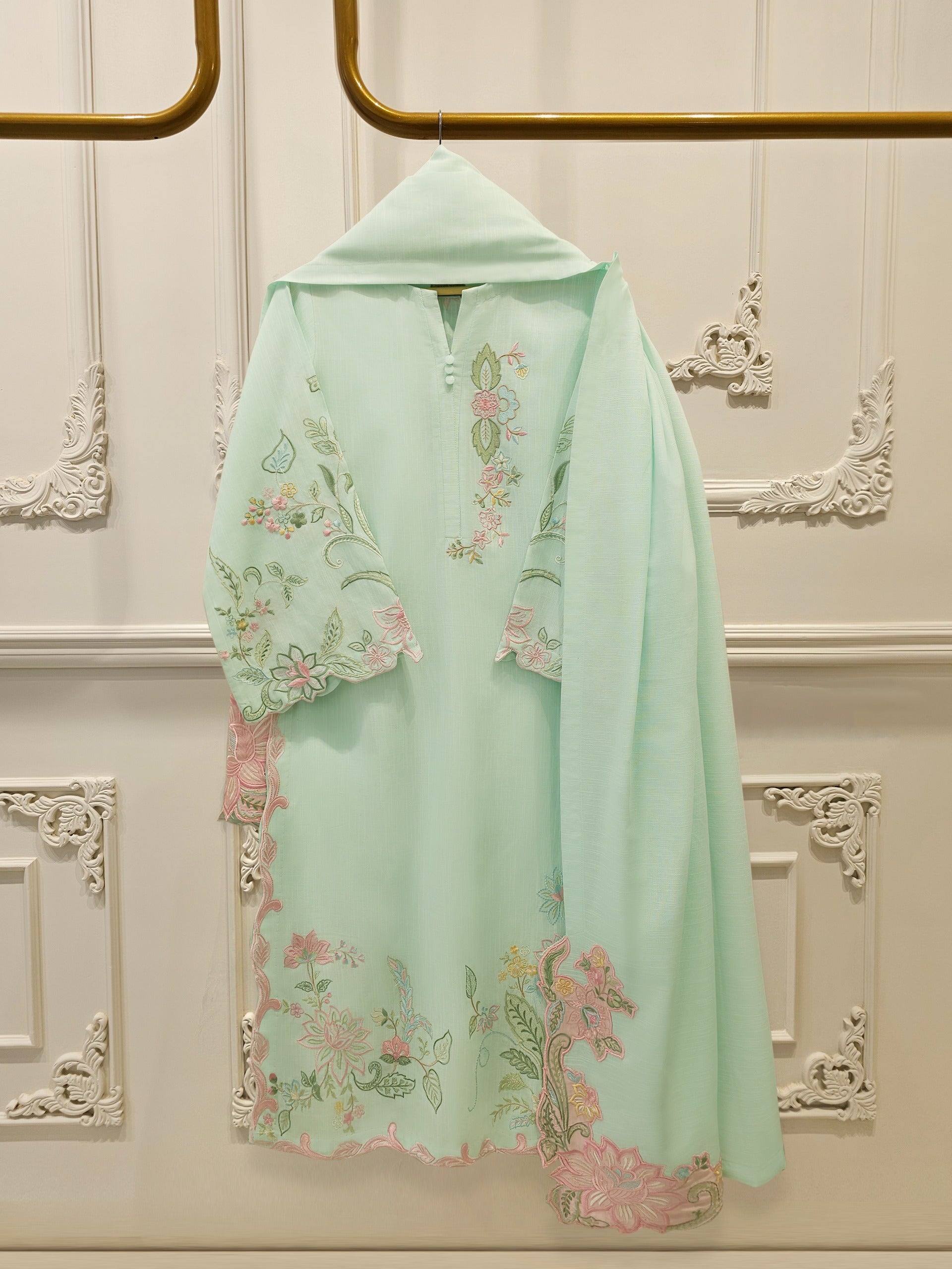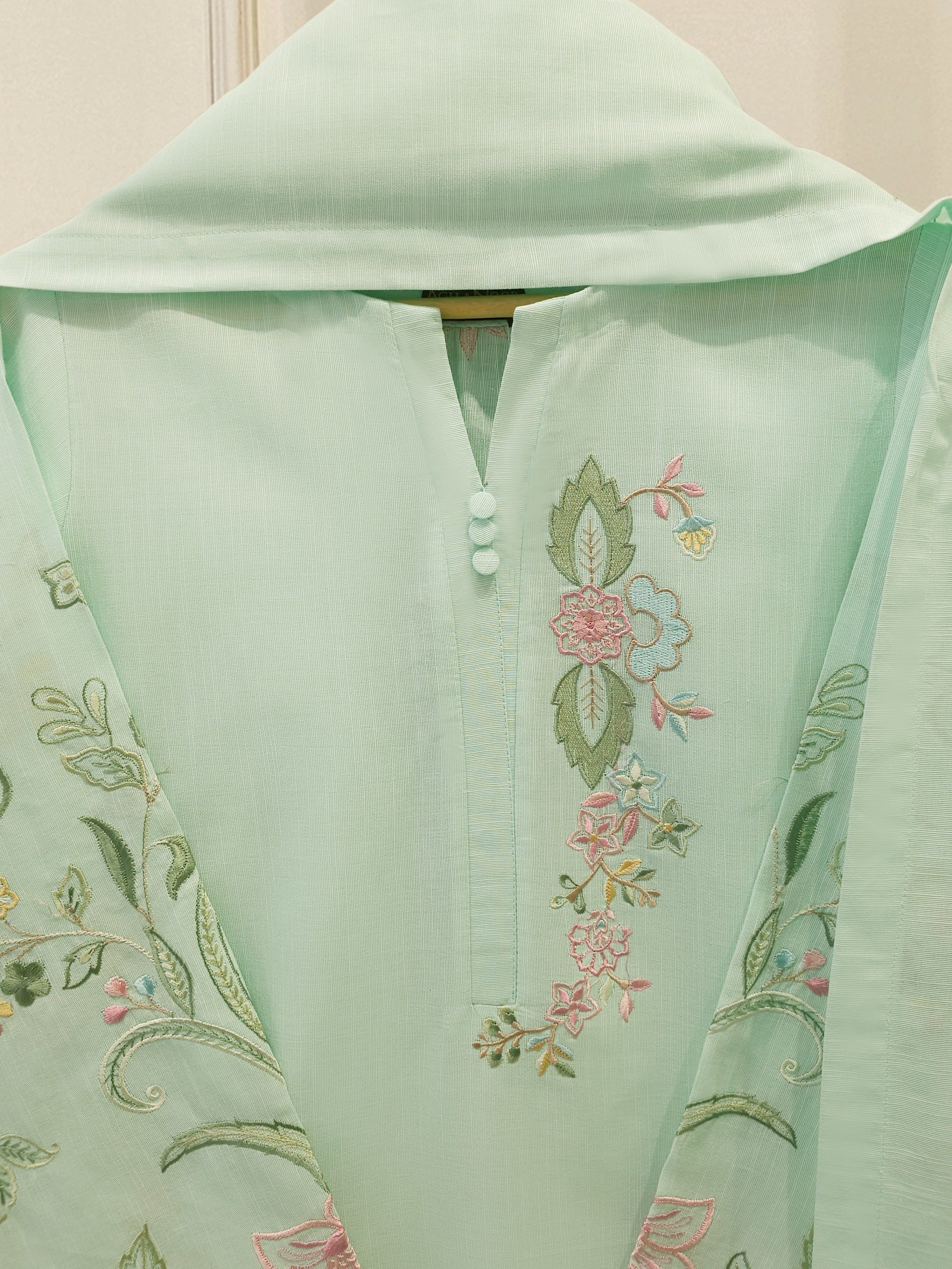 Sea green embroidered khaddar suit features a rich, traditional design on a warm, textured fabric ideal for cooler weather. The intricate embroidery add a touch of elegance, while the soft yet durable khaddar material ensures comfort and style for everyday wear or casual gatherings. Perfect for autumn and winter seasons.