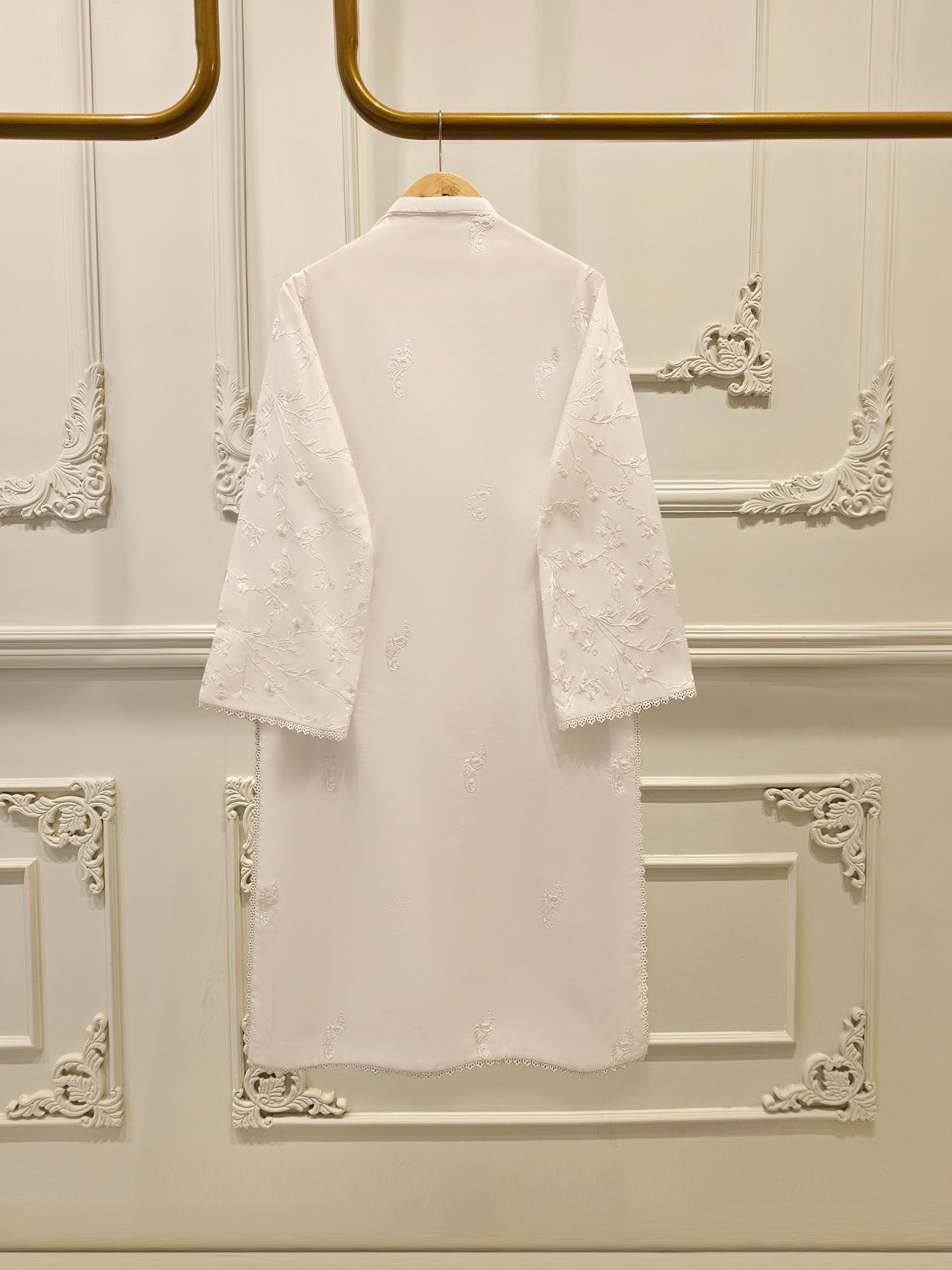 Elevate your summer wardrobe with this beautifully crafted white lawn shirt, featuring intricate Chikan Kari work on the sleeves and daman. Designed for timeless elegance, this piece blends breathable lawn fabric with traditional craftsmanship, perfect for festive occasions or casual sophistication. Pair it with pants for a complete look.