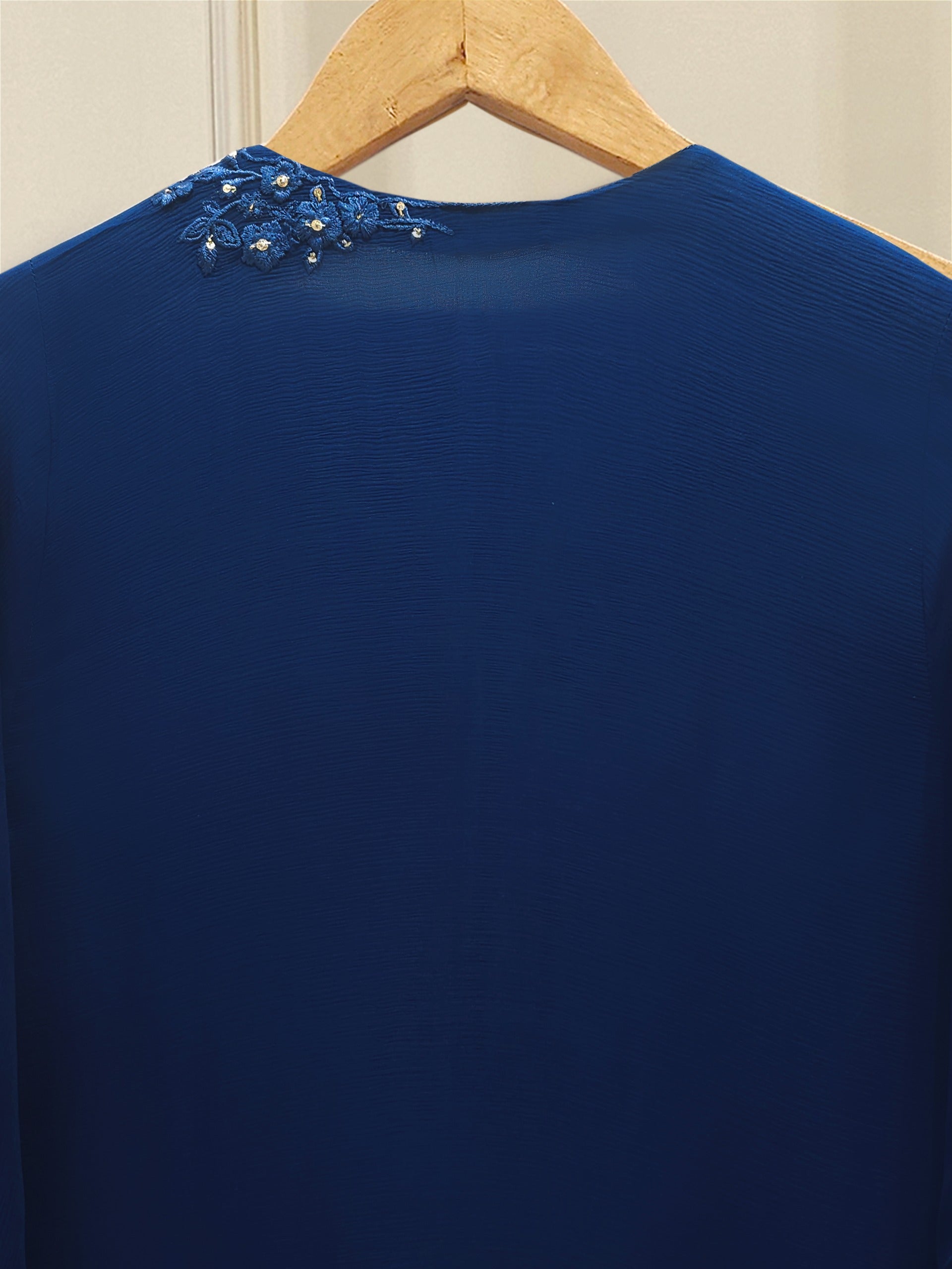 Elevate your style with our dark blue embroidered chiffon straight shirt crafted with utmost care and attention to detail. The shirt features intricate embroidery on the front and sleeves, adding a touch of timeless charm.