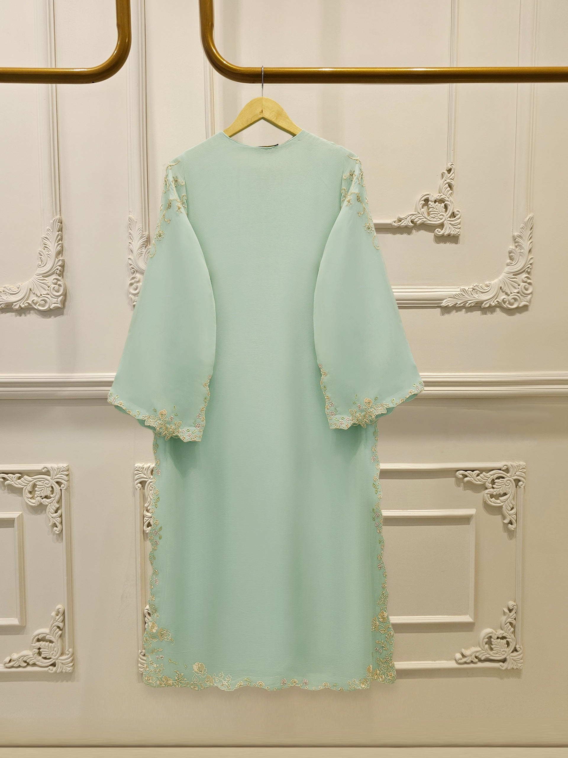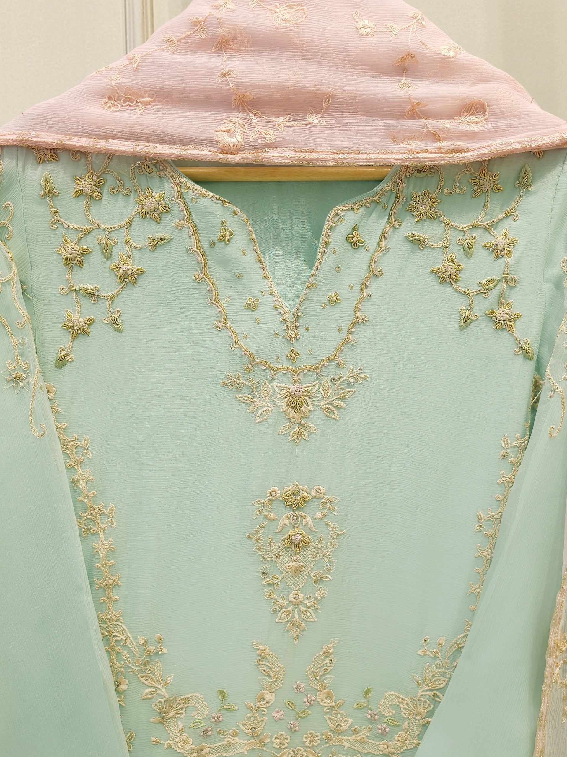 Elevate your style with our sky blue embroidered pure chiffon straight shirt crafted with utmost care and attention to detail. The shirt features intricate embroidery on the front and sleeves, adding a touch of timeless charm.