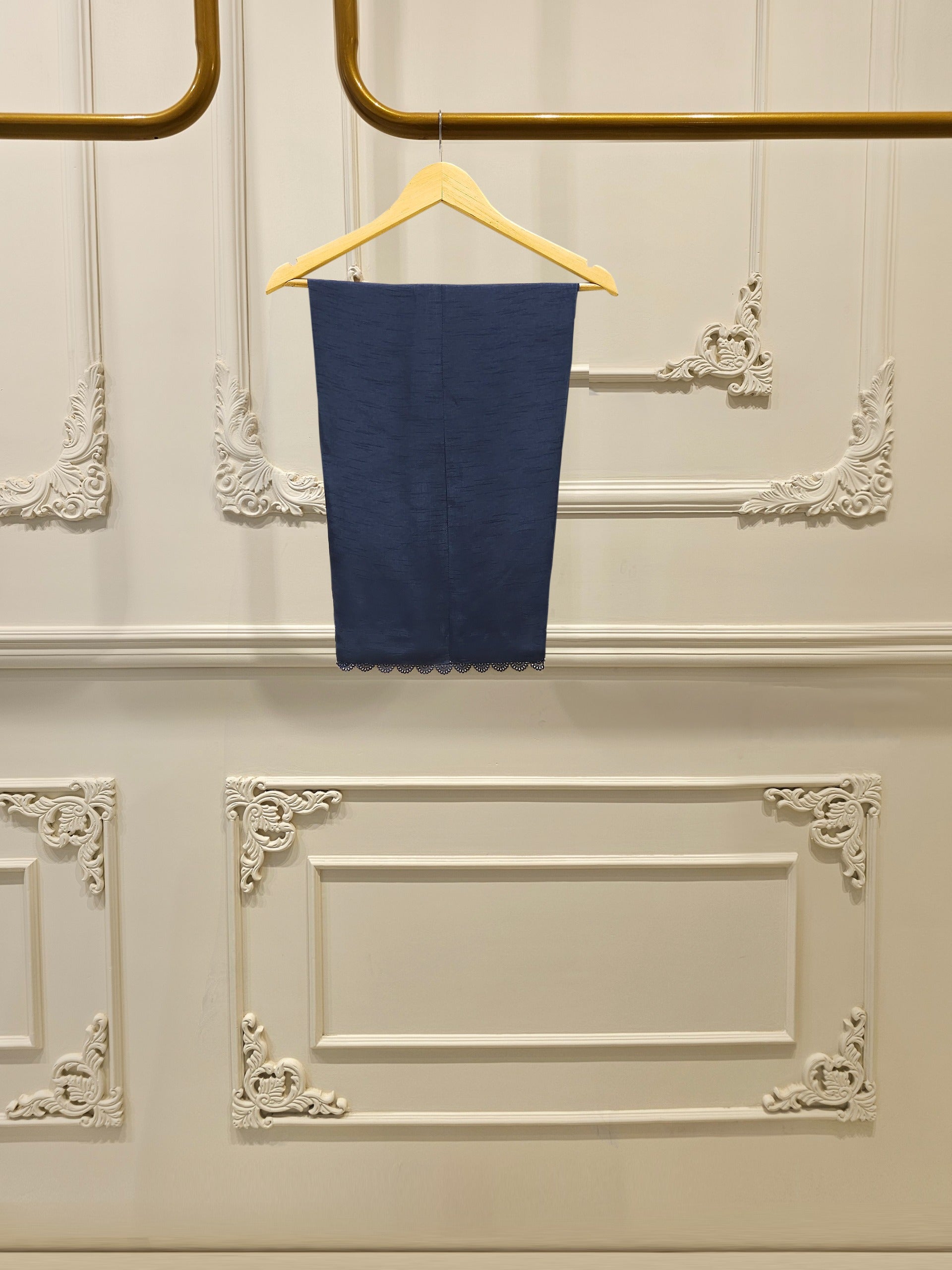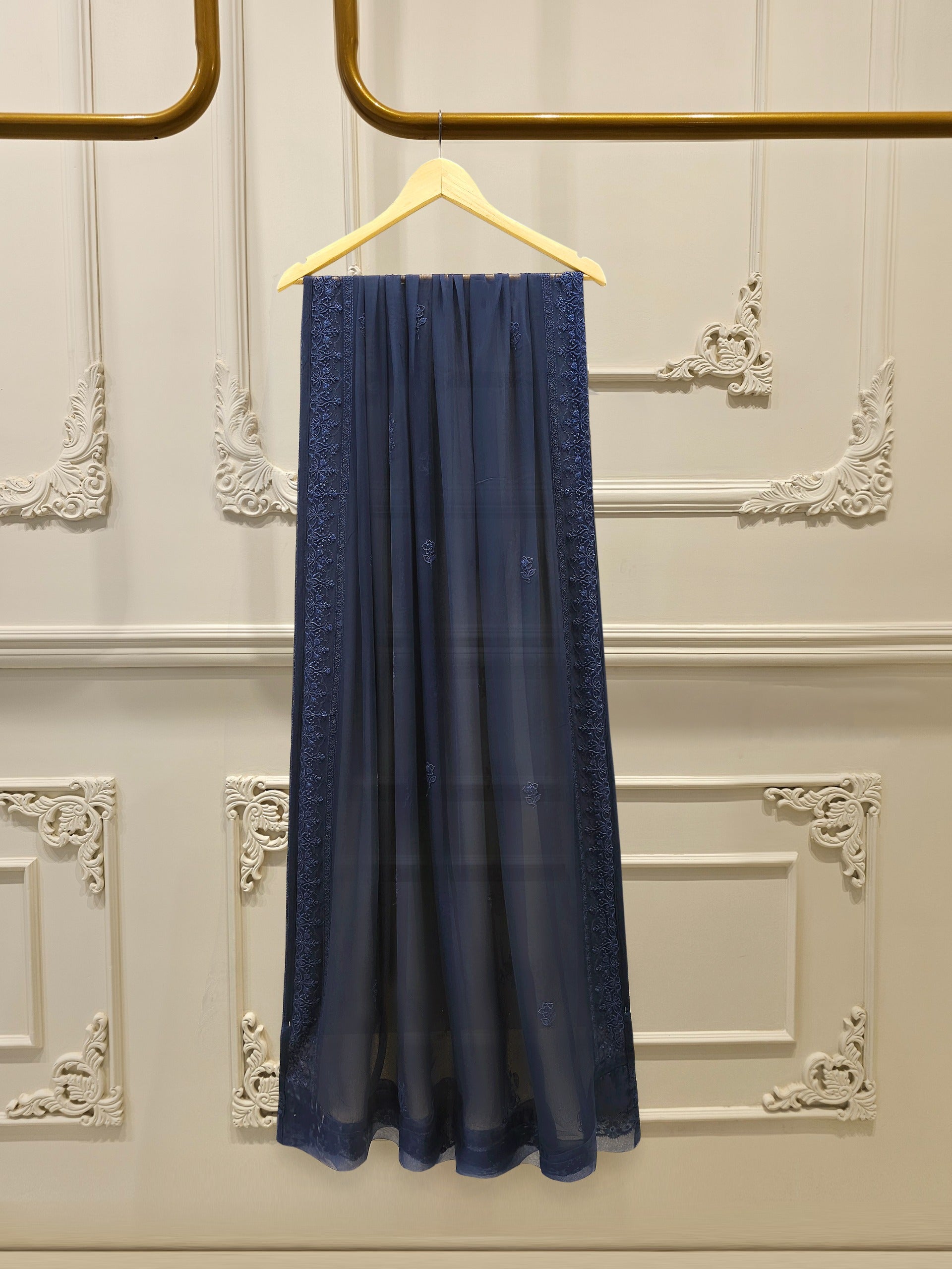Elevate your style with our navy blue embroidered chiffon straight shirt crafted with utmost care and attention to detail. The shirt features intricate embroidery on the front and sleeves, adding a touch of timeless charm.