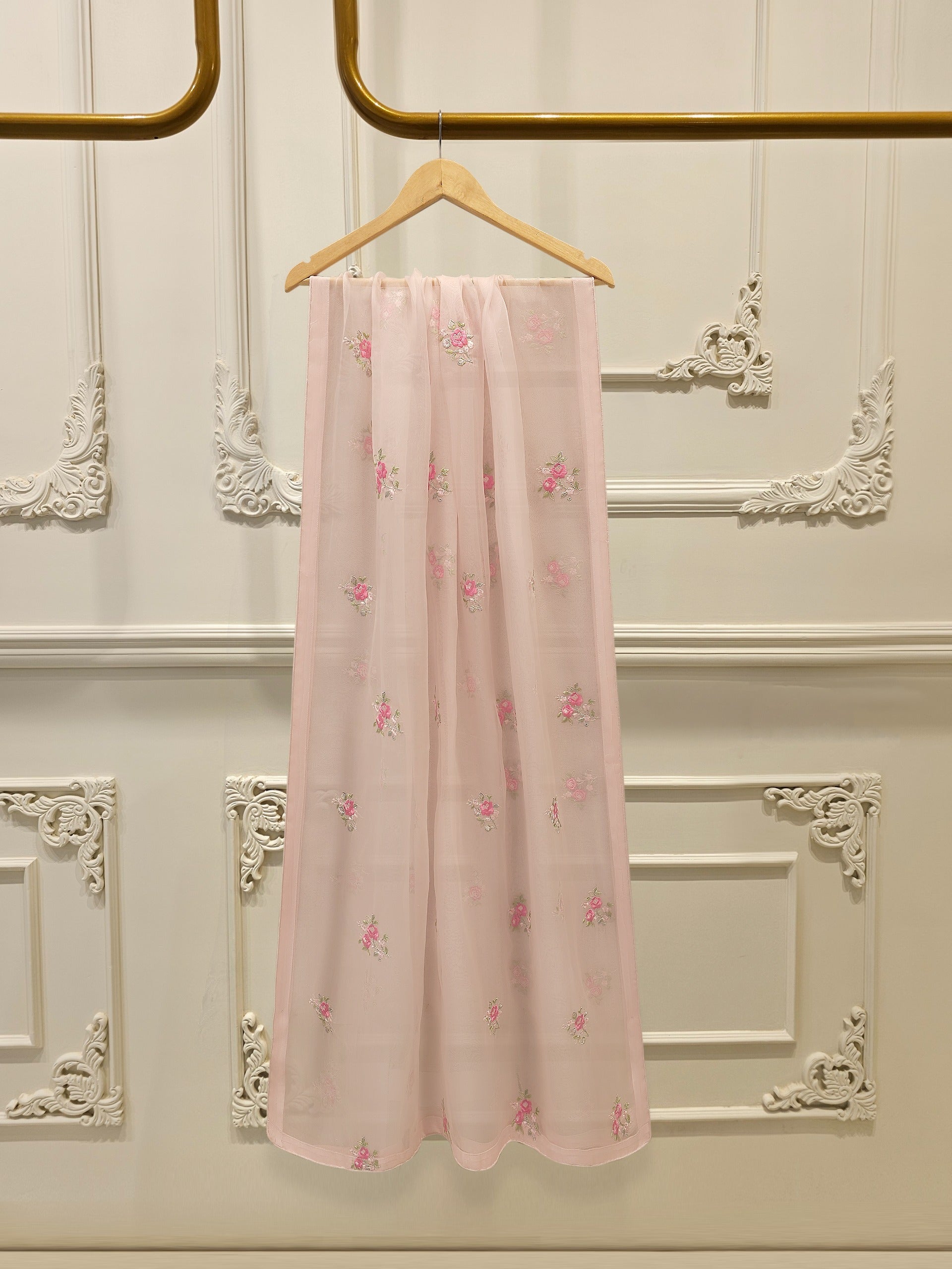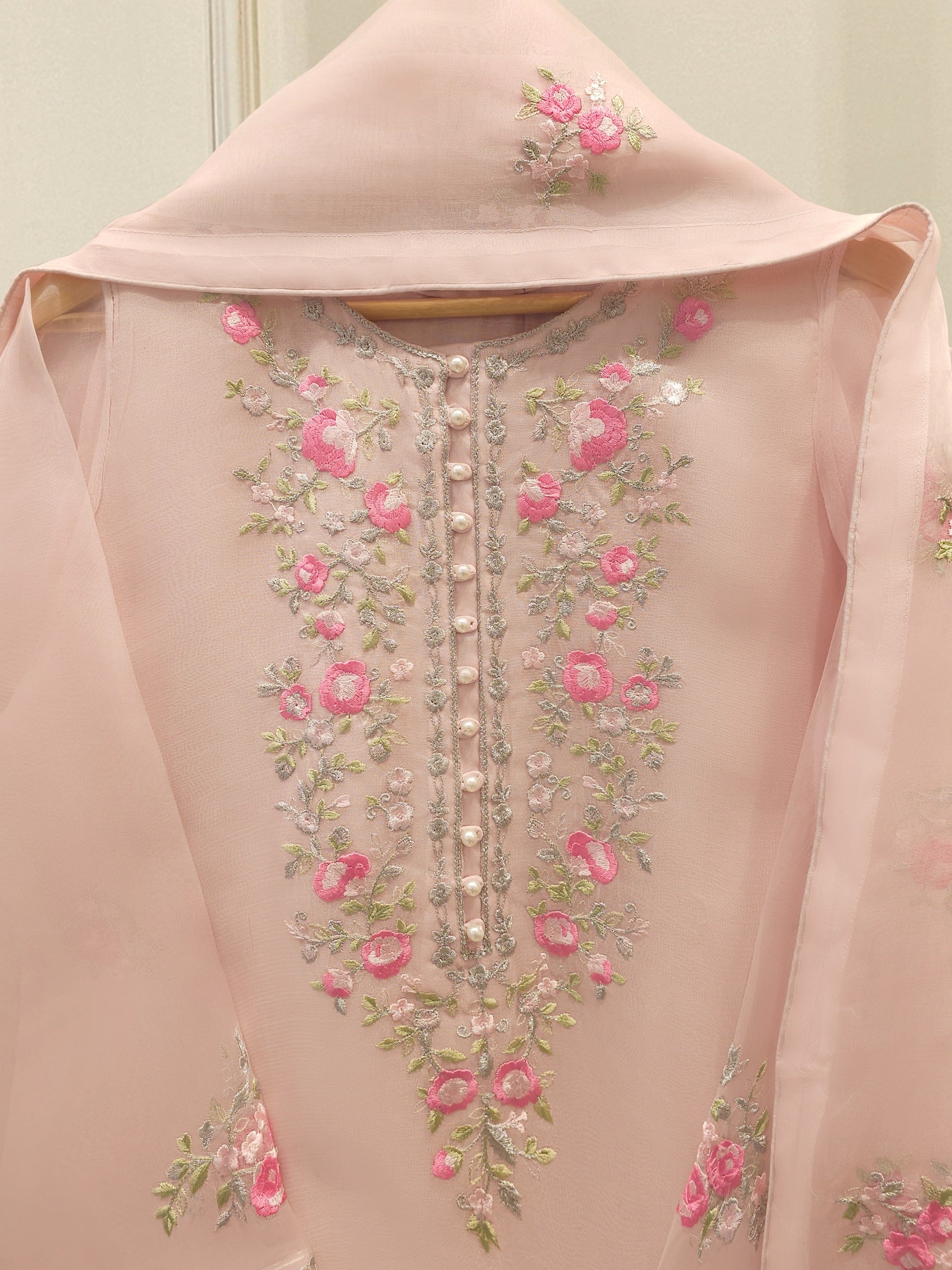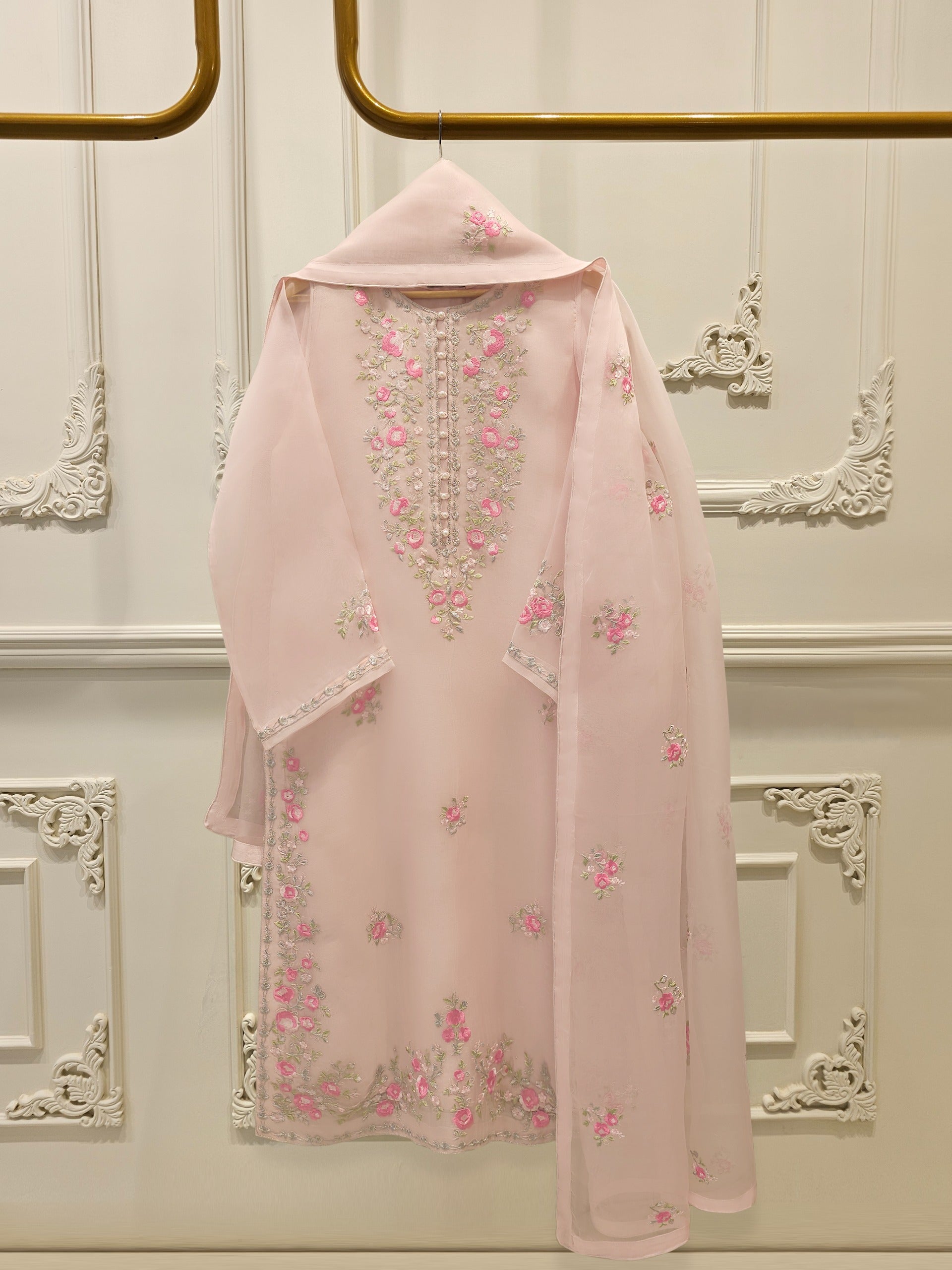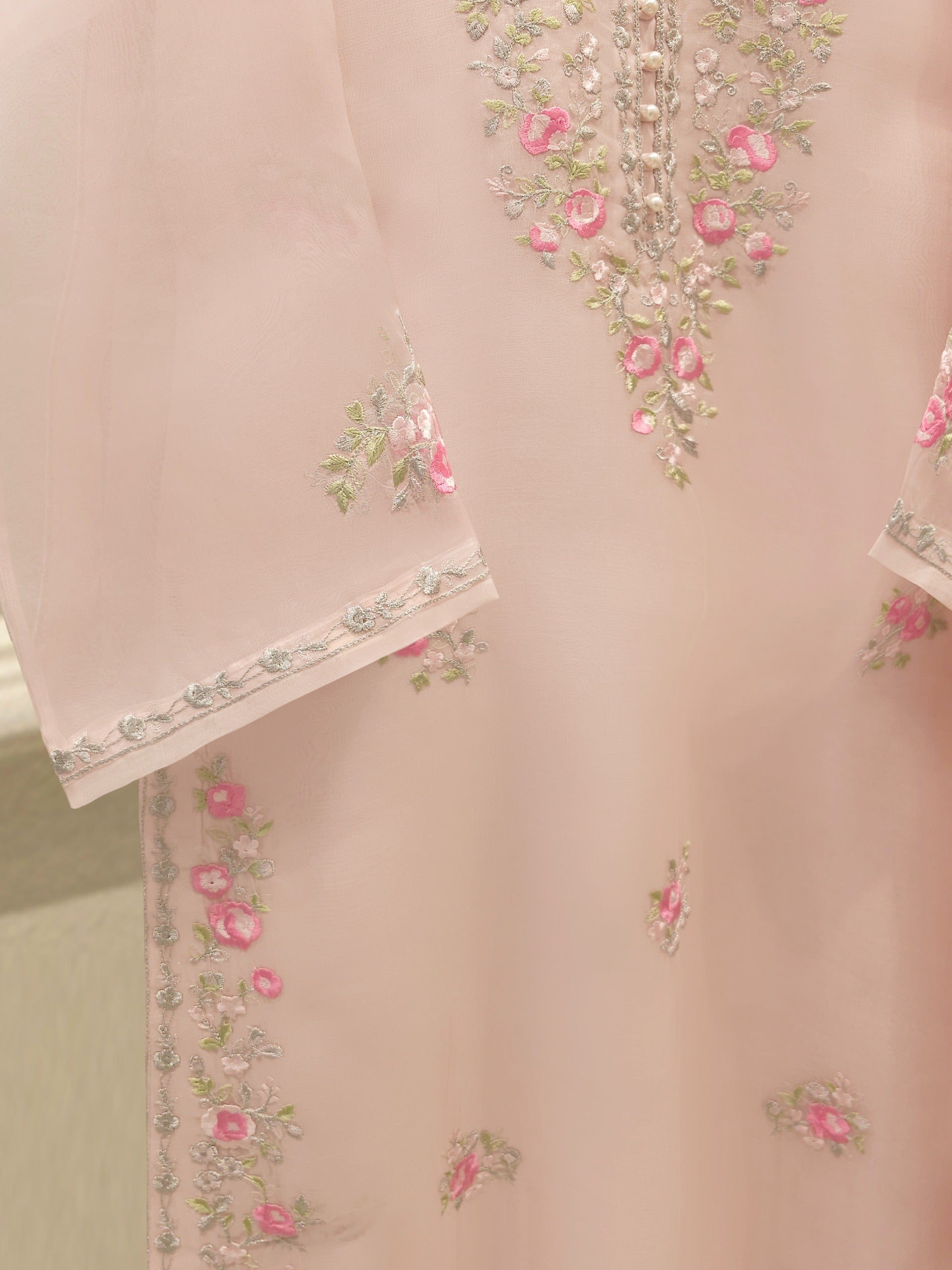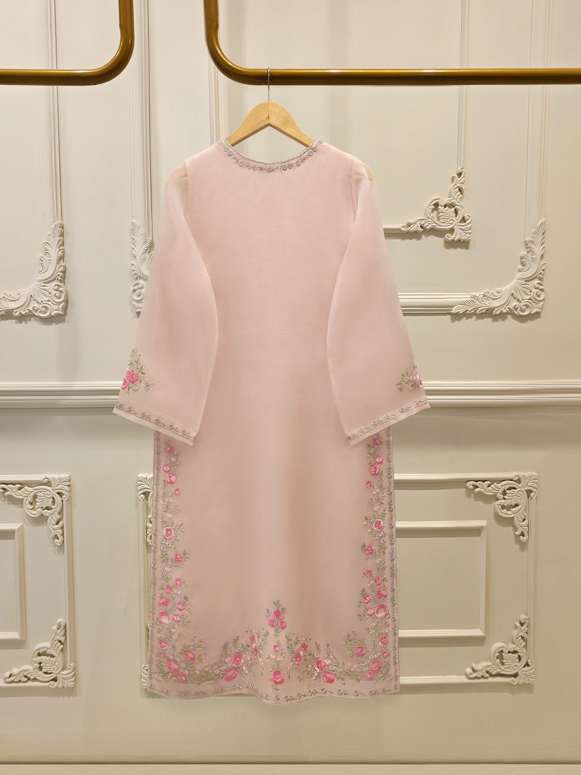 Elevate your style with our pink embroidered organza straight shirt crafted with utmost care and attention to detail. The shirt features intricate embroidery on the front and sleeves, adding a touch of timeless charm.