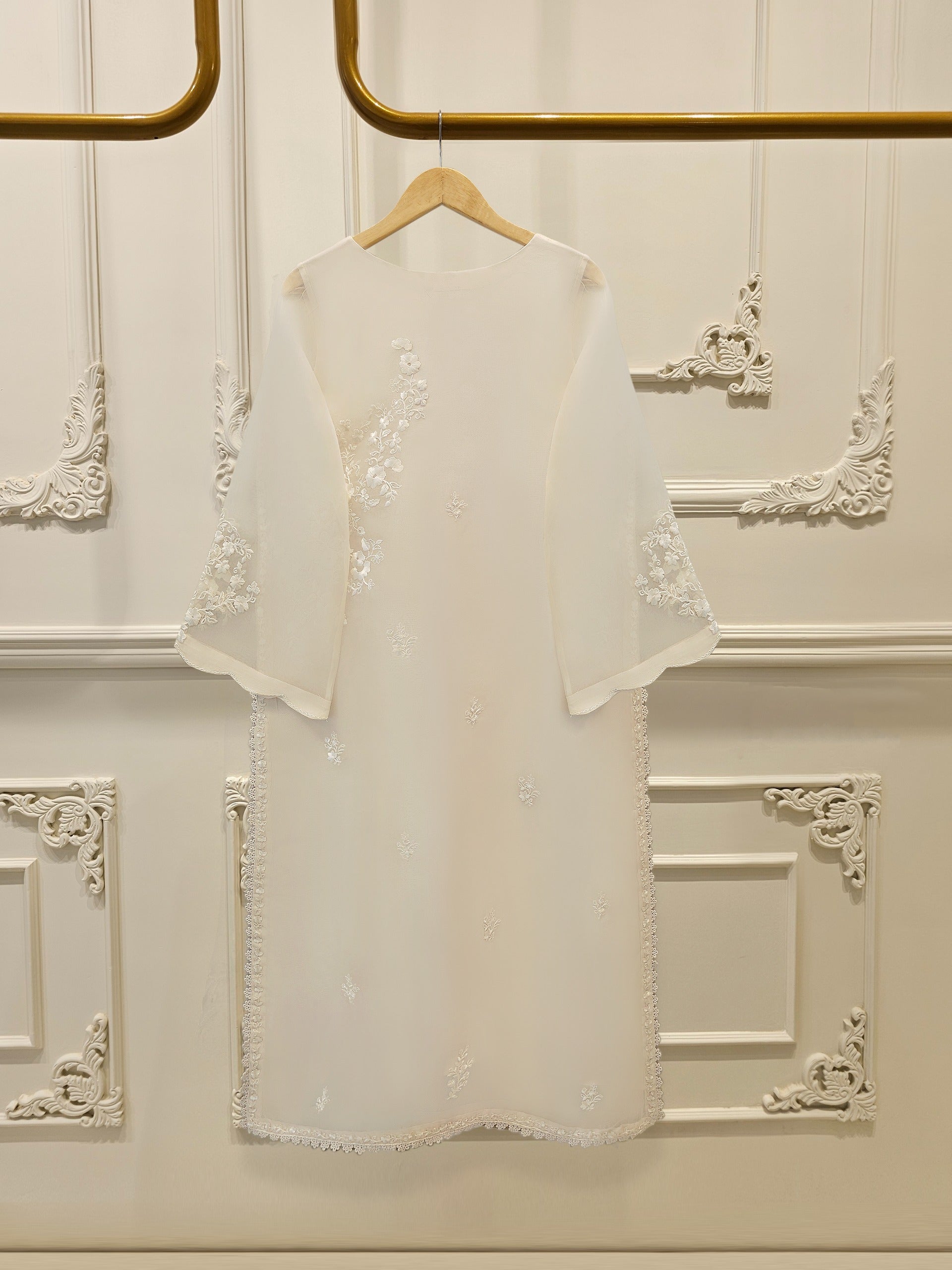Elevate your style with our off white embroidered organza straight shirt crafted with utmost care and attention to detail. The shirt features intricate embroidery on the front and sleeves, adding a touch of timeless charm.