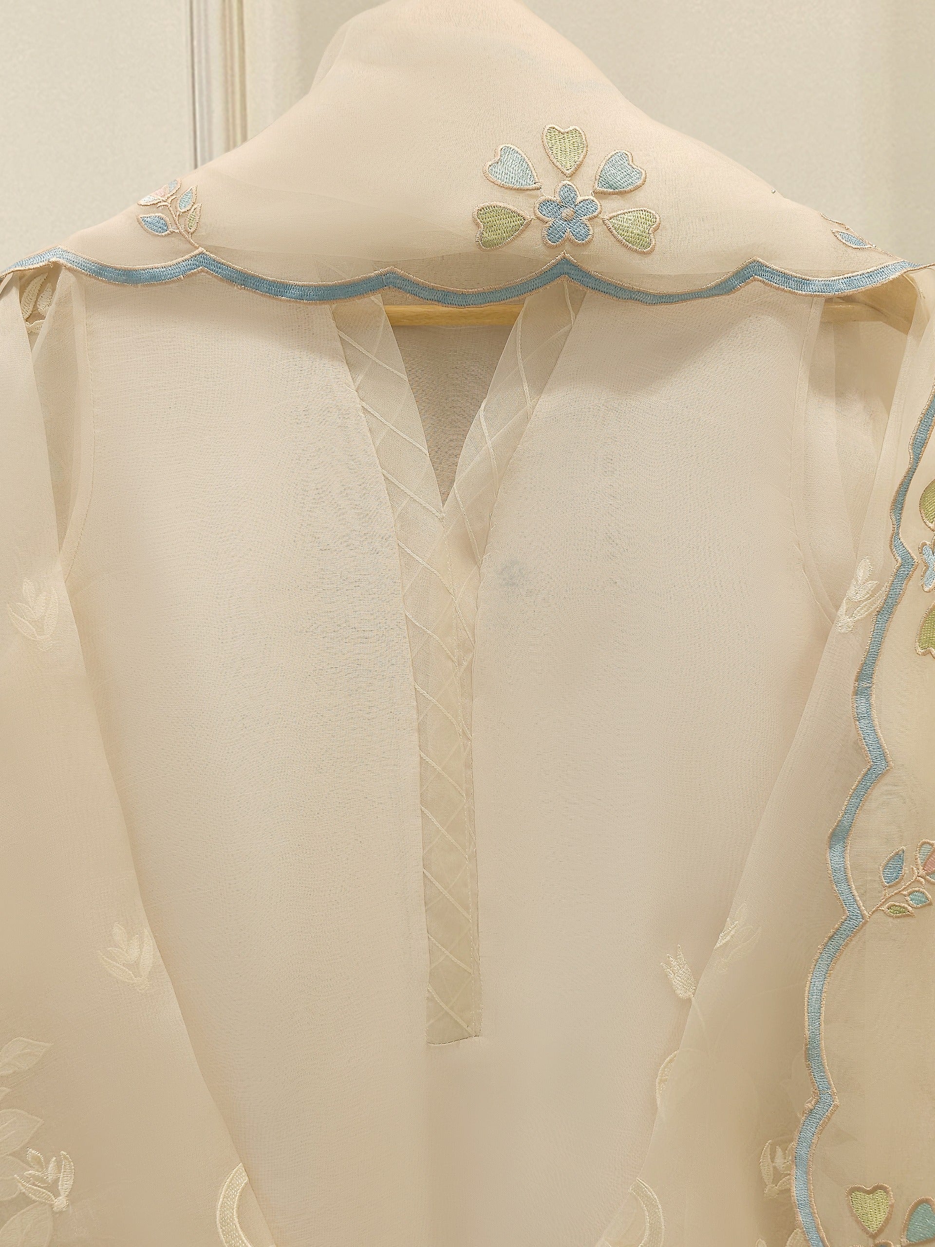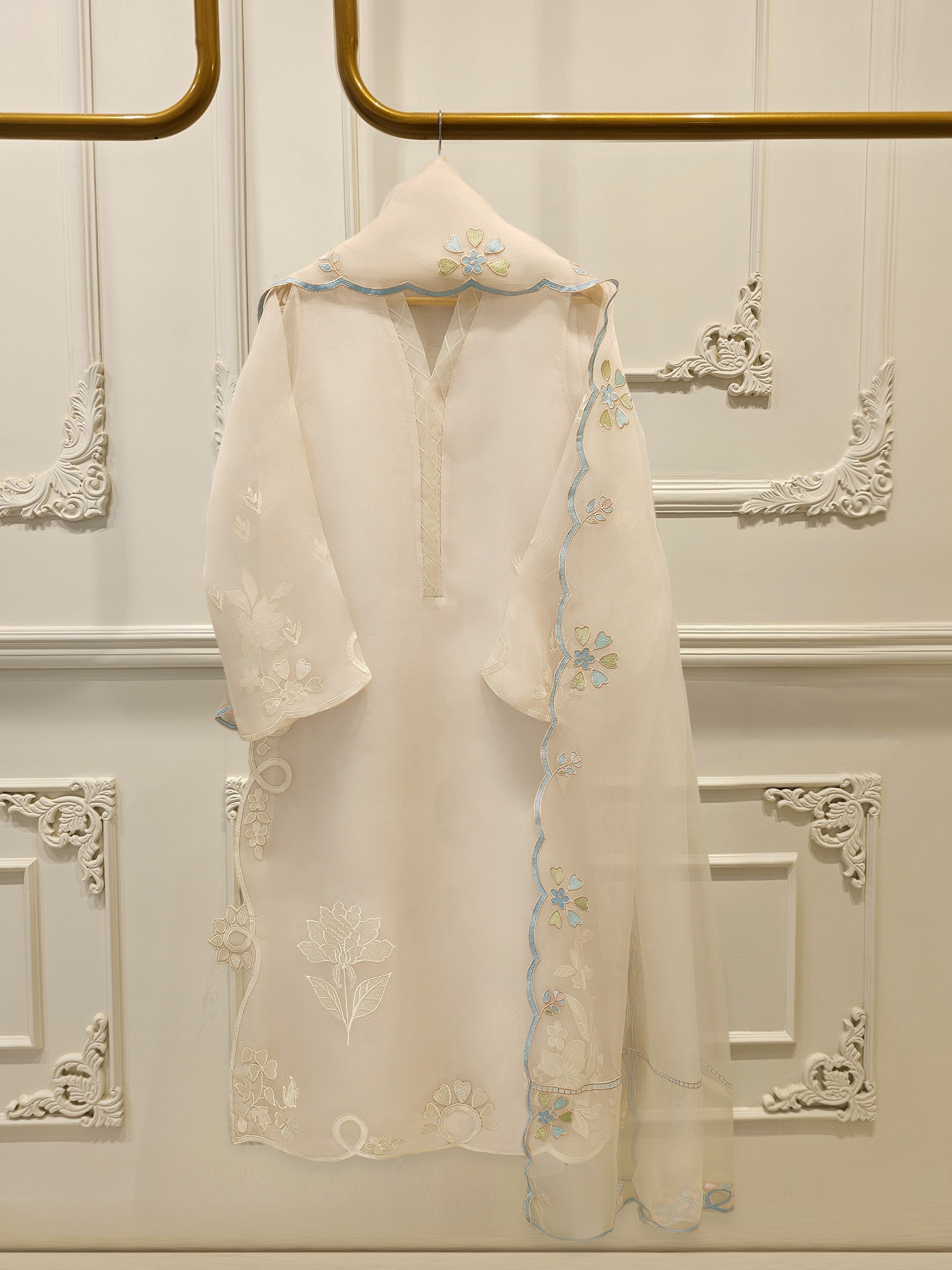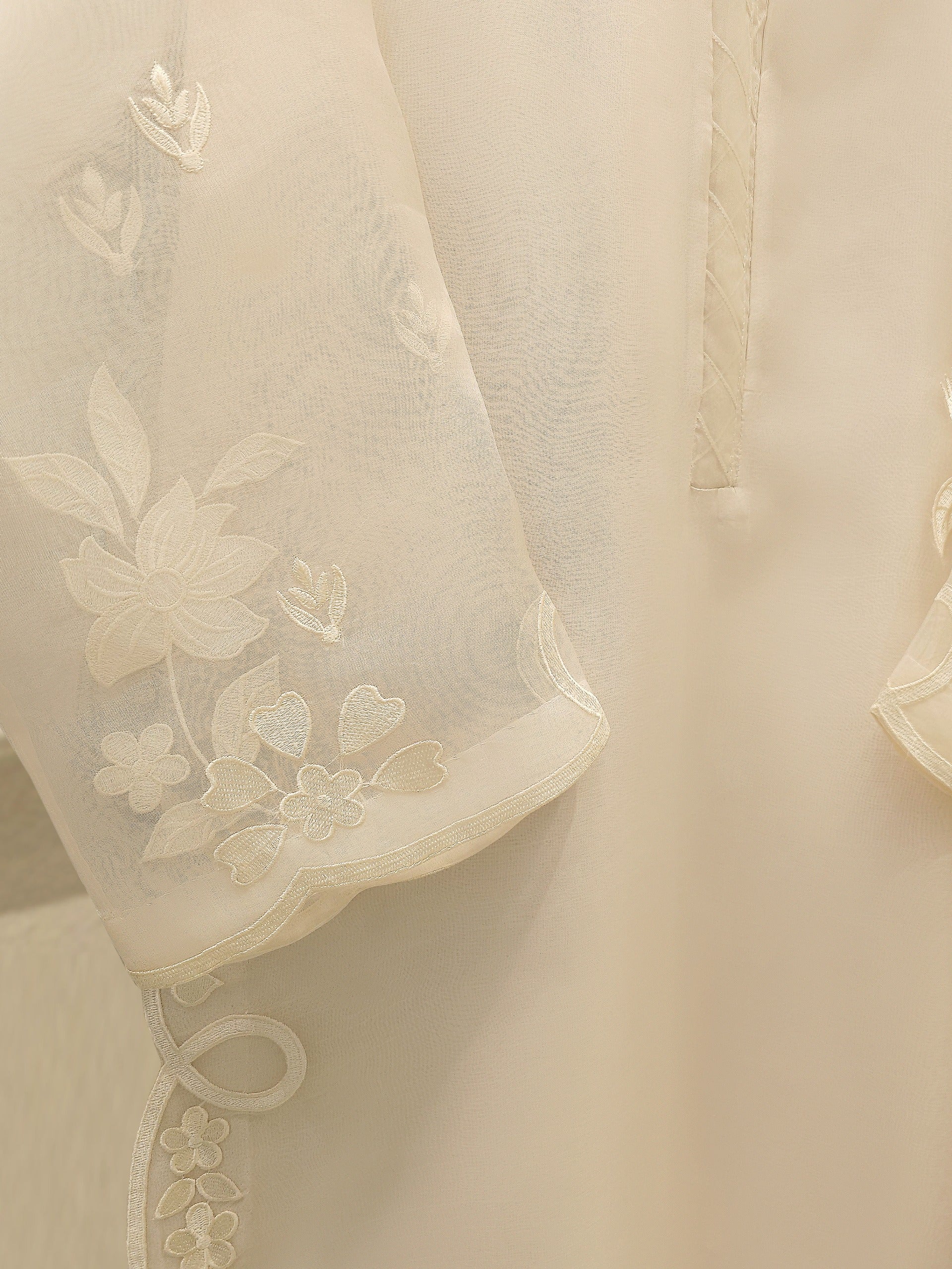 Elevate your style with our off white embroidered organza straight shirt crafted with utmost care and attention to detail. The shirt features intricate embroidery on the front and sleeves, adding a touch of timeless charm.
