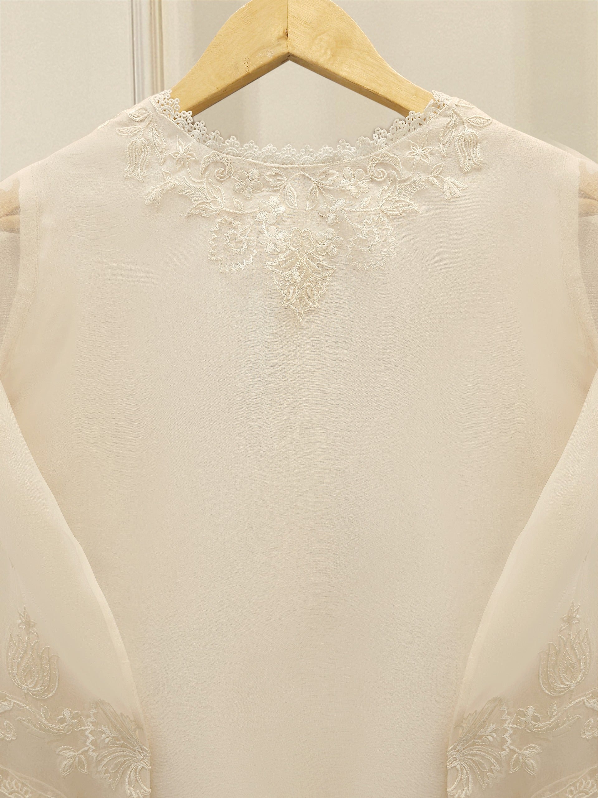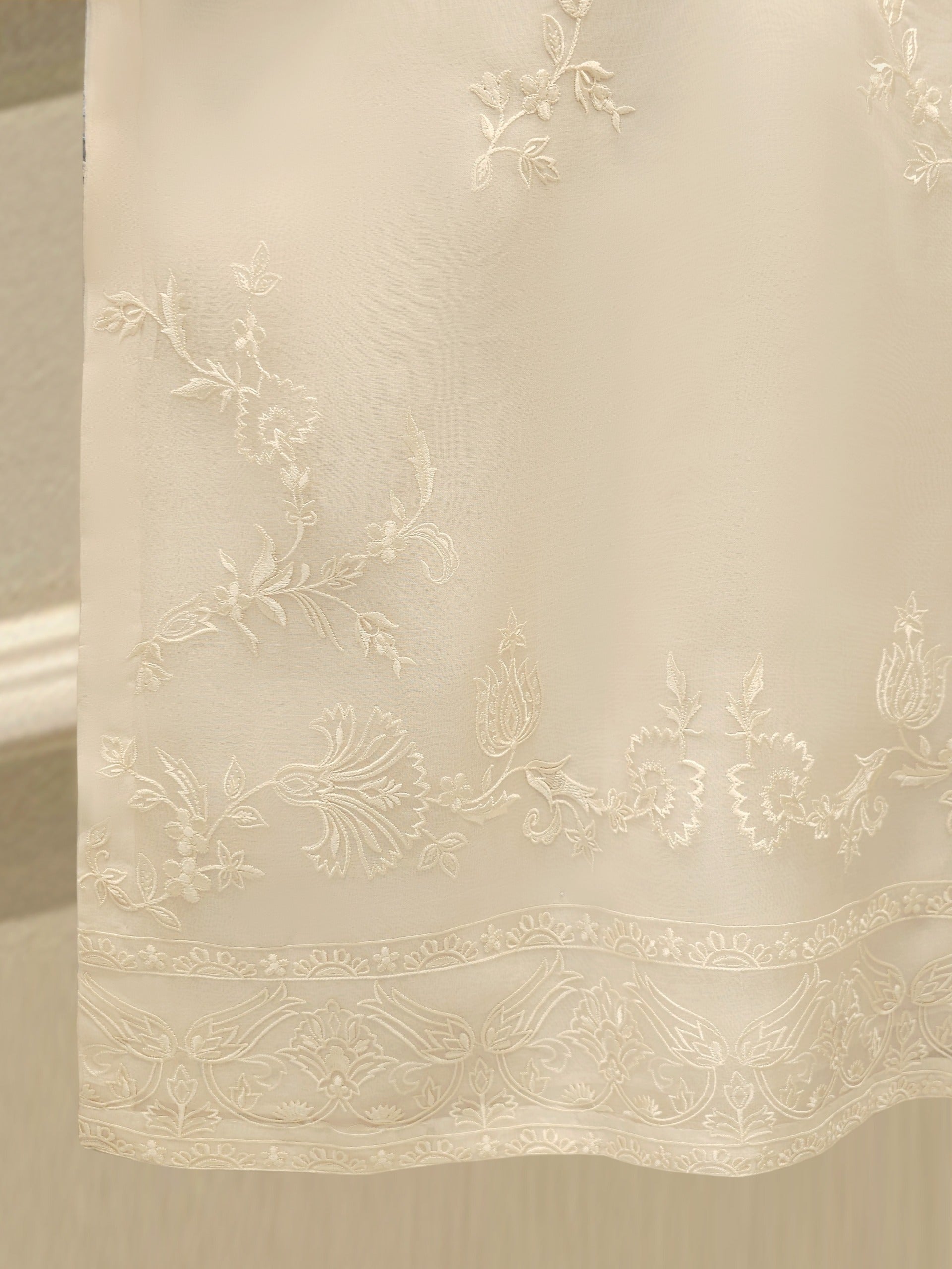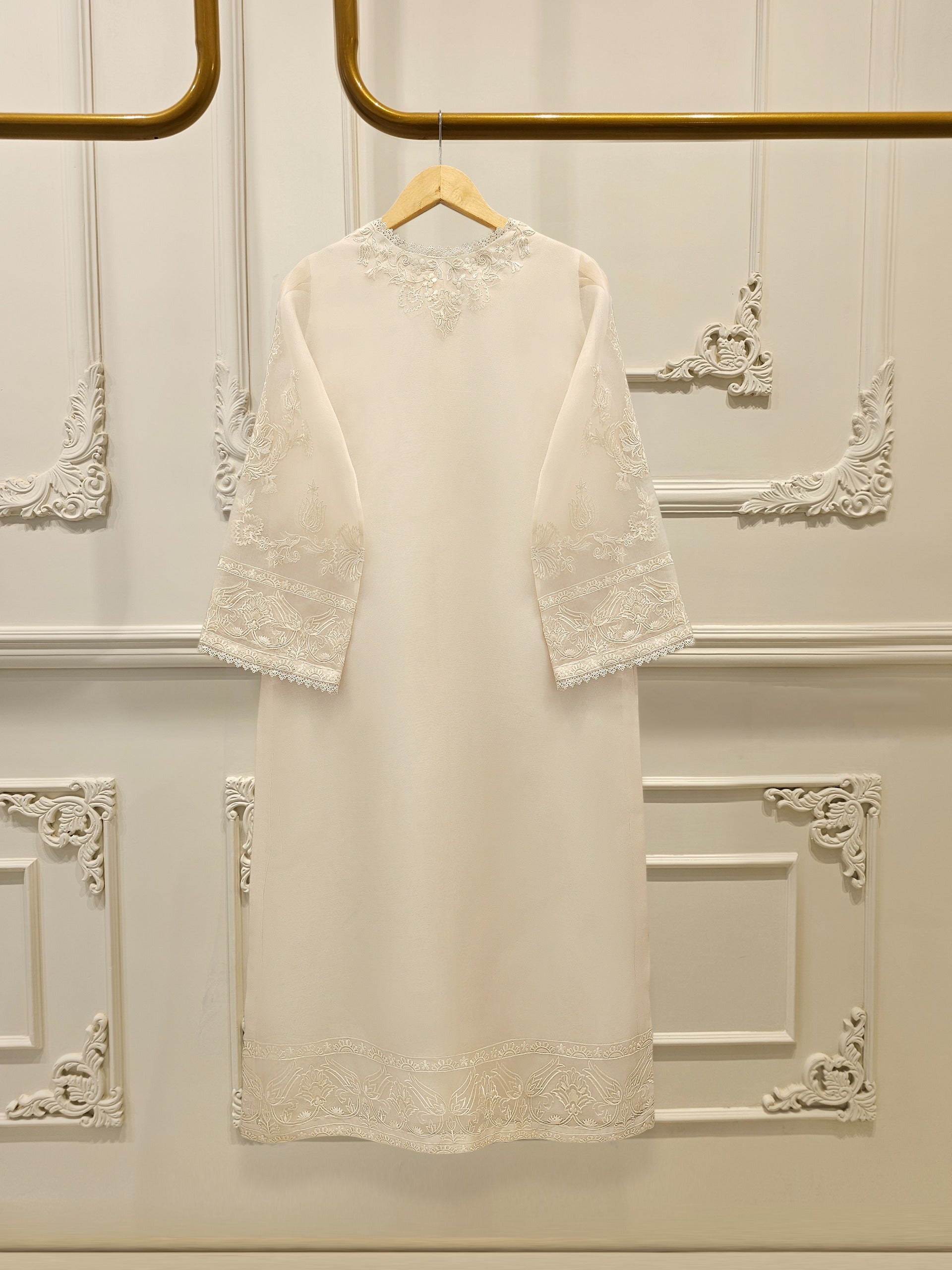 Elevate your style with our off white embroidered organza straight shirt crafted with utmost care and attention to detail. The shirt features intricate embroidery on the front and sleeves, adding a touch of timeless charm.