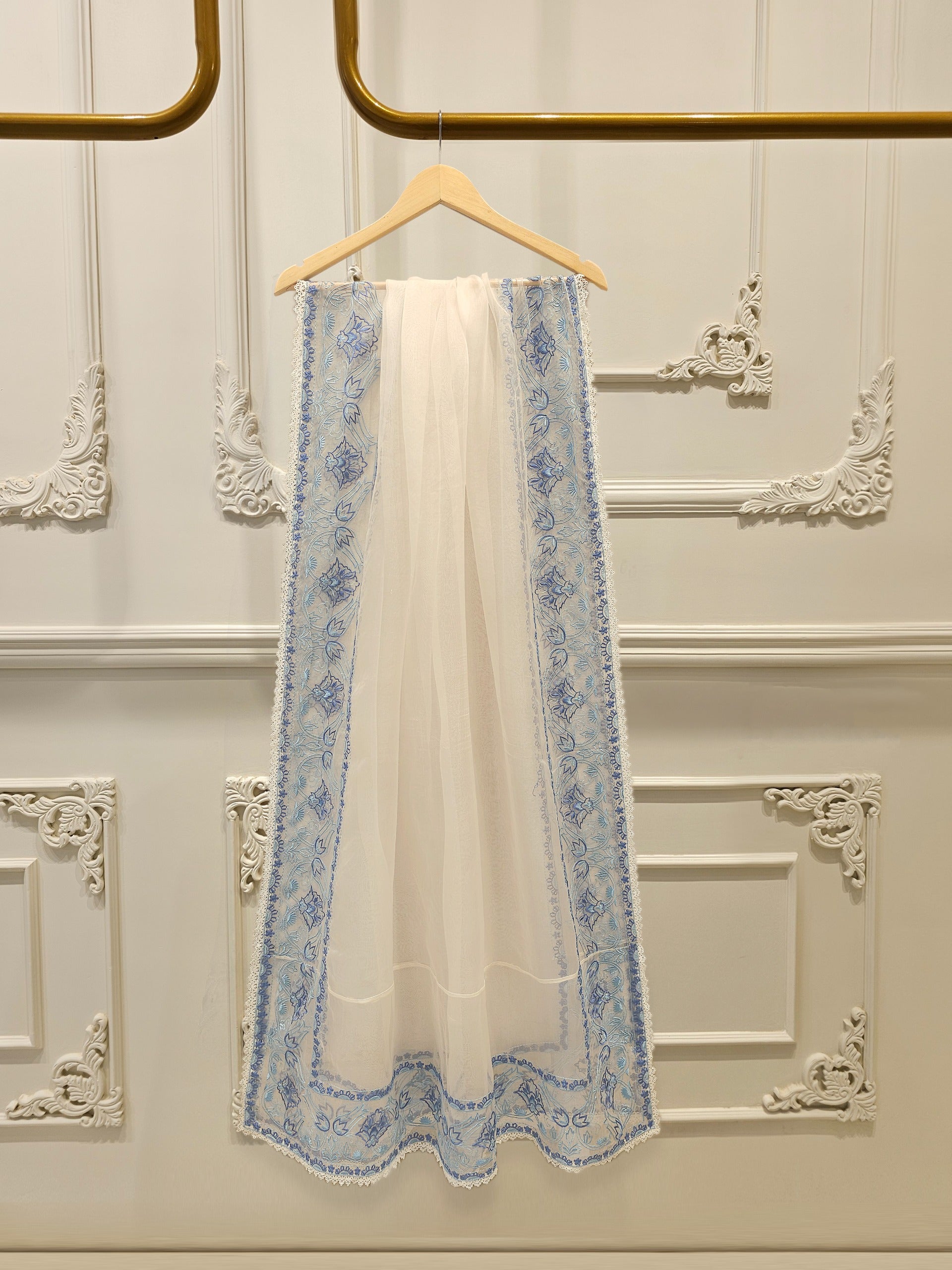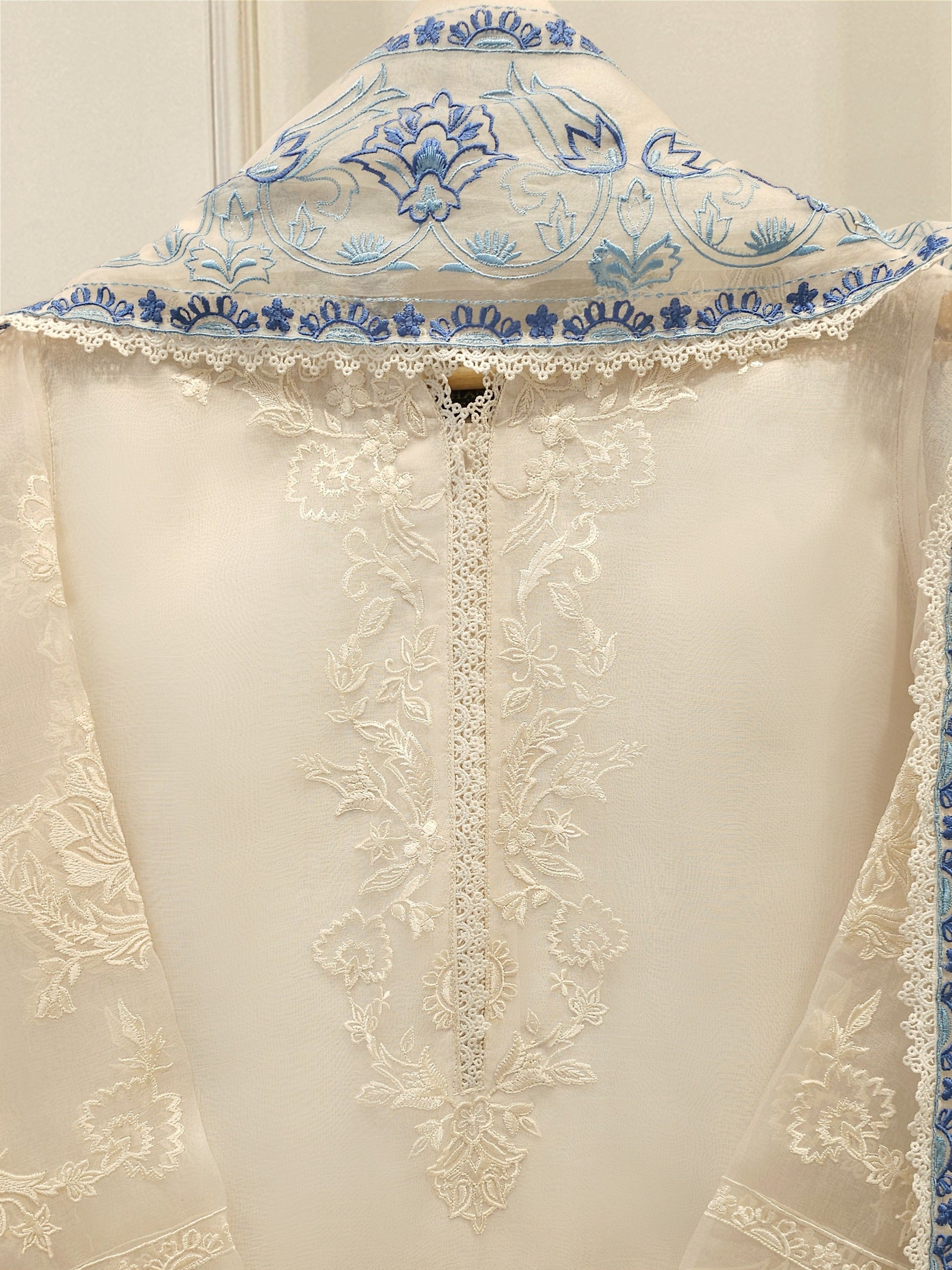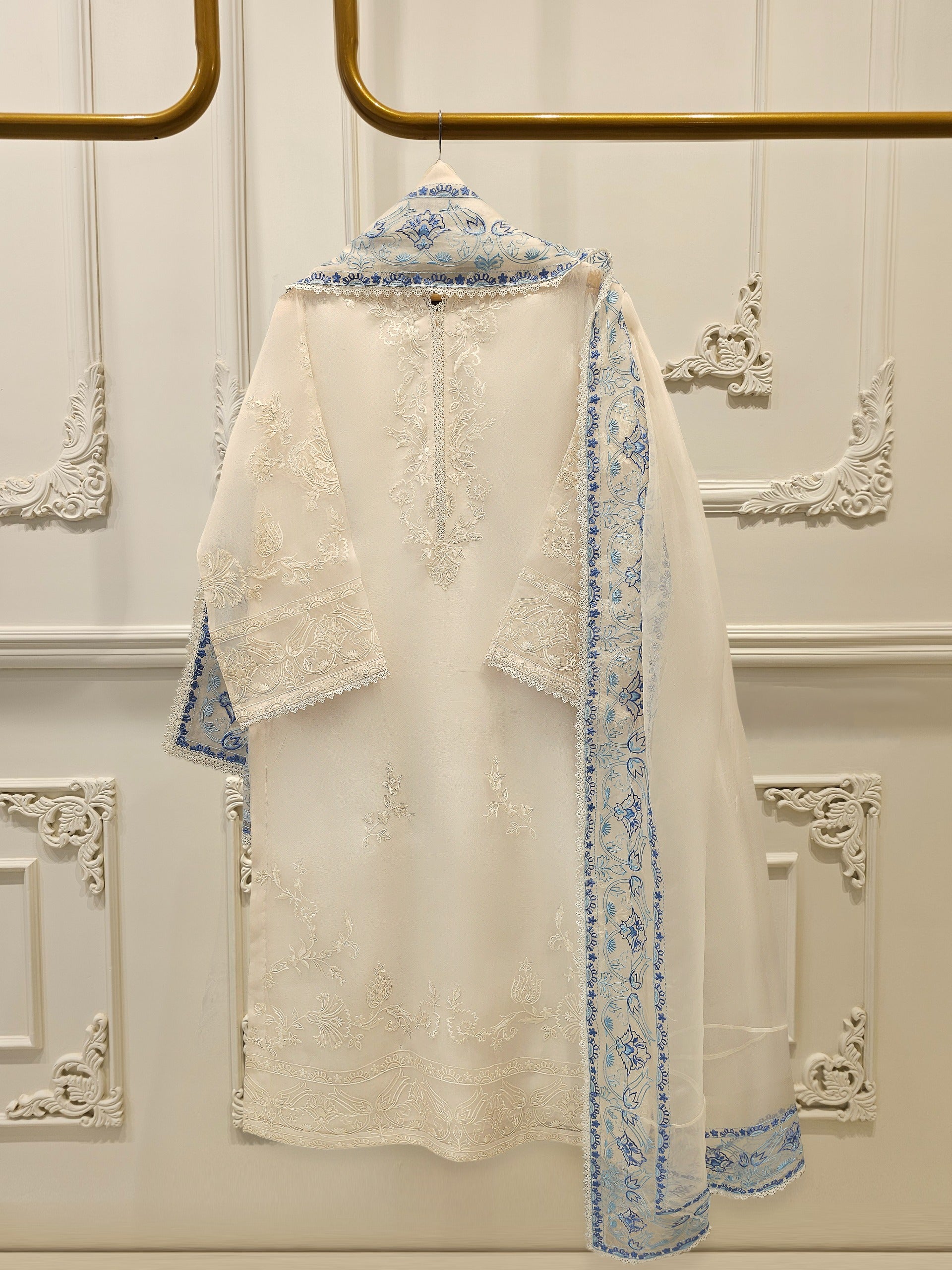 Elevate your style with our off white embroidered organza straight shirt crafted with utmost care and attention to detail. The shirt features intricate embroidery on the front and sleeves, adding a touch of timeless charm.