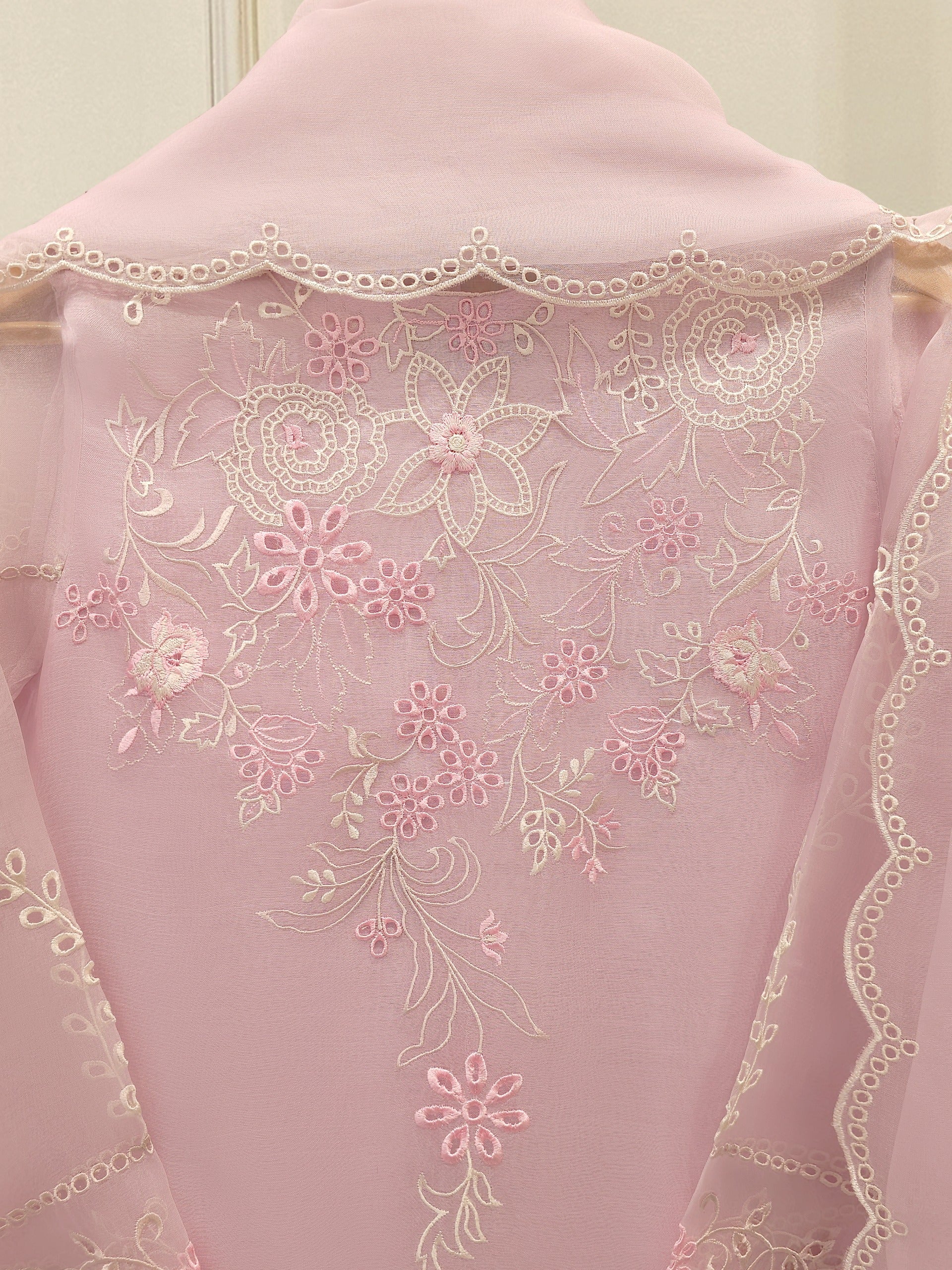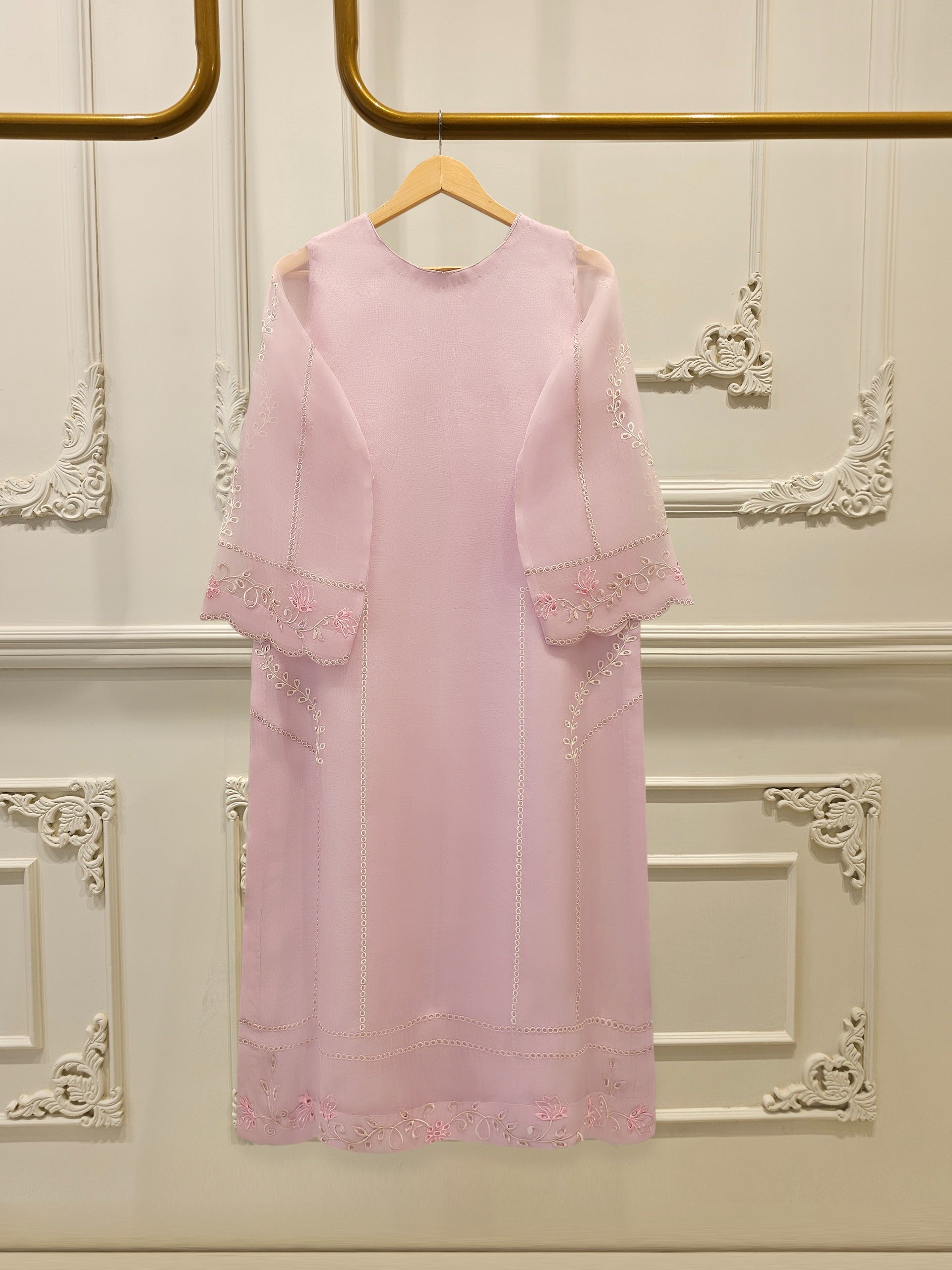 Elevate your style with baby pink embroidered organza straight shirt crafted with utmost care and attention to detail. The shirt features intricate embroidery on the front and sleeves, adding a touch of timeless charm.