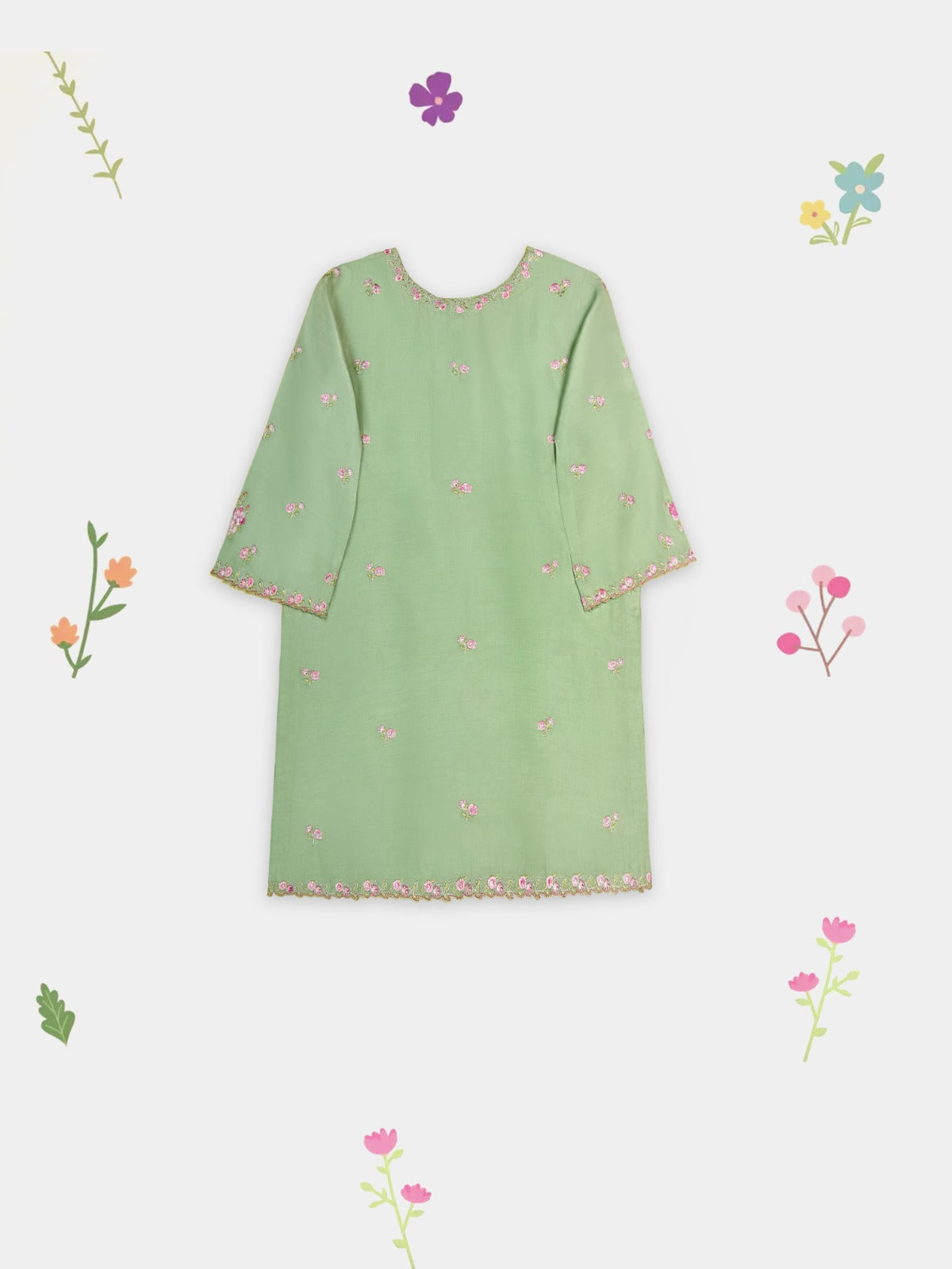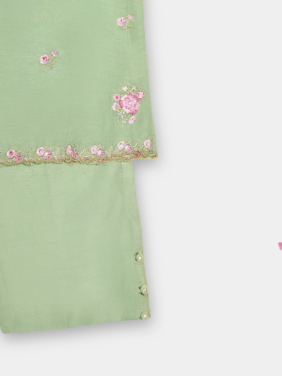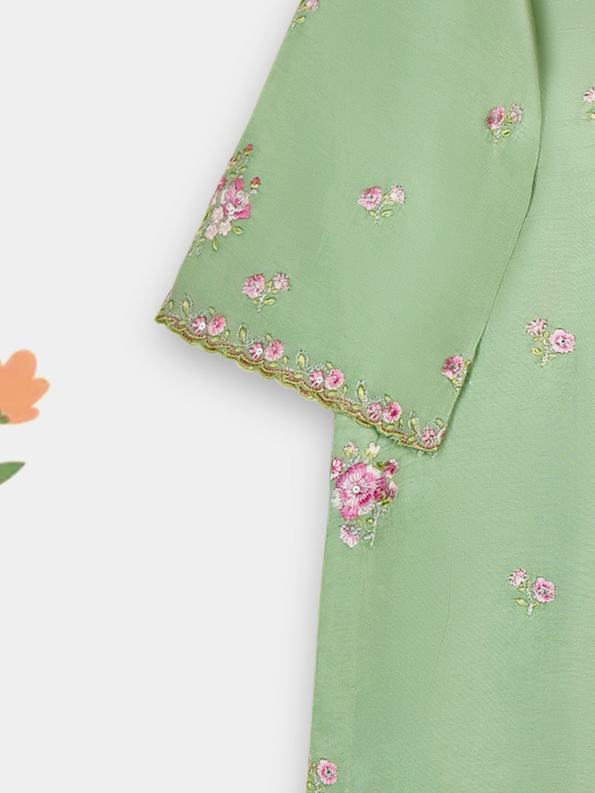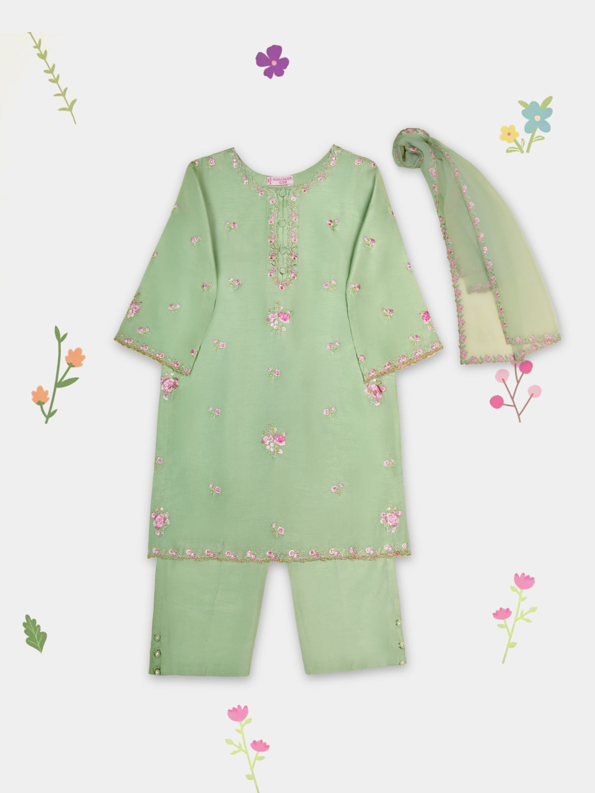 Elevate your little one's style with our off white , embroidered Koren silk shirt with pants and duppta