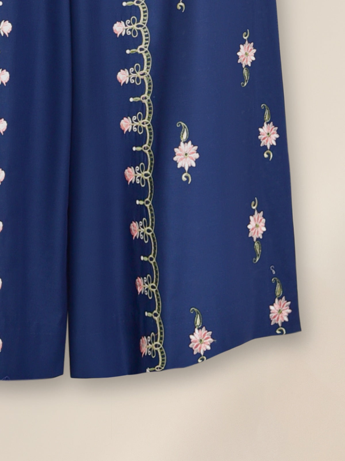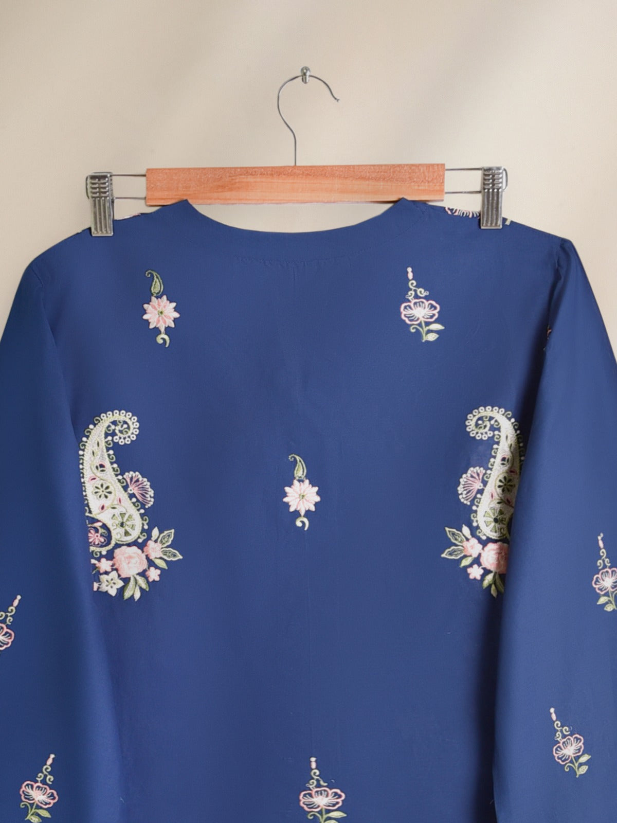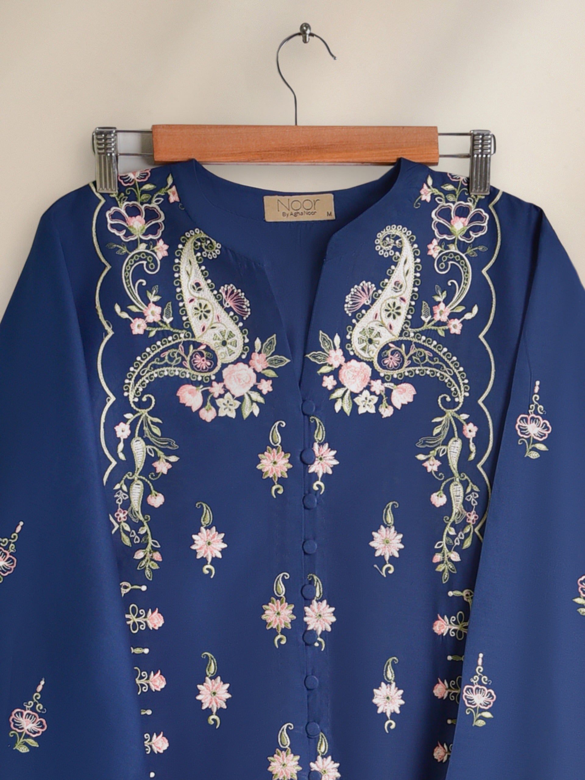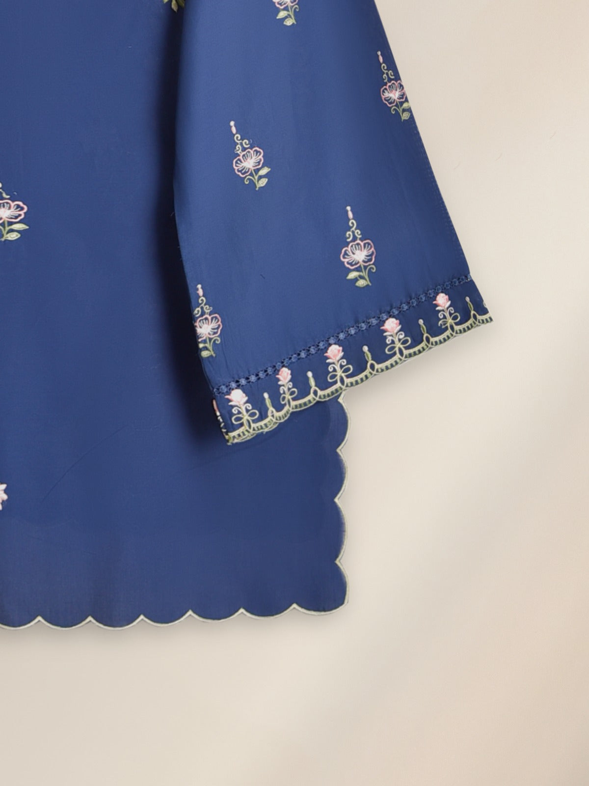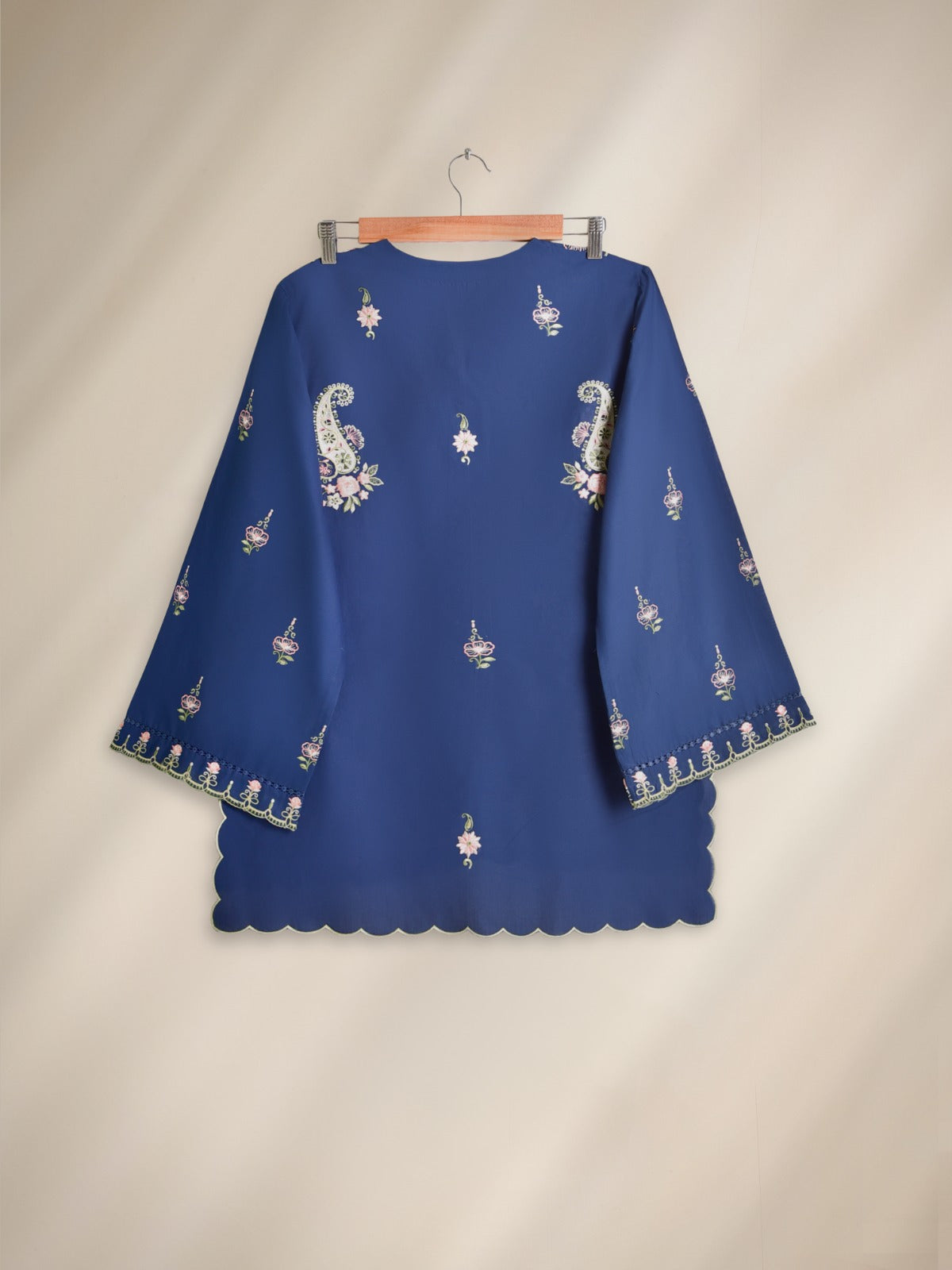 Elevate your wardrobe with this elegant blue embroidered shirt, beautifully detailed with floral patterns and scalloped edges. The soft fabric ensures comfort while the intricate embroidery on the sleeves and hemline adds a touch of sophistication. Perfect for casual gatherings or festive occasions, this stylish women’s shirt pairs effortlessly with trousers or culottes for a timeless look.