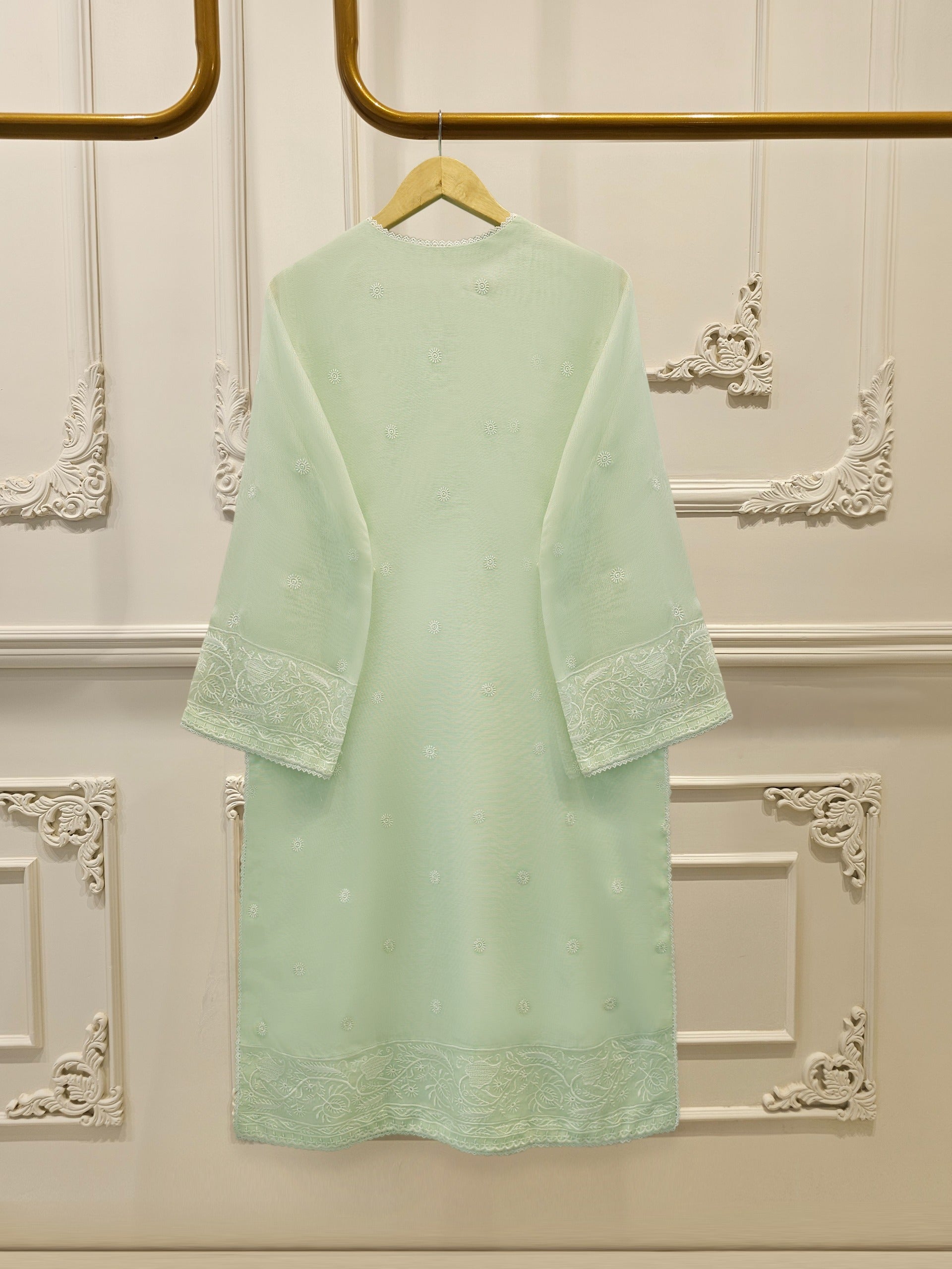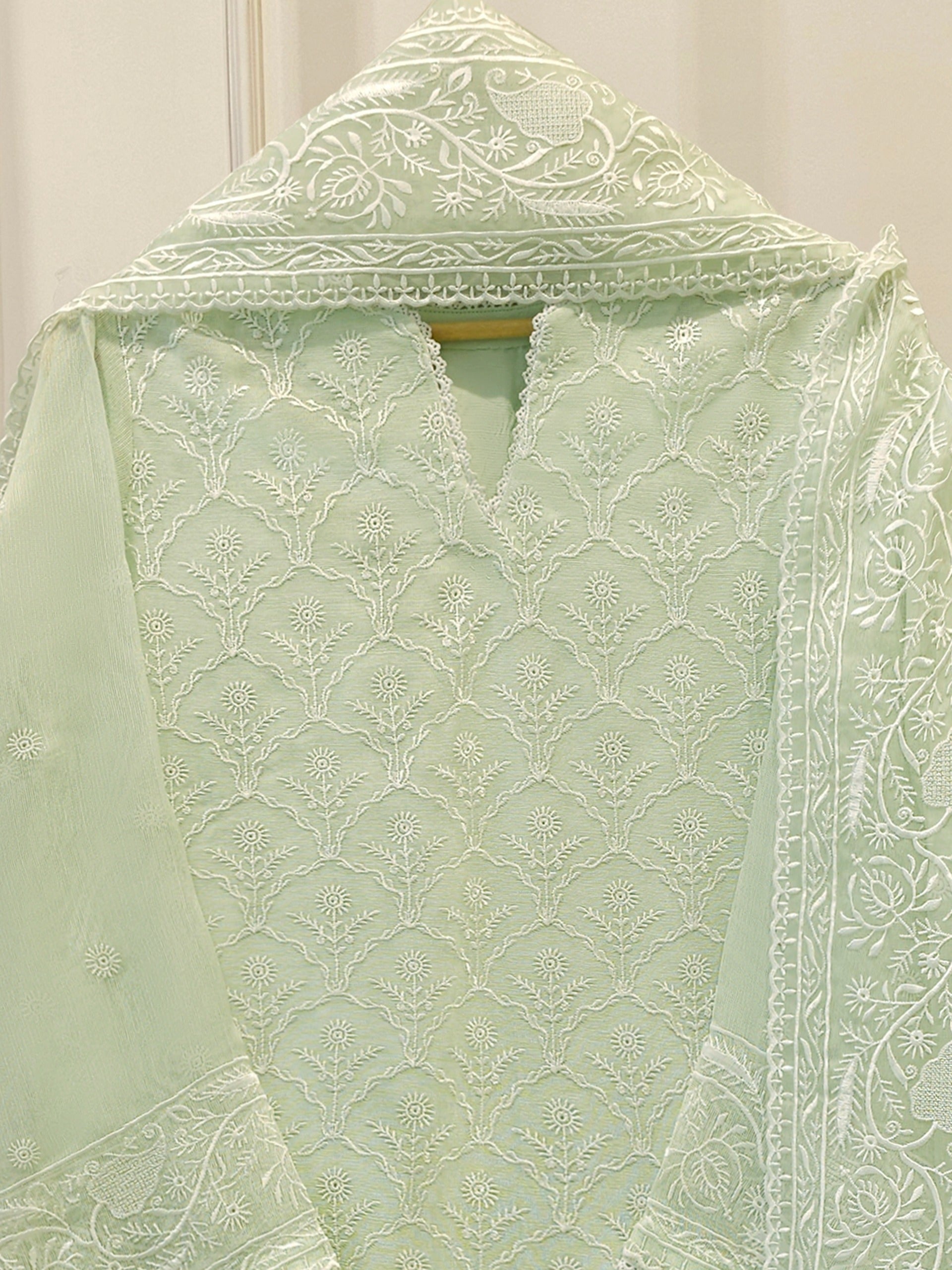 A three-piece cotton net unstitched suit is a graceful and breathable outfit choice, perfect for warm weather and semi-formal occasions. The set typically includes a cotton net shirt fabric, a matching trouser fabric, and  dupatta. The lightweight cotton net material offers a soft, airy feel while showcasing elegant embroidery or delicate patterns.