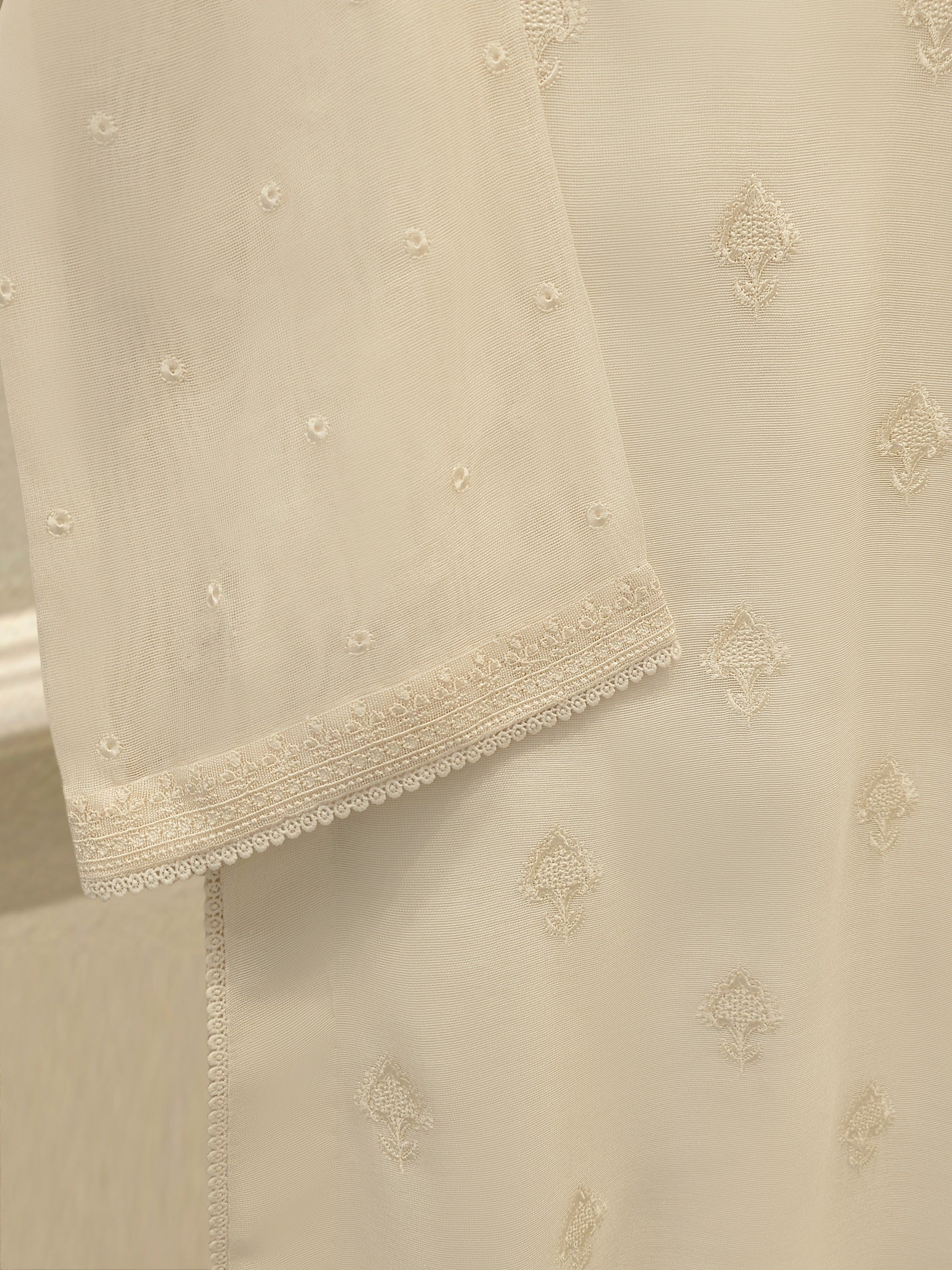A three-piece cotton net unstitched suit is a graceful and breathable outfit choice, perfect for warm weather and semi-formal occasions. The set typically includes a cotton net shirt fabric, a matching trouser fabric, and dupatta. The lightweight cotton net material offers a soft, airy feel while showcasing elegant embroidery or delicate patterns.